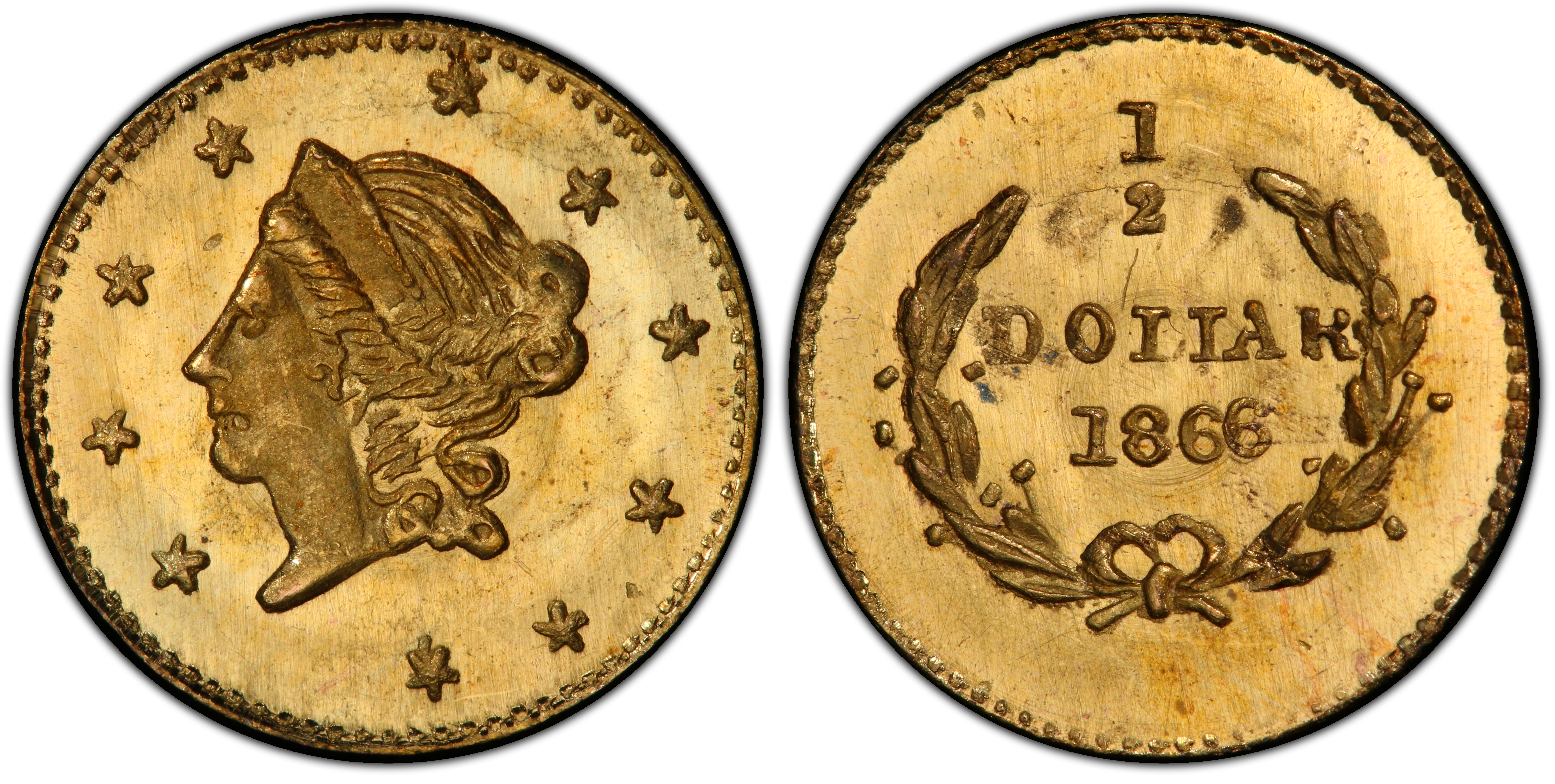 The 1866 BG-1006 50 Cents is a quintessential example of a 'Period Two' California Fractional Gold piece. By the mid-1860s, the acute shortage of small change that had plagued California during the initial Gold Rush years had largely been resolved by the output of the San Francisco Mint. The impetus for producing these minuscule gold coins shifted from commerce to curiosity. Enterprising jewelers and minting firms, such as Frontier and Company, recognized a burgeoning market for souvenirs and keepsakes that evoked the romance and adventure of the Gold Rush. These 'jeweler's issues,' as they are known, were often produced with less intrinsic gold value than their predecessors and were sold as novelties to tourists and collectors rather than being intended for daily transactions. A crucial characteristic of this period was the common practice of backdating. The Coinage Act of 1864 had made private coinage illegal, but enforcement by the Secret Service was not rigorous until the early 1880s. To circumvent the law and add a veneer of historical legitimacy, producers often used dates from earlier, more permissible years. Authoritative sources, such as the catalog for the Norweb Collection, confirm that although the BG-1006 is dated 1866, it was actually manufactured by Frontier and Company between 1870 and 1871. This places its creation firmly in the souvenir era, a period when the memory of the Gold Rush was a more potent economic force than the dust itself for these small-scale minters. The coin's extreme rarity today (R-7) suggests an exceptionally small original production, likely struck to order or as part of a very limited series for a specific clientele. Its survival is a testament to the collector sentiment that has preserved these tiny, historic echoes of California's foundational economic boom.
