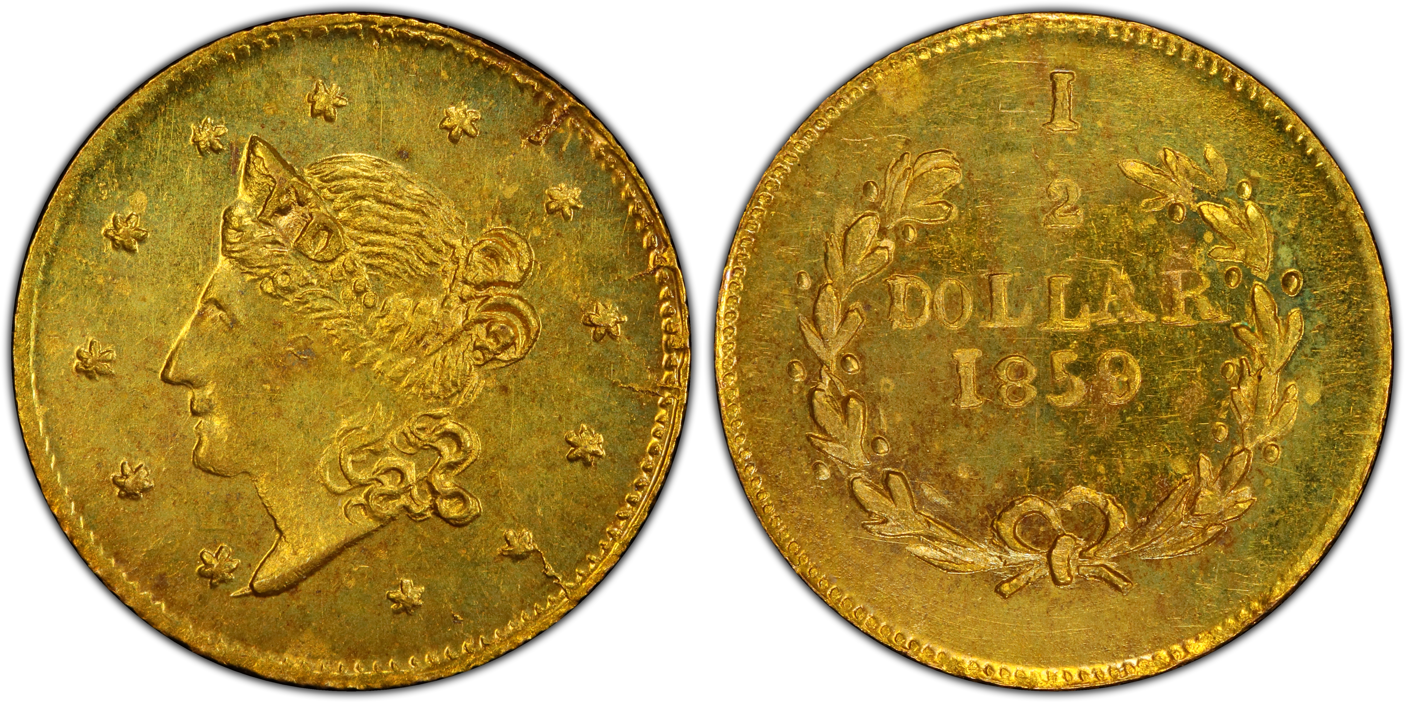 The 1859 BG-1001 50-cent piece emerges from the second major phase of California's private gold coinage, a period numismatists classify as 'Period Two' or the 'Jeweler's Issues' (circa 1859-1882). By the late 1850s, the acute shortage of small change that characterized the initial Gold Rush had been somewhat alleviated by the output of the U.S. Mint in San Francisco, which opened in 1854. However, a different market had developed. The tiny, intricate gold coins that were once a commercial necessity had become popular keepsakes and souvenirs of the California adventure. Jewelers, many of French origin, stepped in to meet this demand, producing a wide variety of charming but often significantly underweight pieces. Frontier, Deviercy & Co. was one such prominent firm of San Francisco jewelers. Their work, like that of their contemporaries, was not primarily intended to circulate as money, but rather to be sold as novelties to tourists and locals alike. These 'jeweler's issues' are distinct from the earlier 'Period One' coins (1852-1856), which were generally of more honest weight and struck with the genuine intent of filling a commercial void. The production of BG-1001 coincides with a California that was maturing; the wild frontier was giving way to a more established society, yet the romance of gold was a powerful marketing tool. These pieces were often struck using the 'hammer method,' a manual process where dies were struck with a sledgehammer, resulting in inconsistent strike quality. The passage of the Coinage Act of 1864 would eventually make all private coinage illegal, but enforcement was lax until the 1880s, allowing these fascinating 'suppressed issues' to be produced for over two decades. The BG-1001 is a quintessential example of this later period—a beautifully crafted but intrinsically deficient memento of an era, struck by jewelers capitalizing on the legend of the Gold Rush.