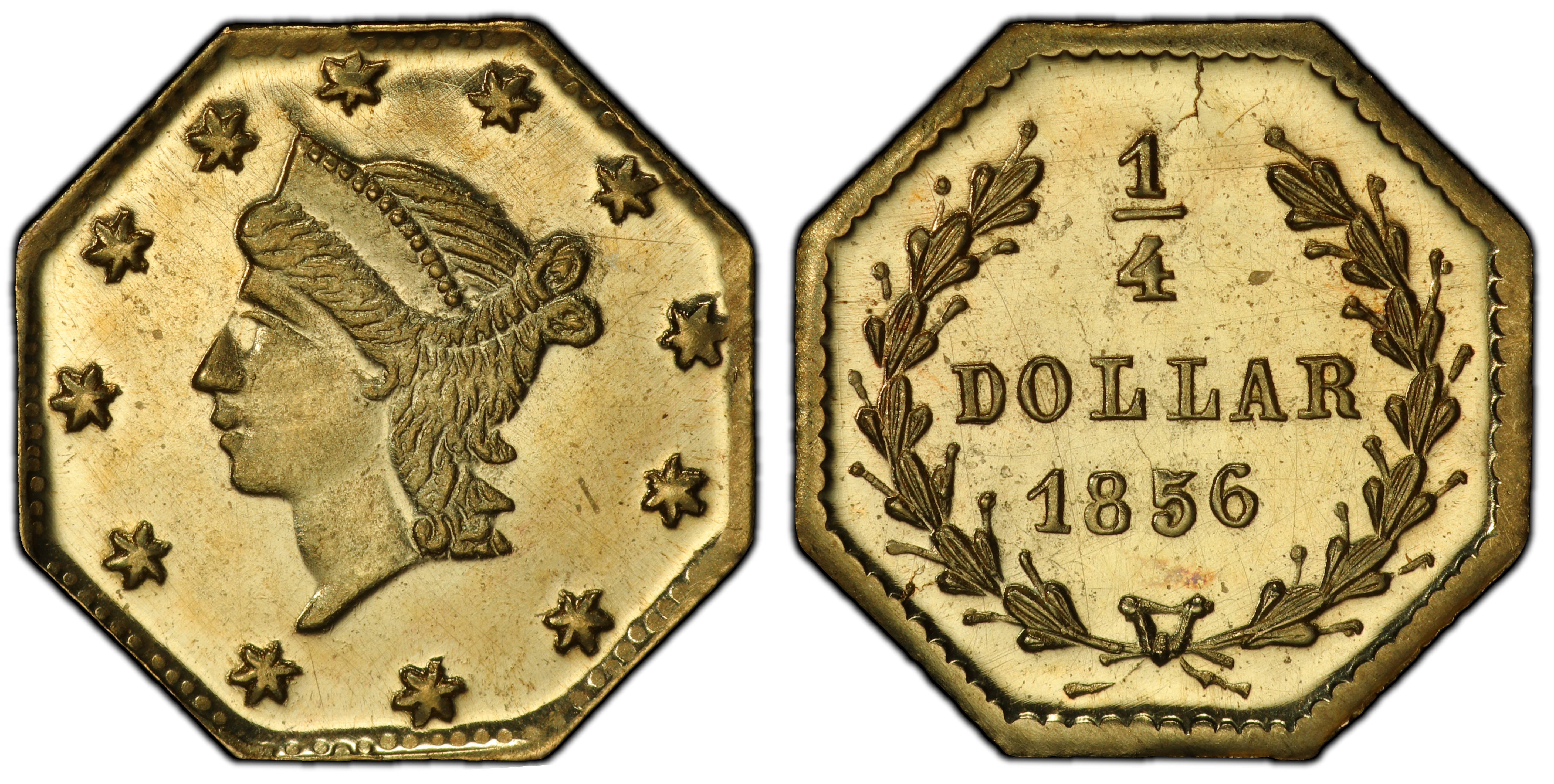 The 1856 BG-111 octagonal quarter dollar is a quintessential artifact of 'Period One' of California's private gold coinage era. Born from the acute economic necessities of the Gold Rush, these minuscule coins addressed a severe shortage of small-denomination currency for everyday transactions. Following the massive influx of population after the 1848 gold discovery, the region was awash in gold dust and large denomination coins, but lacked the federal silver coinage needed to make change for simple purchases. A pinch of gold dust for a drink or a loaf of bread was an imprecise and often contentious method of payment. Enterprising jewelers and metalsmiths in San Francisco stepped into this monetary vacuum, creating their own fractional gold coins in 25 cent, 50 cent, and one dollar denominations. These 'Period One' issues (1852-1856) were generally intended for actual circulation and were modeled, albeit crudely, on the designs of official U.S. gold coinage. The production process was rudimentary, often involving hand-cut dies and a hammer strike, leading to significant variation in strike quality. While accepted in local commerce out of necessity, they were consistently underweight for their face value, a fact that did not go unnoticed. Banks generally refused them. As the U.S. Mint in San Francisco ramped up production of official coinage in the mid-1850s, the utility of these private issues waned. They quickly transitioned from being essential pocket change to popular souvenirs, easily mailed back East as a memento of the California adventure. The BG-111 variety, with its distinctive octagonal shape and Liberty head design, is a direct legacy of this entrepreneurial, chaotic, and uniquely American period of monetary improvisation.