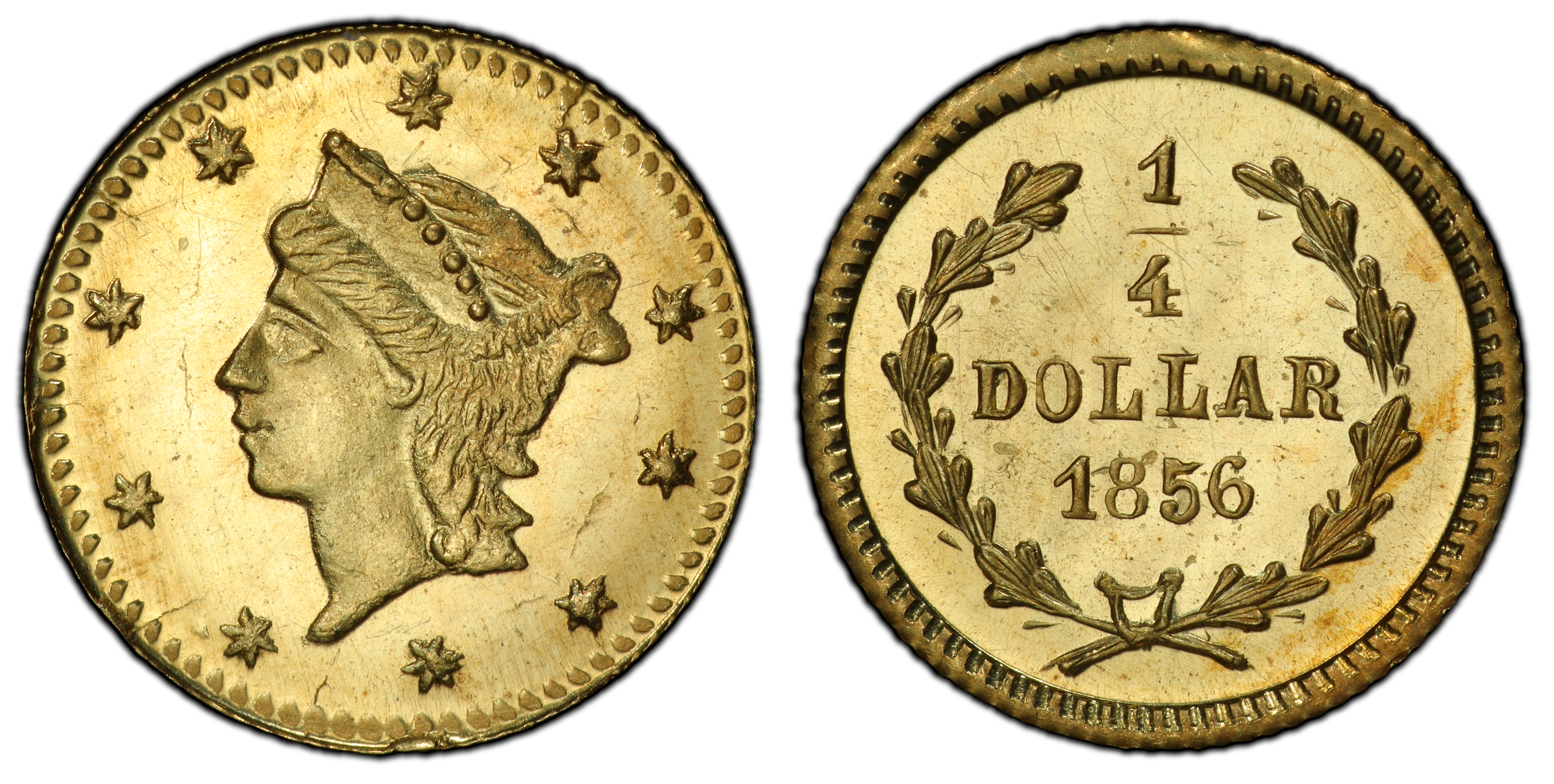 Obverse Inscription Reverse DescriptionThe denomination '1/4 DOLLAR' and the date '1856' are enclosed within a simple wreath composed of two branches tied together at the bottom with a bow.