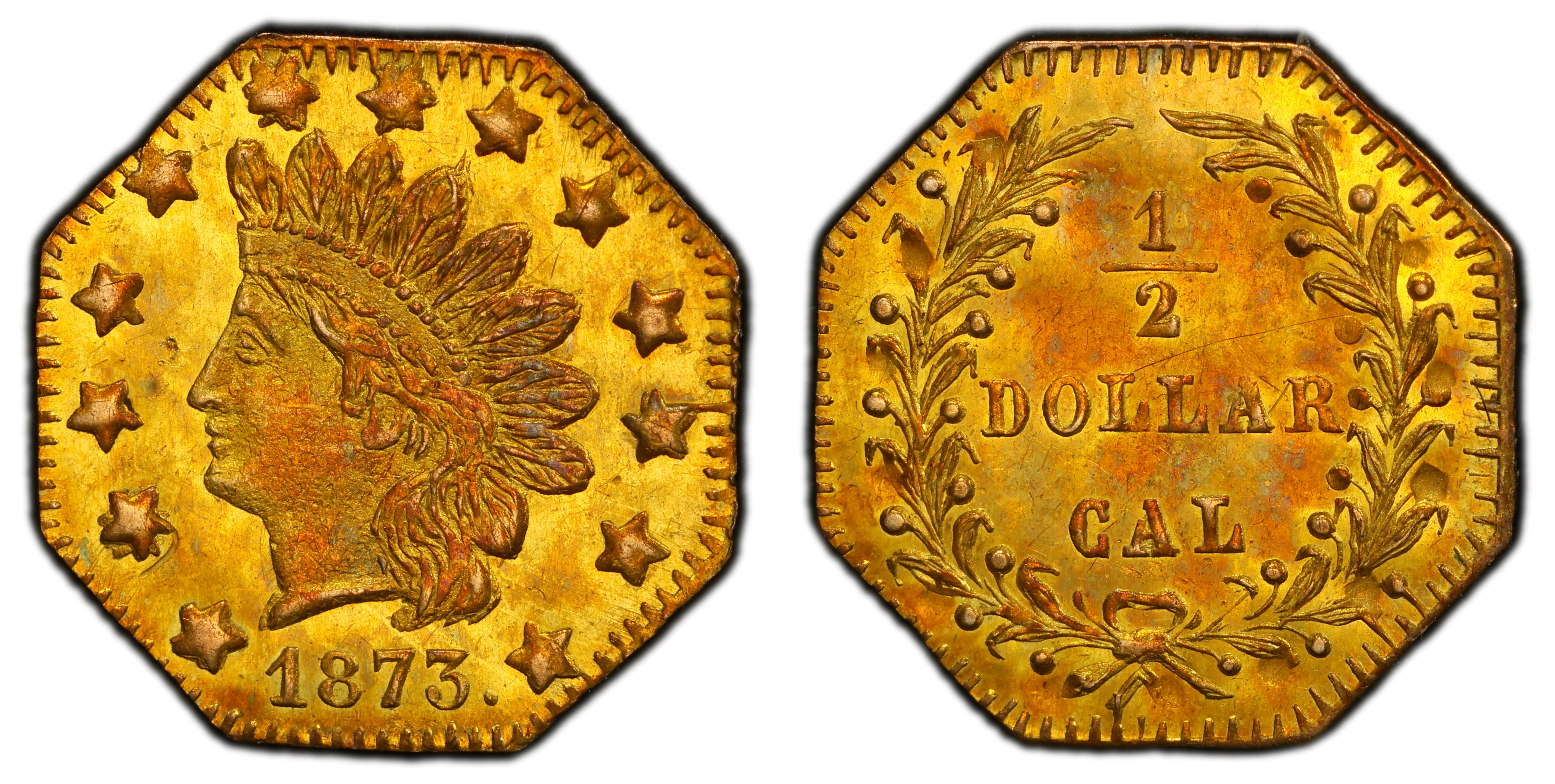 The 1873 BG-942 50 Cents token emerges from the second period (1858-1882) of California Fractional Gold production, a fascinating and complex era of private minting long after the initial chaos of the Gold Rush had subsided. Unlike the 'Period One' pieces, which were largely struck to alleviate a severe shortage of small denomination coinage for commerce, the later issues, including this one, were primarily created to satisfy a burgeoning market for souvenirs and collectibles. The great excitement of the Gold Rush had cemented California in the national imagination, and jewelers and private minters capitalized on this by producing these miniature gold pieces for tourists, merchants, and collectors. Gaetano F. Lanza, a manufacturing jeweler in San Francisco, is the most likely producer of the dies used for this variety. His work is characteristic of the period's style, often featuring Indian Head or Liberty motifs popular on contemporary federal coinage. These small-denomination gold pieces were sold as keepsakes and were not intended to function as circulating currency, a fact underscored by the Coinage Act of 1864 which criminalized private coinage. However, production of souvenir 'charms' and tokens continued, skirting the law by omitting the word 'DOLLAR' or 'CENTS'. The BG-942 variety, with its classic Indian Head design, was a popular motif. These pieces were struck in limited quantities and sold through local jewelers and merchants in San Francisco. Their survival rate is low due to their small size and the fact that many were incorporated into jewelry, suffering damage. Today, they are highly prized by specialists for their intricate designs, historical connection to the post-Gold Rush era of California, and their specific die characteristics cataloged meticulously by Breen and Gillio.