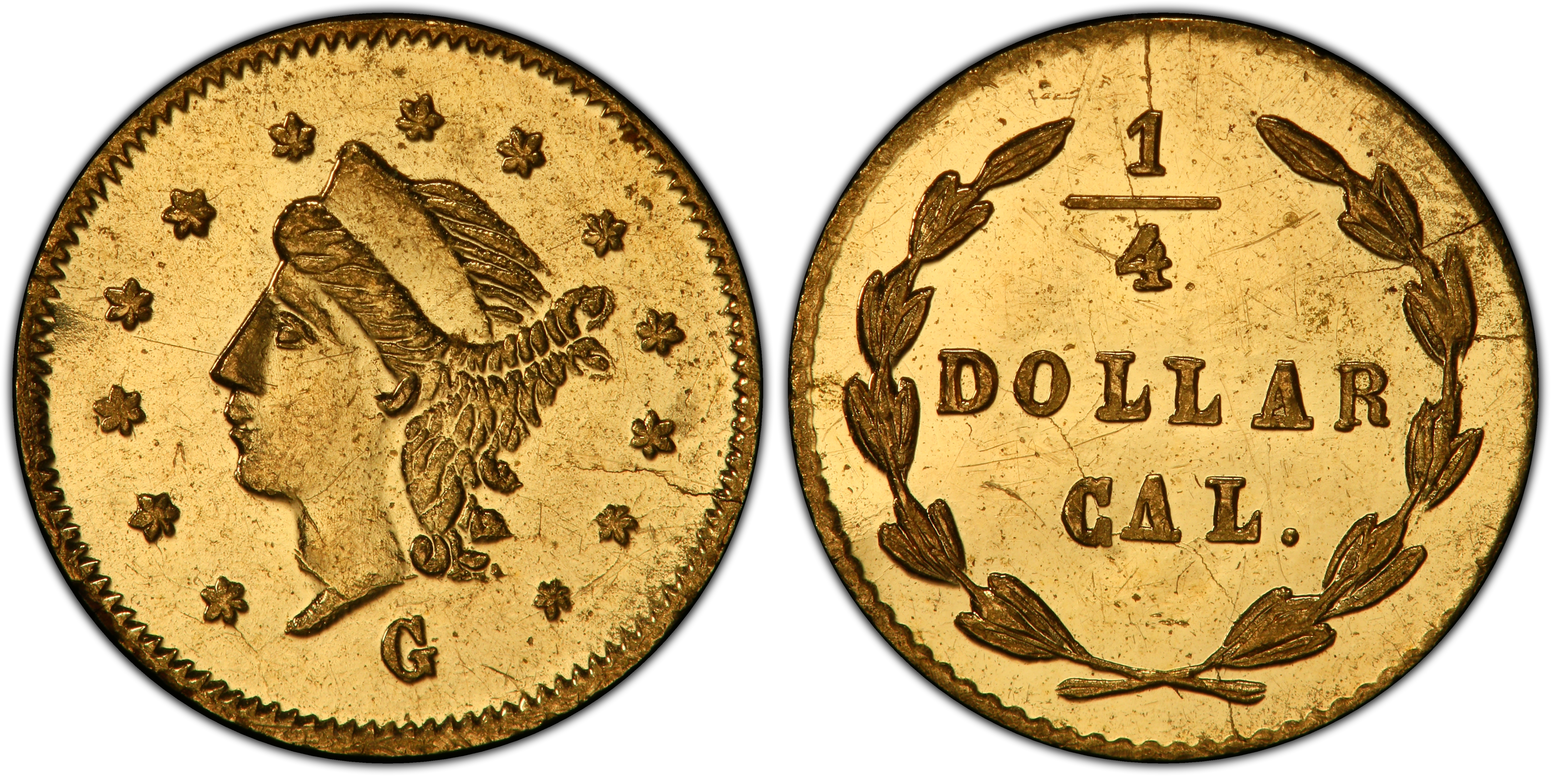 Obverse Inscription Reverse DescriptionA simple wreath surrounds the denomination '1/4'. The letter 'G' for the minter is not present on this variety.