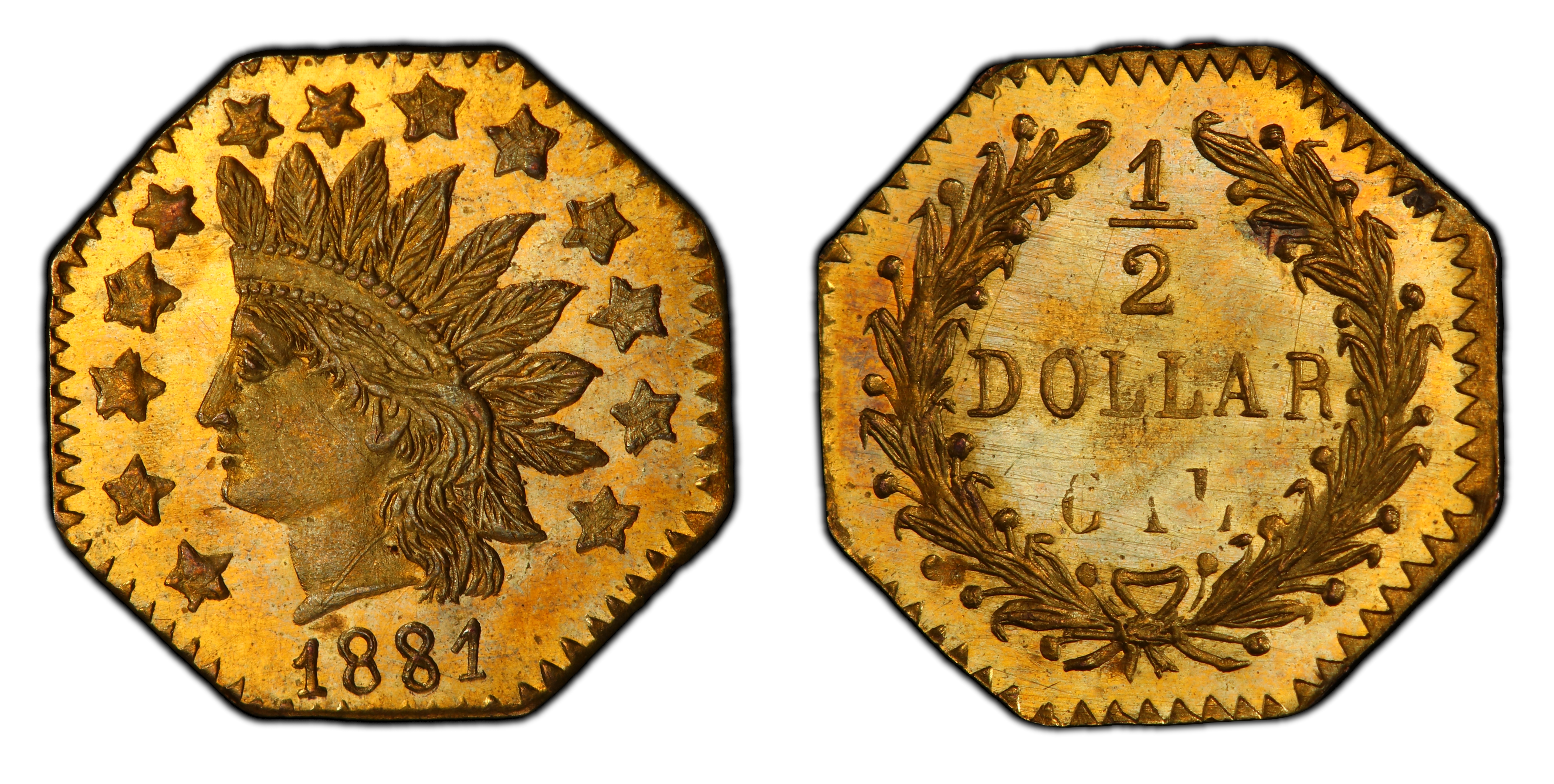 The 1881 Octagonal 50 Cents, cataloged as BG-957, is a fascinating artifact from the twilight of America's private coinage era. It belongs to what numismatists classify as 'Period Two' (1859-1882) of California Fractional Gold production. Unlike the earlier 'Period One' issues, which were struck out of genuine necessity to alleviate a severe shortage of small change during the initial Gold Rush, the pieces from this later period served a different purpose. By the 1880s, the United States Mint was supplying adequate coinage to California, and the desperate need for local, private issues had subsided. The Coinage Act of 1864 had officially prohibited private minting, but the law was not strictly enforced in the West until 1883. In this legal gray area, San Francisco jewelers and artisans continued to strike these miniature gold coins, catering less to commerce and more to the burgeoning souvenir and jewelry trade. These pieces were sold as keepsakes to tourists, given as gifts, and incorporated into rings, cufflinks, and brooches. The BG-957 is a product of this environment. It was not intended to be a workhorse of daily transactions but rather a memento of the California Gold Rush, which by then had passed into the realm of legend. Struck with an Indian Head motif popular in the late 19th century, its production reflects a shift from utilitarian currency to numismatic novelty. Despite their semi-official status, these later issues were produced with a high degree of craftsmanship, continuing the tradition of their predecessors. Their existence today provides a tangible link to a period of immense economic and social transformation in the American West, representing the final chapter of a uniquely American coinage phenomenon before federal authority consolidated control over all minting operations.