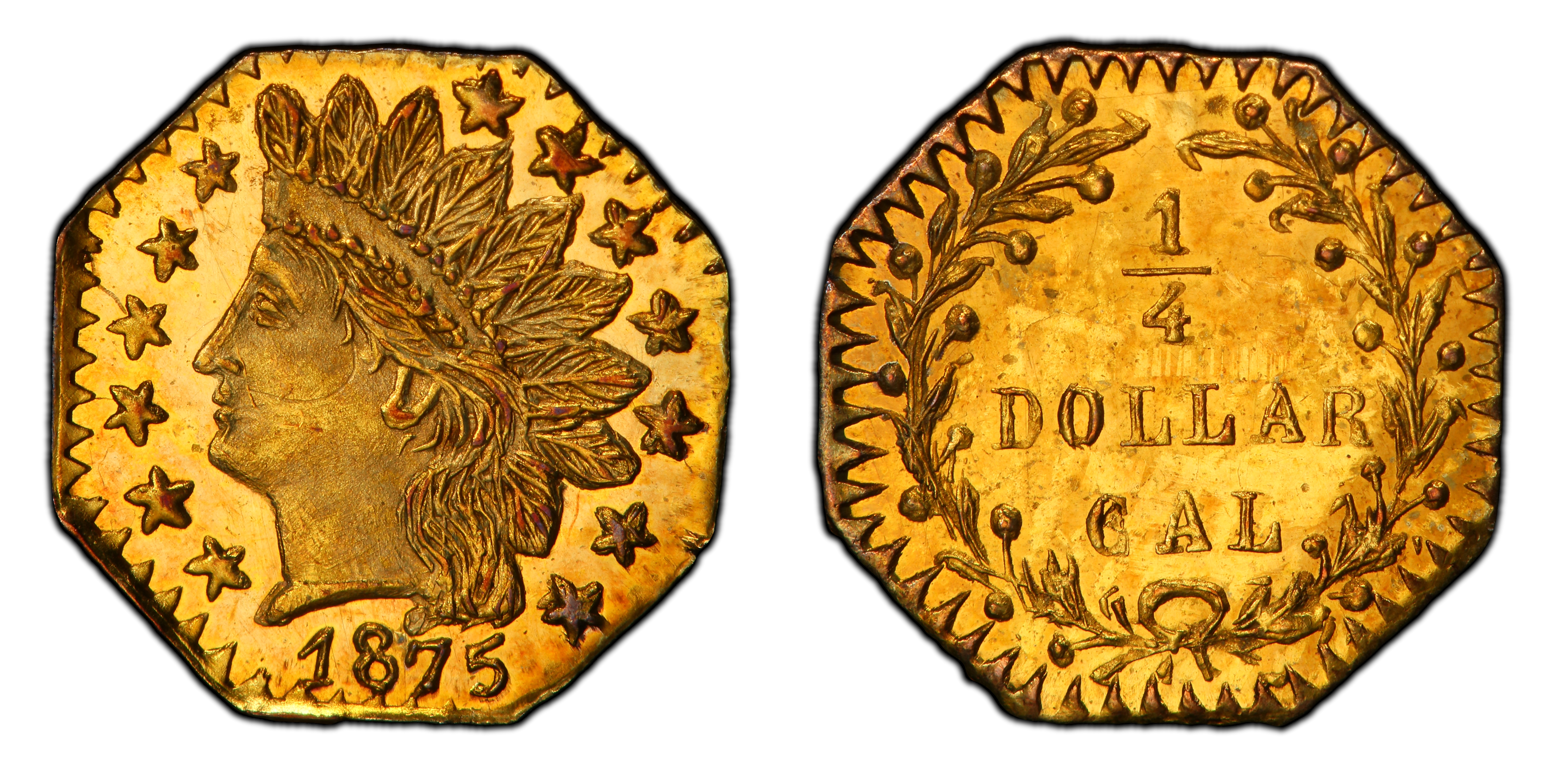 The 1875 BG-798 quarter dollar emerges from the second period (1858-1882) of California Fractional Gold production, a fascinating chapter in American numismatics that transitioned from necessity to novelty. The initial period (1852-1857) saw these tiny gold pieces struck to alleviate a severe shortage of small-denomination coinage during the height of the Gold Rush. However, by the mid-1850s, the new San Francisco Mint was in full operation, pumping federal silver and gold coins into the local economy and largely resolving the 'small change' crisis. This should have rendered the private fractionals obsolete. Instead, a new market emerged. Jewelers, many of French origin, recognized the allure of these miniature gold coins and continued to produce them, not primarily for circulation, but as souvenirs, keepsakes, and jewelry items for a populace still captivated by the romance of the Gold Rush. These 'Period Two' issues, often called 'jeweler's pieces,' were struck with a commercial rather than a monetary purpose. The Coinage Act of 1864 had explicitly outlawed private coinage, but enforcement in the far-flung West was lax, allowing production to flourish throughout the 1870s. The makers of BG-798 operated in this legally gray environment, creating pieces that were intentionally underweight for their face value, maximizing profit while selling them as charming mementos. The Indian Head motif, popularized by the federal cent of 1859, was a common design choice, tapping into the romanticized imagery of the American West. These pieces were often sold to tourists and locals alike, sometimes holed or mounted for use in necklaces, bracelets, or watch fobs. It wasn't until a crackdown by the U.S. Secret Service, concerned about potential for fraud, that production was finally suppressed by 1883, ending the era of this unique and popular private coinage.