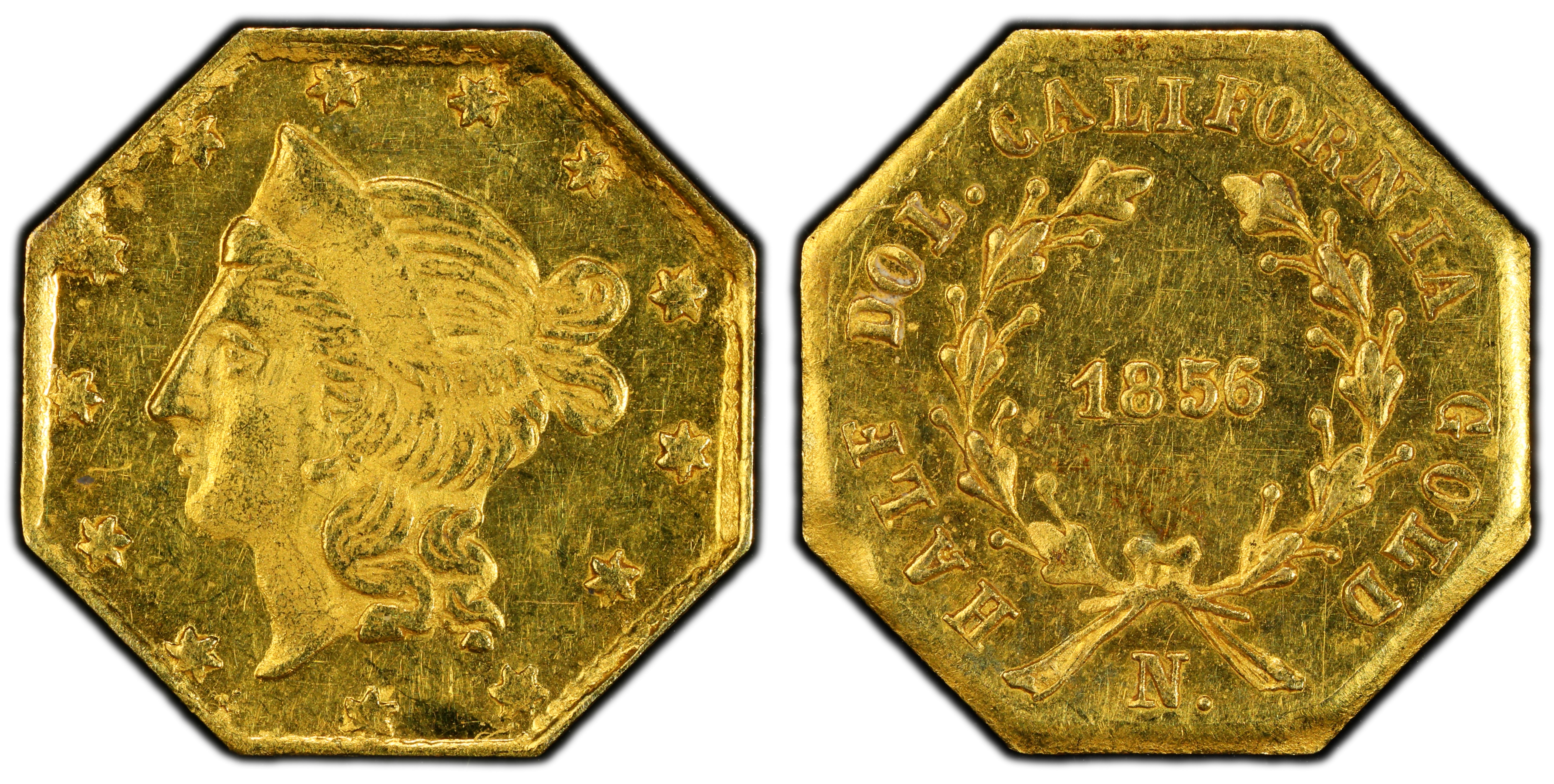 The story of the BG-915A is a fascinating microcosm of the evolution of California Fractional Gold, bridging the transition from utilitarian currency to collectible souvenir. Its origins lie in the original BG-311 half dollar, a 'Period One' (1852-1857) issue struck to alleviate a critical shortage of small-denomination coinage during the zenith of the California Gold Rush. In the chaotic, gold-dust-fueled economy of San Francisco, transactions for everyday goods were cumbersome, and the federal government's supply of coins was woefully inadequate. Private minters and jewelers, such as the prolific Antoine Louis Nouizillet, stepped into this void, producing fractional gold pieces that, while often underweight, served as an essential medium of exchange. The original 1856-dated BG-311 half dollars were part of this wave of necessary, privately-issued money. However, by the late 1850s, the San Francisco Mint was in full production, and the pressing need for private issues waned. The character of fractional gold began to change. Around 1859-1860, Robert B. Gray & Co., another San Francisco jeweler, acquired the business of Antoine Nouizillet, including his stock of dies, hubs, and punches. Gray, recognizing a different kind of market, began using these older, dated dies to produce restrikes aimed at the growing national fascination with the Wild West and the Gold Rush. These 'Period Two' (1858-1882) pieces were not intended for the grimy pouches of miners but for the cabinets of collectors and the pockets of tourists as souvenirs. The BG-915A is the product of this second phase. Struck by Gray & Co. around 1860 from Nouizillet's original 1856-dated BG-311 dies, it is a numismatic ghost—a coin bearing a date from the height of the circulation era but produced years later for an entirely different purpose. This is further evidenced by its physical characteristics; unlike the solid gold originals, research indicates BG-915A was struck on debased or gold-plated planchets, a clear sign it was meant as a memento rather than a monetary instrument. Its extreme rarity today suggests it was produced in very small numbers, perhaps only as a trial or to satisfy a few specific requests, securing its status as one of the most elusive and intriguing varieties in the entire series.