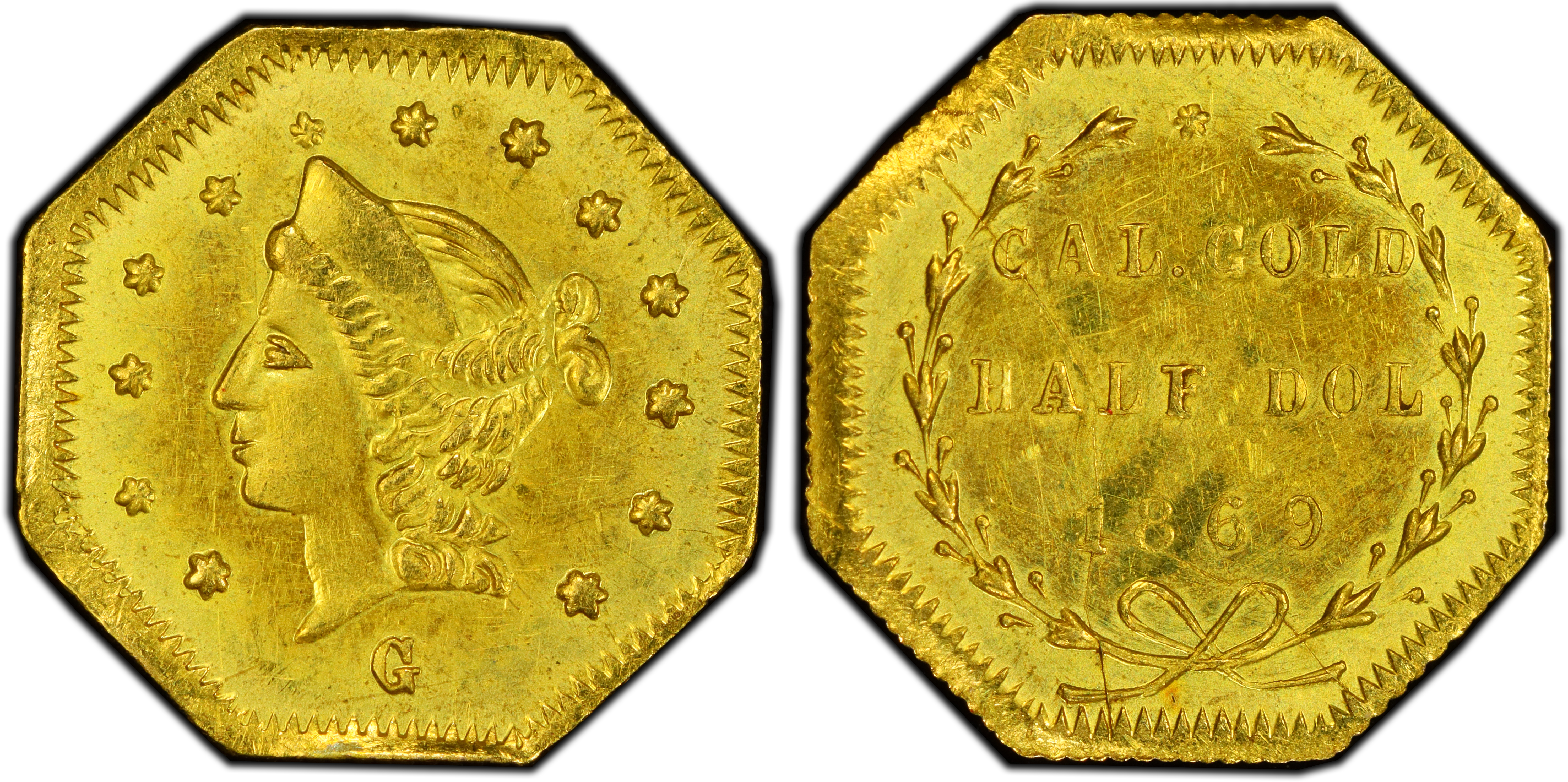 Obverse DescriptionAn octagonal planchet featuring a crudely rendered bust of Liberty facing left, her hair tied in a bun. The portrait is surrounded by 13 stars. Below the bust is the date, 1869, and a small but distinct letter 'G' is located in the field, typically below the chin and to the right of the date.