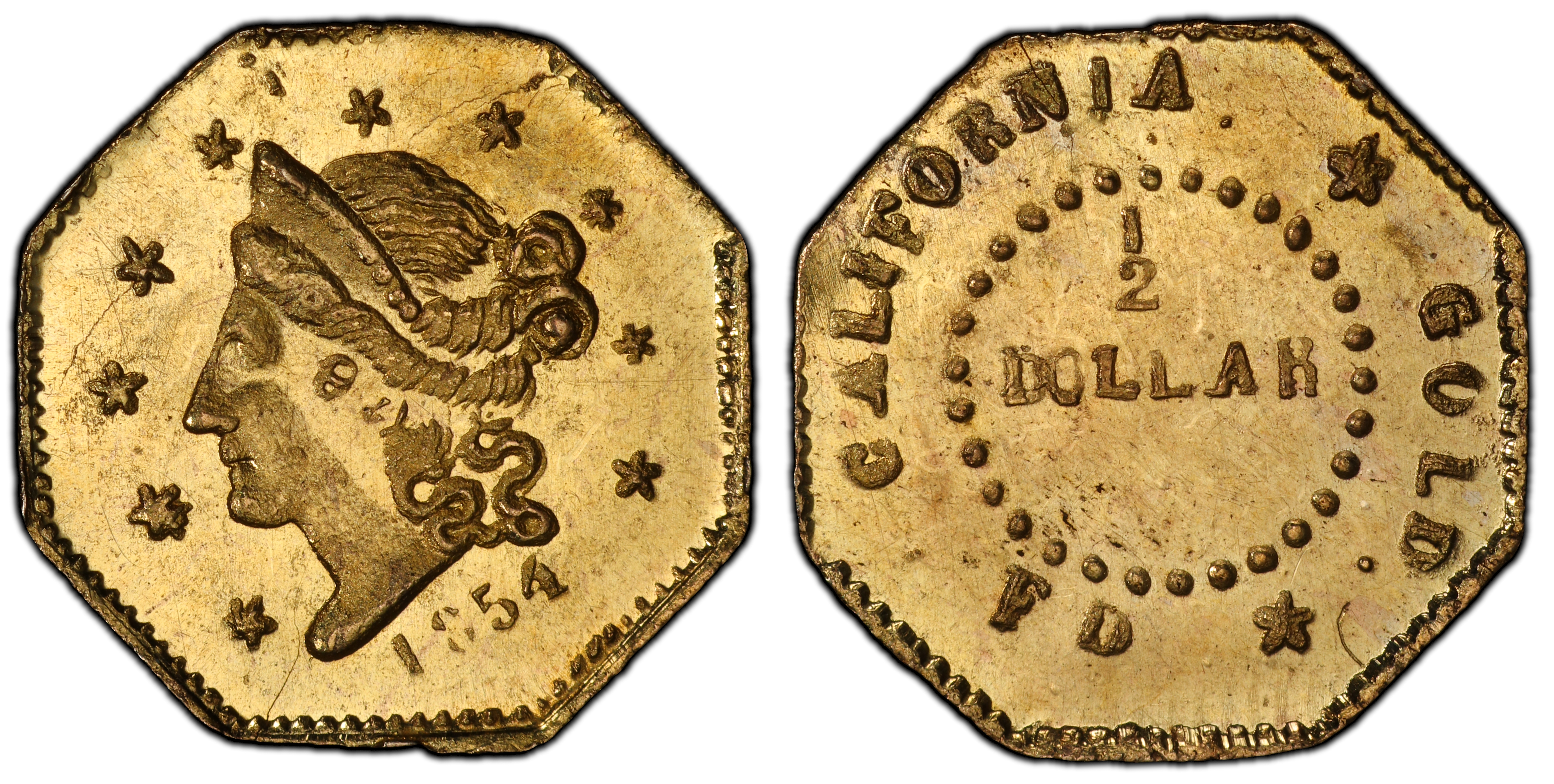 The 1854 BG-306 octagonal half dollar is a quintessential artifact from the first period (1852-1857) of California Fractional Gold production, a fascinating and complex chapter in American numismatics. Born from the acute shortage of small denomination coinage in the aftermath of the 1848 gold discovery, these miniature gold pieces attempted to fill a critical void in daily commerce. Following the massive influx of 'Forty-Niners,' California was awash in gold dust and large private and federal gold coins, but lacked the subsidiary silver coinage necessary for minor transactions. Gold dust was an imprecise and cumbersome medium of exchange, leading jewelers, assayers, and businessmen to take matters into their own hands. Beginning in 1852, these private minters began striking quarter, half, and one-dollar gold pieces. The BG-306 was produced by Frontier, Deviercy & Co., San Francisco-based jewelers and watchmakers, active during this vibrant era. These 'Period One' issues were genuinely intended to circulate, though their acceptance was not universal and their intrinsic value was often significantly less than their face value. As early as 1853, their novelty and small size made them popular as souvenirs to be sent back East, a trend that quickly overtook their commercial function. The underweight nature of most fractional gold was a constant source of controversy, but in the chaotic and isolated economy of Gold Rush California, they served a purpose, however flawed. The Coinage Act of 1864 would eventually outlaw private coinage, but the law was not strictly enforced in the West until 1883, leading to later periods of production that were almost exclusively for souvenir purposes. The BG-306, as a product of 1854, stands as a genuine relic of the time when these pieces were an integral, if unofficial, part of California's currency.