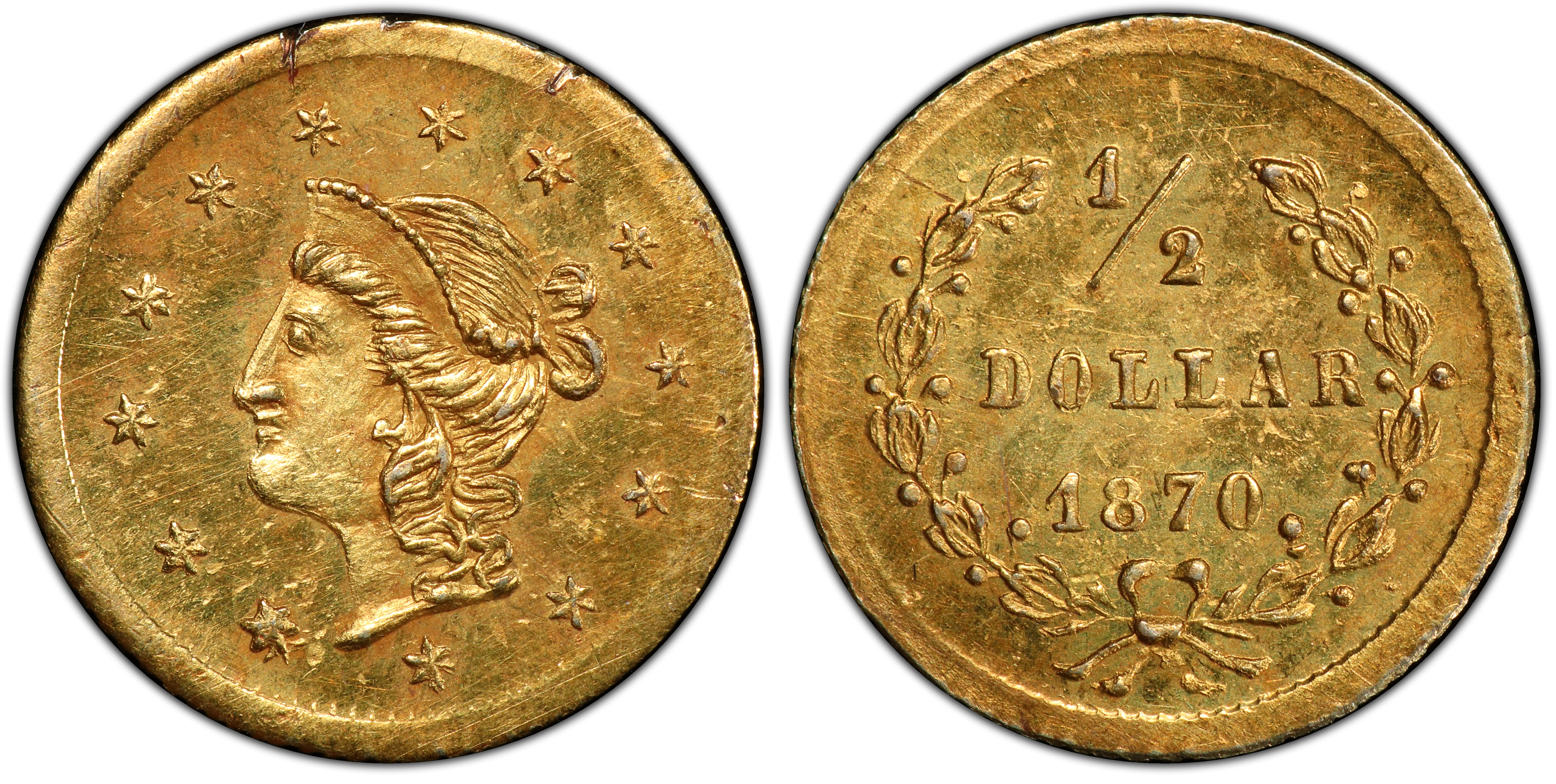 The 1870 BG-1047 50-cent piece emerges from the second major phase of California's private gold coinage, a period numismatists designate as 'Period Two' (1859-1882). By this time, the acute shortage of small change that characterized the initial Gold Rush boom had been somewhat alleviated by the output of the San Francisco Mint, which opened in 1854. However, the public's fascination with gold, coupled with a lingering need for fractional currency in localized commerce, sustained a market for these diminutive gold pieces. Unlike the 'Period One' issues, which were struck with the primary intent of serving as circulating money, Period Two coins were largely the work of jewelers and artisans. They were produced under a legally gray cloud following the Coinage Act of 1864, which prohibited private coinage. Enforcement was lax until the early 1880s, allowing these 'jeweler's issues' to flourish. They served a dual purpose: as souvenirs for tourists and returning '49ers' wishing to send a piece of the Golden State home, and as a convenient, if underweight, medium of exchange in small transactions. The BG-1047, often nicknamed the 'Goofy Head' for its crude, almost cartoonish rendering of Liberty, is emblematic of this era. Struck by an anonymous maker, it was likely produced in a small back-alley workshop in San Francisco. The light weight and variable fineness of these pieces were a quiet acknowledgment of their semi-illicit status; they contained enough gold to be desirable, but not so much that their face value was met according to federal standards. Their existence speaks to a unique economic environment where the allure of gold and the practicality of commerce intersected, creating a fascinating and complex chapter in American numismatics. Their eventual suppression by the Secret Service in the early 1880s marked the end of private coinage in the United States, cementing their status as historical relics of a bygone era.