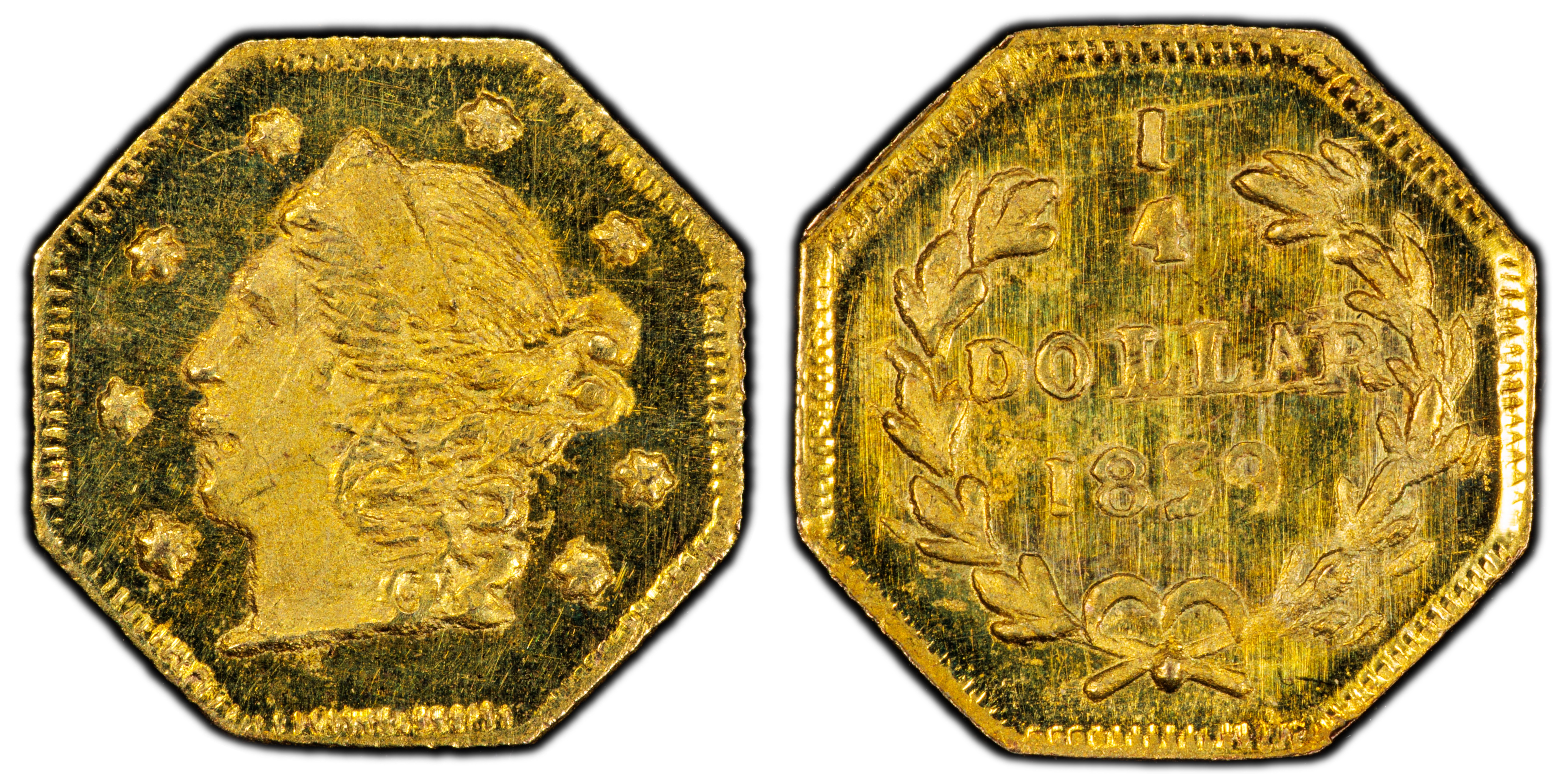 Obverse DescriptionA Liberty Head, facing left, with hair tied in a bun. The portrait is somewhat crude, typical of the jeweler's issues. The head is surrounded by 13 six-pointed stars, often weakly struck. The date, 1859, appears below the bust.