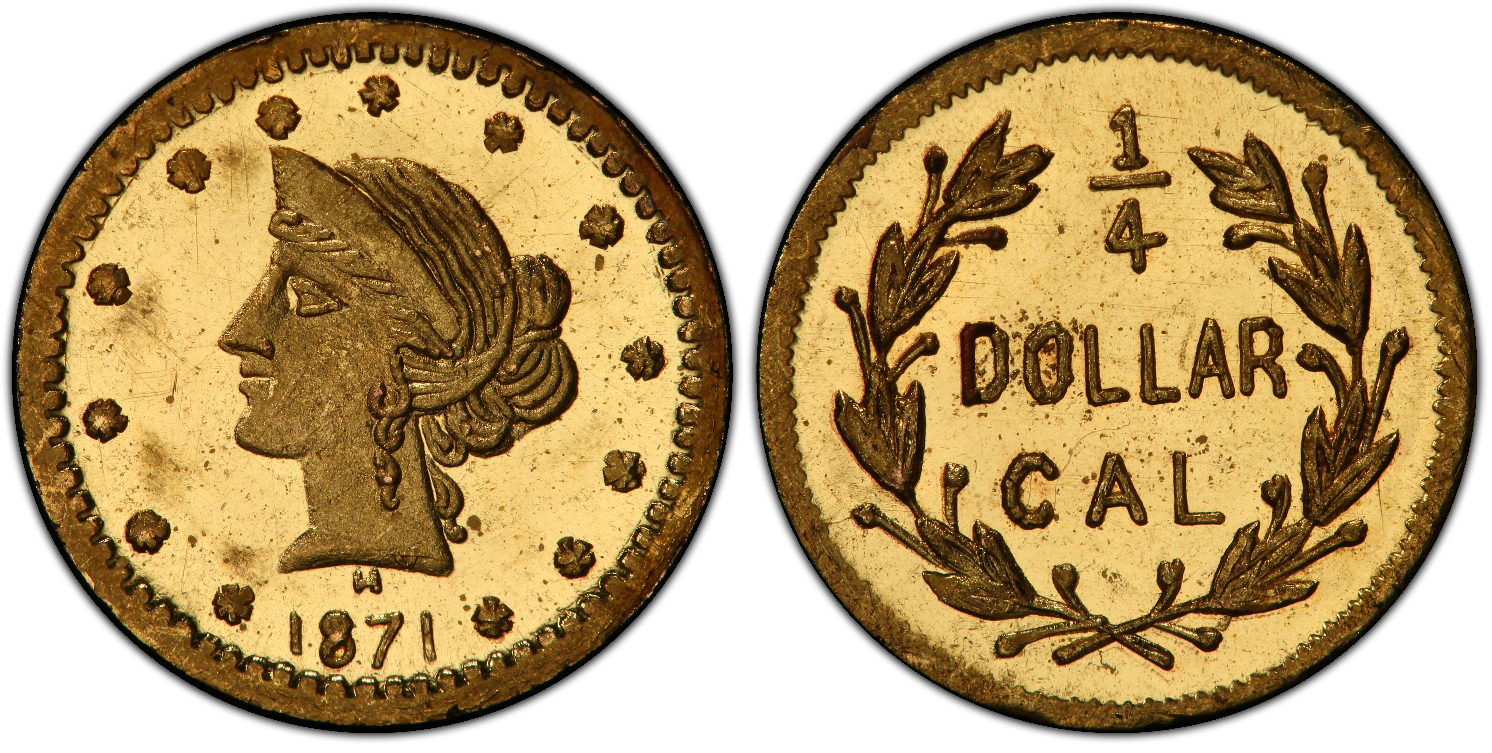 Key VarietiesThe BG-861 itself is a specific die variety. Within the broader 1871 25 Cents series, there are numerous other BG-numbered varieties with differences in obverse and reverse designs, star counts, and lettering. No special collector restrikes from the original dies are known; however, the entire field of California Fractional Gold is plagued by modern, unofficial replicas, which are typically gold-plated brass and often feature designs never used in the 19th century, such as bears.
