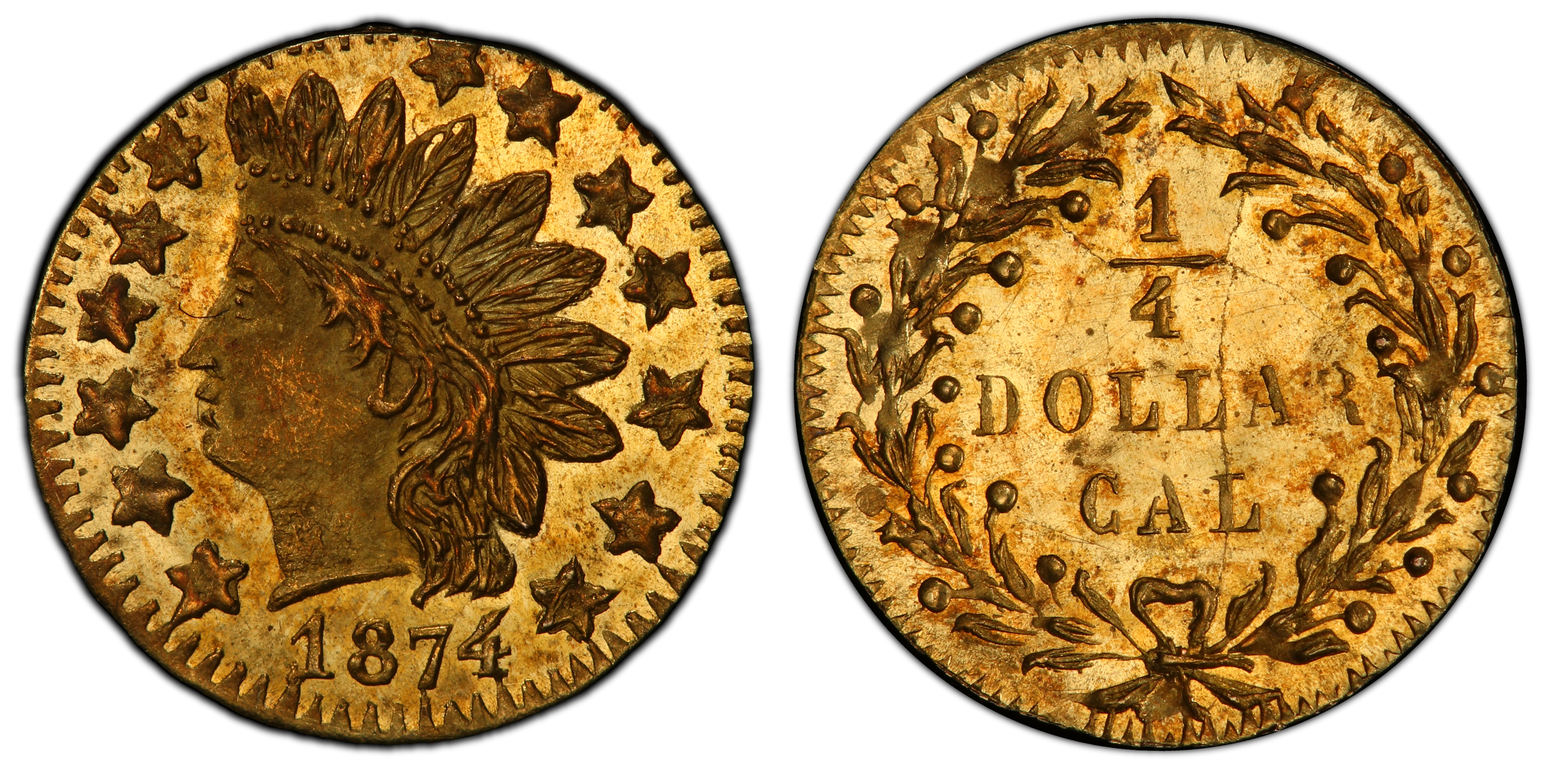 The 1874 G25C BG-876 is a quintessential example of 'Period Two' California Fractional Gold. By the mid-1870s, the initial frenzy of the Gold Rush had subsided, but California's economy remained dynamic and distinct from the rest of the nation. A chronic shortage of small-denomination federal coinage persisted on the West Coast, a problem that had plagued the region since the 1850s. While the San Francisco Mint produced federal gold and silver, the smallest circulating coins, particularly for transactions under a dollar, were scarce. This void created a sustained market for privately issued small gold pieces. Unlike the 'Period One' issues (1852-1857), which were intended to and often did circulate as a necessary medium of exchange, the Period Two pieces, struck from 1859 to 1882, occupied a more complex niche. They were produced by jewelers and metallurgists, such as Robert B. Gray & Co., who capitalized on the demand for small change while also marketing them as souvenirs and keepsakes of the Golden State. The Coinage Act of 1864 had prohibited private coinage, but enforcement was lax, and these tiny gold pieces continued to be made, skirting the law by being technically 'tokens' but often carrying designs and denominations mimicking federal coinage. The BG-876, with its Indian Head motif, clearly emulated the popular design of the U.S. Indian Head Cent. These pieces were machine-struck, resulting in better overall quality than the earlier hammered examples. Their gold content, however, was typically below their face value, making them a profitable venture for their manufacturers. They were tolerated in local commerce out of necessity and novelty but were eventually supplanted by the increased availability of federal coinage and stricter enforcement of anti-counterfeiting and private coinage laws by the early 1880s. Today, they are collected as a fascinating epilogue to the private coinage era of the American West.