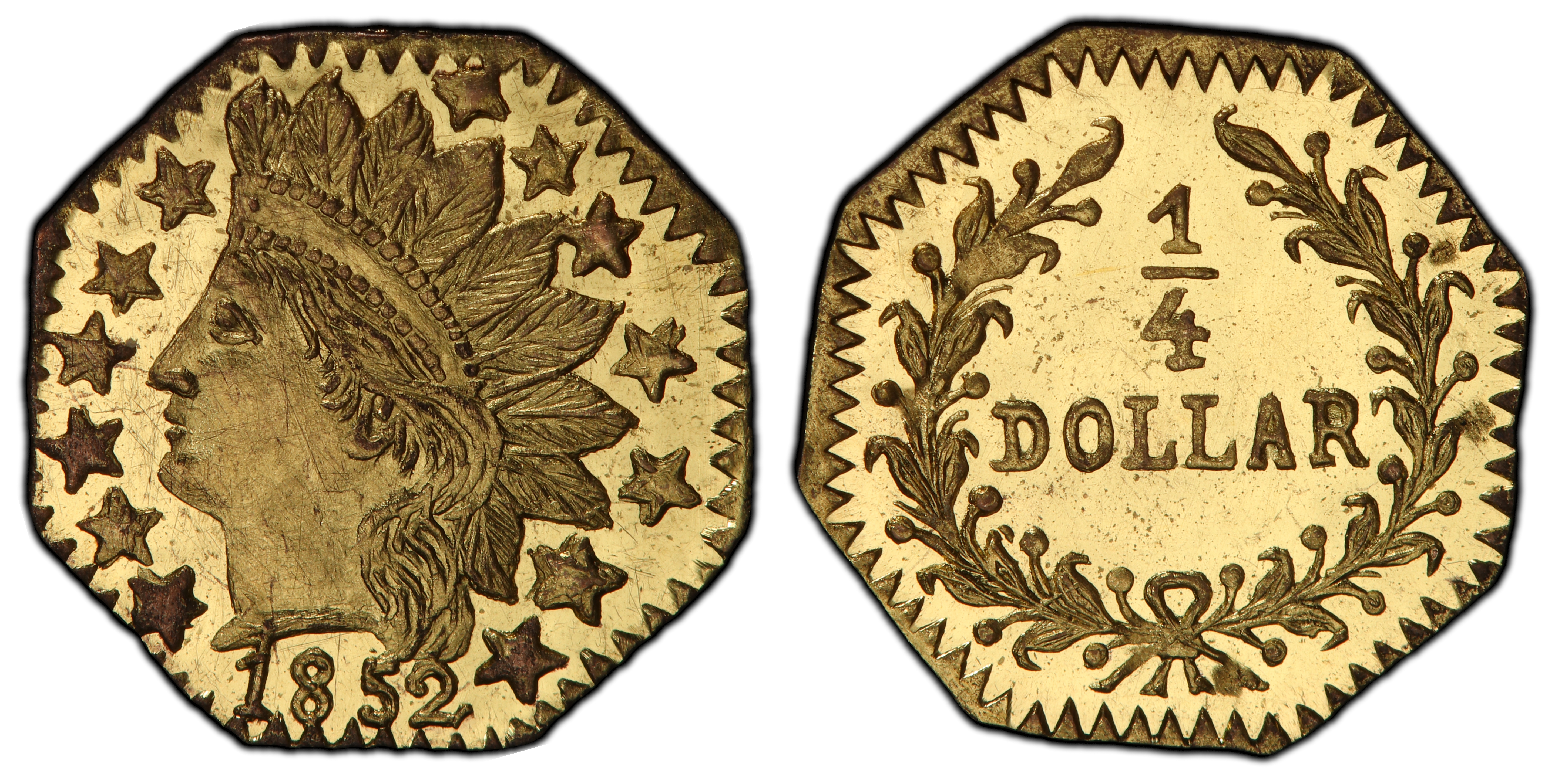 The 1852 25C BG-799U is a fascinating artifact born from the economic chaos of the California Gold Rush. Following the discovery of gold at Sutter's Mill in 1848, a massive influx of prospectors and merchants flooded into California, creating a vibrant but chaotic economy. While gold dust and large-denomination private assayer coins served for major transactions, a severe shortage of small-denomination federal coinage paralyzed daily commerce. Buying a drink, a meal, or other small necessities with a pinch of gold dust was imprecise and fraught with potential for conflict. This acute need for circulating change spurred private enterprise to fill the void. San Francisco jewelers and metallurgists began striking their own small-denomination gold coins in 1852, creating what are now known as California Fractional Gold pieces. These were not legal tender, but rather tokens of convenience whose acceptance relied on the reputation of the issuer and the desperate need for a medium of exchange. The BG-799U is classified as a 'Period One' issue (1852-1857), a time when these fractionals were genuinely intended for circulation. They were produced using relatively primitive methods, often hand-struck with a sledgehammer, which resulted in coins of varying strike quality and frequent die rotations, a characteristic common to the BG-799U variety. Their diminutive size made them easy to lose, and their intrinsic value, though often less than their face value, led many to be melted down over the years. By 1854, the establishment of the San Francisco Mint began to alleviate the coin shortage, and the utility of these private fractionals waned. Many later issues became popular as souvenirs and jewelry items rather than circulating currency. The BG-799U, however, represents the earliest and most historically significant period, a tangible piece of the Gold Rush's unique economic landscape.