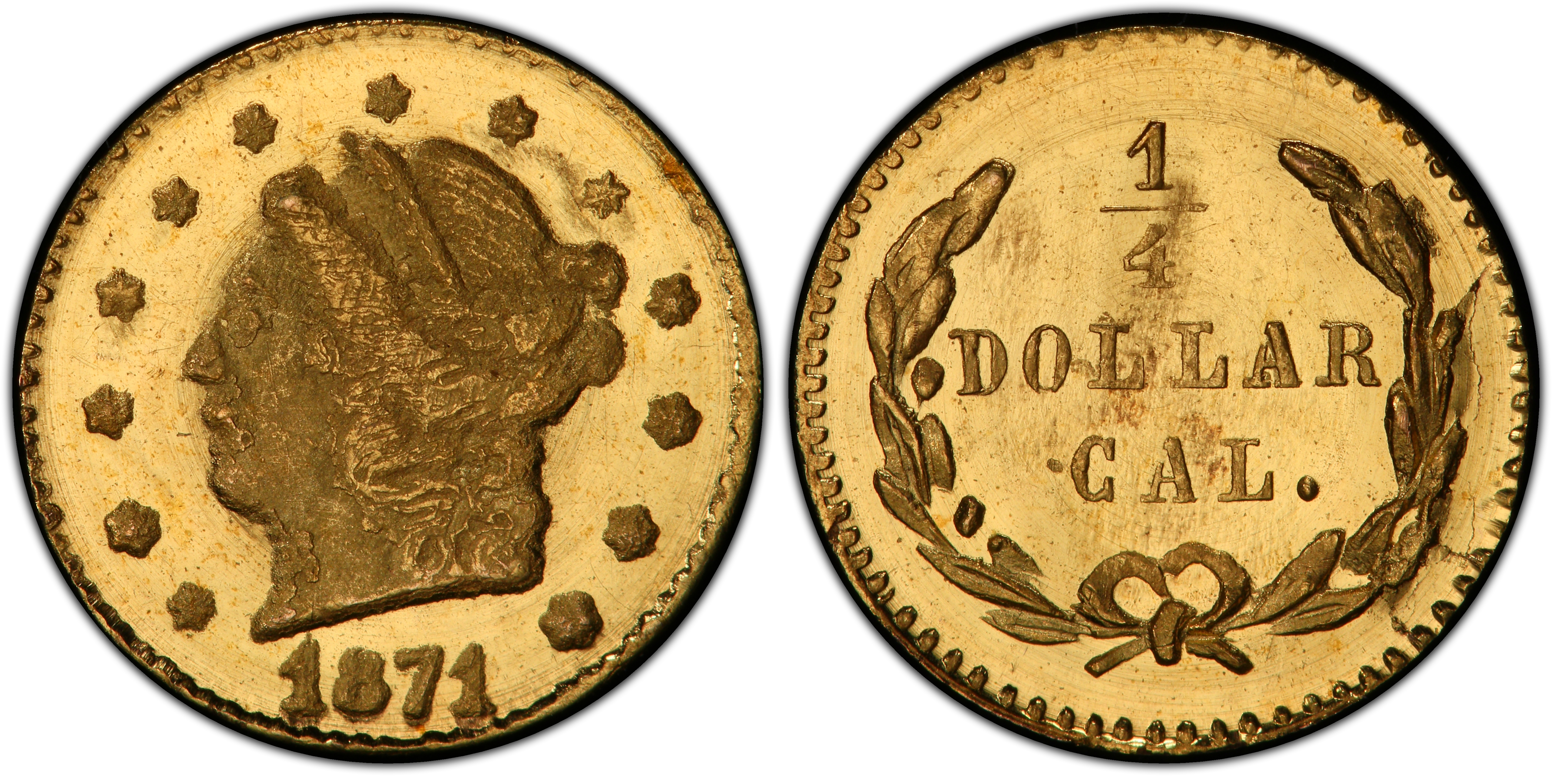 The 1871 Liberty Head 25 Cents, cataloged as Breen-Gillio 813, emerges from the second great phase of California's private gold coinage, known as 'Period Two' (1858-1882). Unlike the 'Period One' issues, born of necessity to alleviate a critical shortage of small change during the initial Gold Rush, the coins of this later era served a profoundly different purpose. By 1871, the San Francisco Mint was in full operation, and the completion of the Transcontinental Railroad in 1869 had fully integrated California's economy with the rest of the nation, stabilizing the supply of federal coinage. The raison d'ĂȘtre for fractional gold had shifted from commerce to commemoration and curiosity. These pieces were primarily 'jeweler's issues,' created by skilled artisans in San Francisco to be sold as souvenirs, keepsakes, and affordable gifts. They were tangible, miniature mementos of the Golden State, popular with tourists, visitors, and residents who wished to send a piece of California's famed wealth back East. The Coinage Act of 1864 had technically outlawed private coinage, but its enforcement was lax until the early 1880s, allowing this cottage industry to flourish. The BG-813 was therefore not intended for vigorous circulation in the manner of its predecessors. Instead, it was a commercial product, valued more for its novelty and connection to the Gold Rush legend than for its intrinsic worth, which was often less than its stated face value. Its existence speaks to a mature post-Gold Rush California, an economy diversifying into tourism and trade, where the romance of the '49er era was already being packaged and sold.