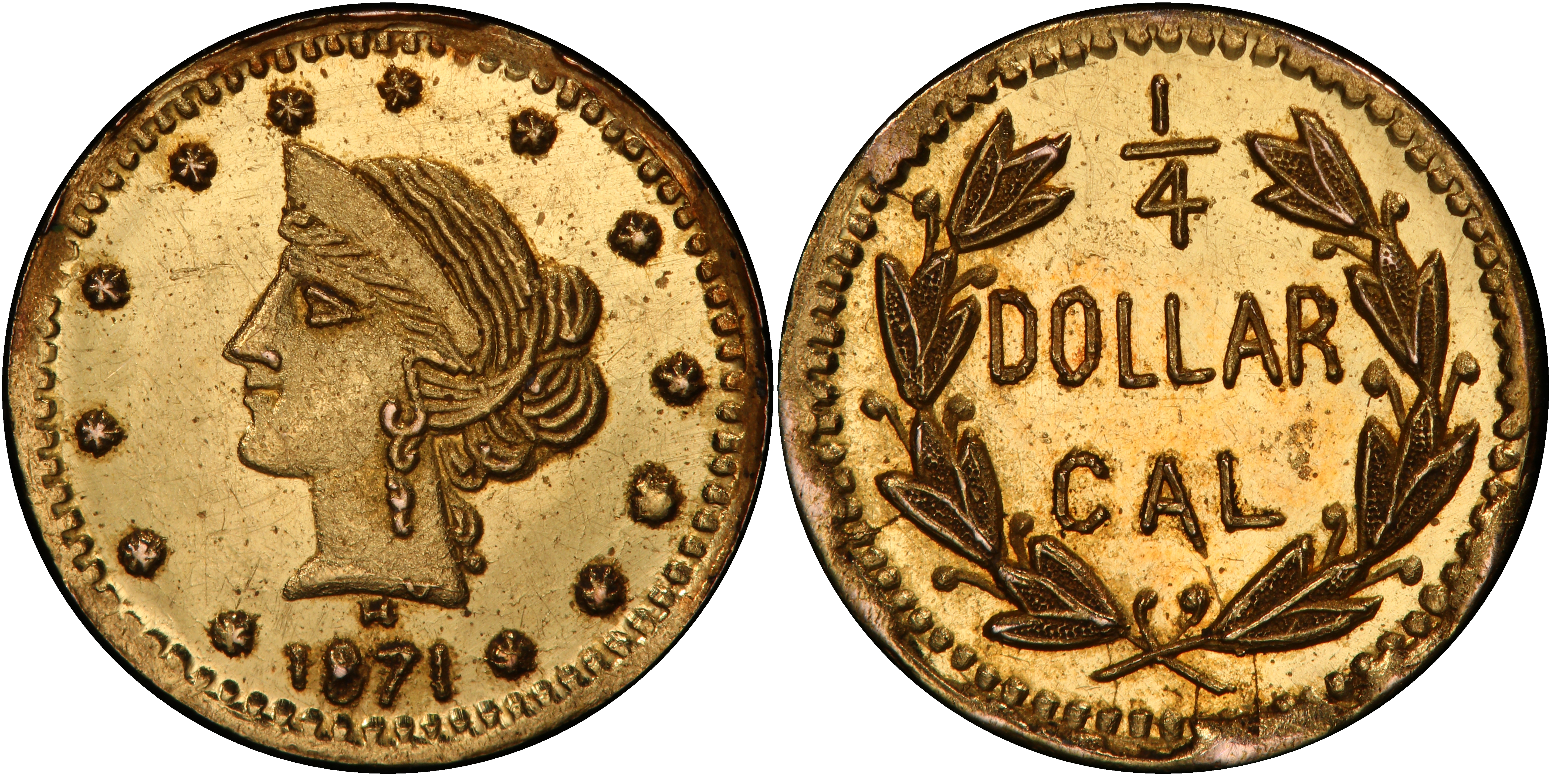 The 1871 BG-862 25 Cents represents the second major phase of California Fractional Gold production, often termed 'Period Two' (1859-1882). By this era, the raw necessity for small change that drove the creation of the earlier 'Period One' issues had largely subsided with the improved circulation of federal coinage. Instead, these later pieces evolved to serve a burgeoning souvenir and jewelry market. San Francisco jewelers, many of whom were anonymous, became the primary producers. These 'jeweler's issues' were not intended to meet a specific monetary standard; they were intentionally struck with a gold value significantly lower than their face value, functioning essentially as tokens or keepsakes. The Private Coinage Act of 1864 had explicitly forbidden the issuance of private coins intended for circulation, but the law was inconsistently enforced against these small, low-value pieces which were widely understood to be novelties. The makers often employed cruder, more stylized designs compared to their Period One predecessors, reflecting their commercial purpose. The BG-862 variety, with its simple Liberty motif, was a typical product of its time, offering a tangible, affordable memento of California's gold rush legacy to tourists and locals alike. Most were produced via the hammer method, where a planchet was struck between two dies using a sledgehammer, resulting in considerable variability in strike quality. The majority of these pieces met their end in the melting pot over the subsequent decades, making any surviving examples, particularly in high grade, significant numismatic rarities.