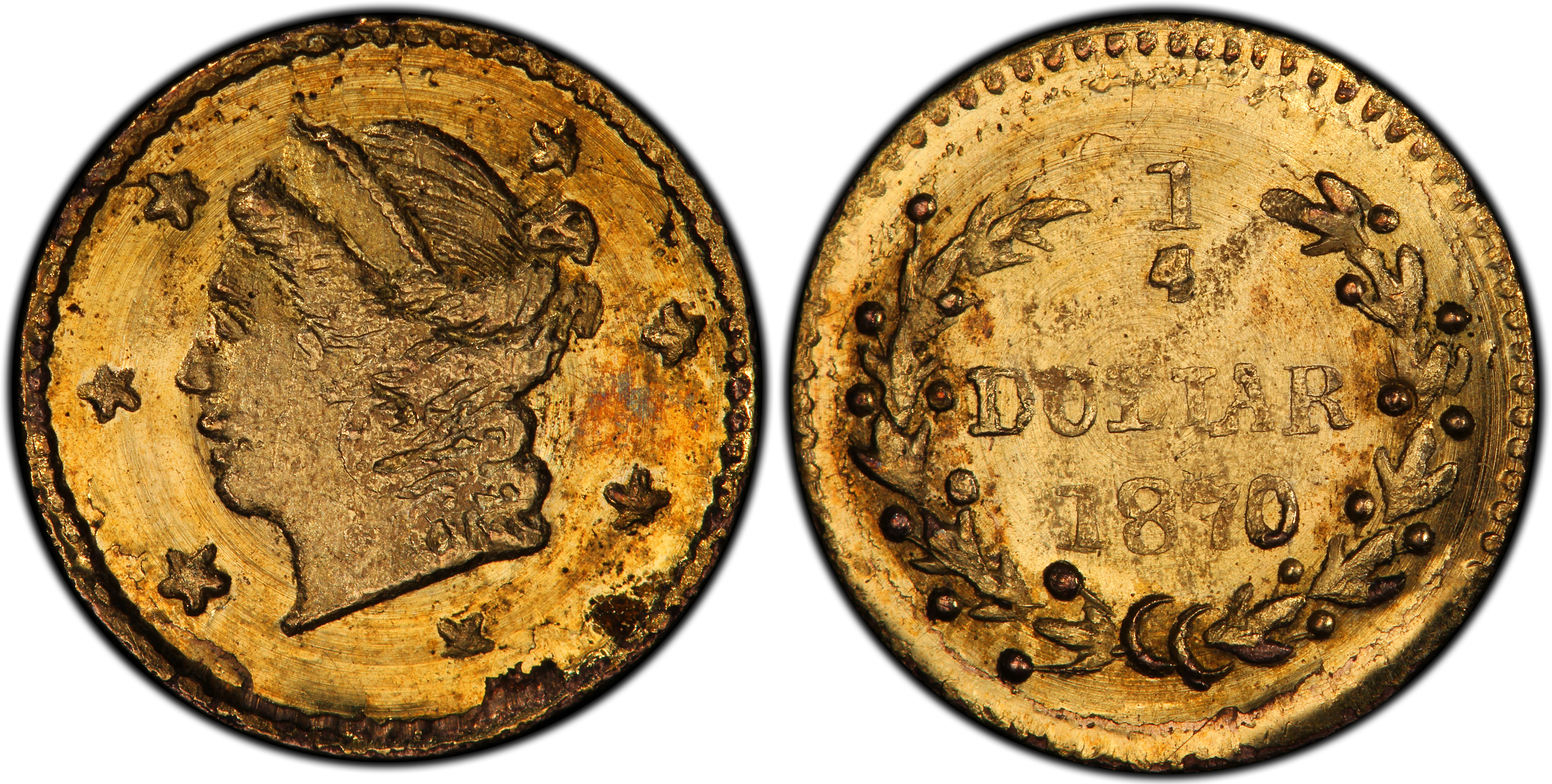 The 1870 G25C BG-808A is an almost mythical variety within the extensive and popular series of California Fractional Gold. These small-denomination gold pieces arose from a critical need for circulating coinage in the commerce-starved, gold-rich environment of California following the 1849 Gold Rush. While the U.S. Mint struggled to supply the West with sufficient federal coinage, private jewelers and metallurgists stepped in to fill the void. The first issues, now classified by numismatists as 'Period One' (1852-1857), were genuinely intended to alleviate the chronic shortage of small change and saw actual circulation. By the late 1850s, however, the landscape had changed. The San Francisco Mint was in full operation, and the acute need for private issues had subsided. The pieces struck from 1858-1882, known as 'Period Two' issues, including this 1870 specimen, served a different purpose. They were primarily created as souvenirs, keepsakes, and novelty items for locals, tourists, and merchants to send back East, capitalizing on the romantic allure of the Gold Rush. These later issues were often lighter and of less consistent fineness than their Period One predecessors. Many were produced by anonymous but skilled jewelers in San Francisco. The BG-808A is a die variety of the more common BG-808, and its status as a unique, single-known specimen suggests it may have been a trial or transitional striking, or perhaps part of an infinitesimally small batch whose dies failed quickly. Its survival is a remarkable fluke of history, a silent testament to a once-thriving industry of private gold coinage that catered to a nation fascinated by California's golden promise.