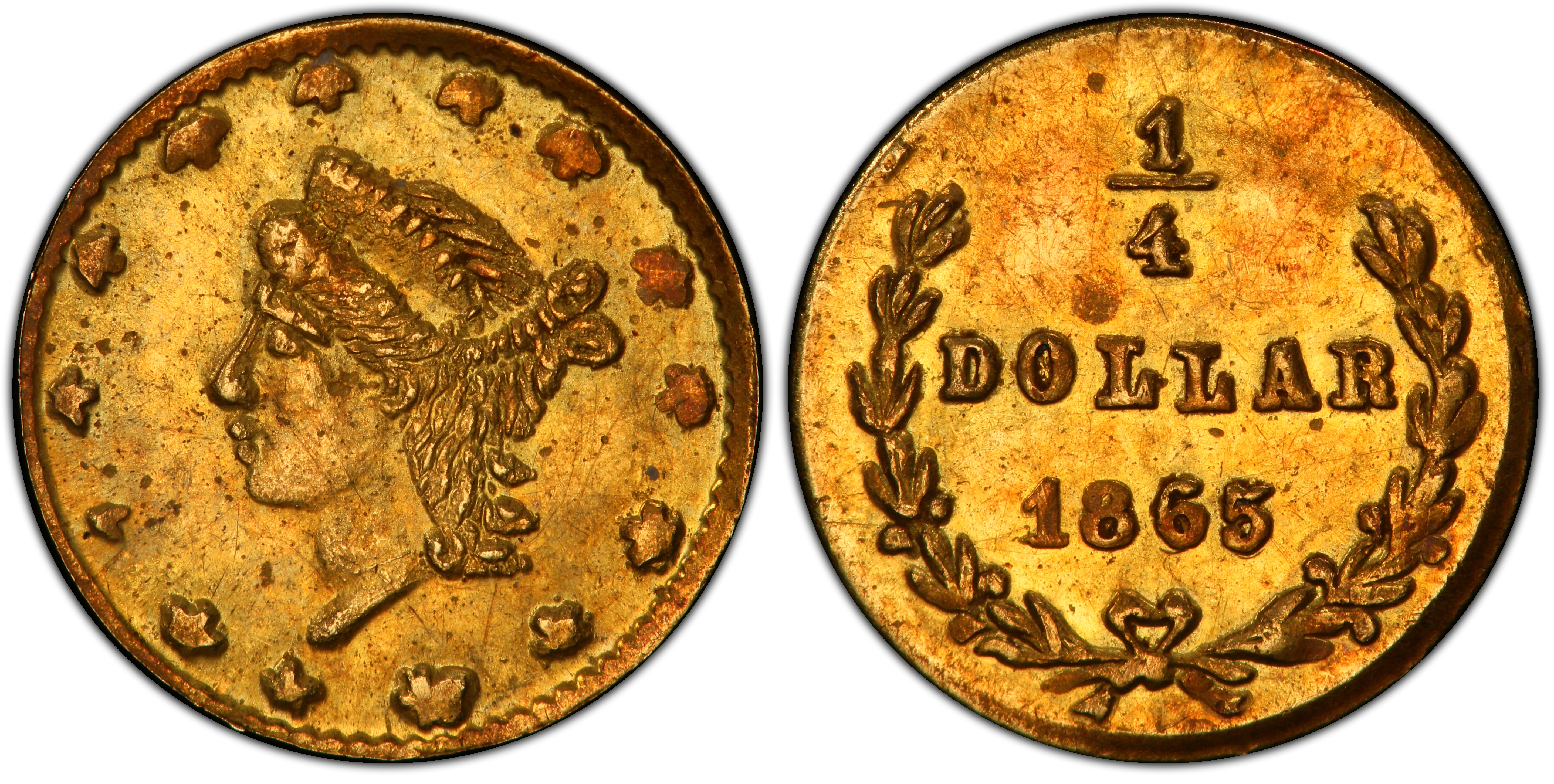The 1865 BG-822 25 Cents is a product of the second period (1859-1882) of California Fractional Gold production, often termed the 'jeweler's issues.' By the mid-1860s, the initial, feverish peak of the Gold Rush had subsided, but California's economy remained robust and distinct from the rest of the Union, which was embroiled in the Civil War. A chronic shortage of small-denomination federal coinage persisted on the West Coast, making everyday transactions for items like newspapers or drinks difficult. This scarcity, which had plagued California since 1849, continued to provide a commercial niche for private minters. Unlike the earlier 'Period One' pieces that more closely resembled federal coinage, the second period issues were typically smaller, lighter, and of lower fineness, essentially functioning as privately issued tokens whose convenience outweighed their low intrinsic value. Many of the minters were jewelers by trade, primarily based in San Francisco, who possessed the requisite skills for die cutting and striking small gold planchets. These pieces were technically illegal following the Coinage Act of April 22, 1864, which prohibited private coinage. However, enforcement in distant California was lax, and production of these useful tokens continued unabated for nearly two more decades. The BG-822, dated 1865, was struck in this environment. It was not intended as a store of value but as a practical substitute for the missing federal cents, dimes, and quarters needed for daily commerce. These tiny gold pieces circulated freely, accepted by merchants and the public out of sheer necessity, until a greater supply of federal coinage finally reached the West and rendered them obsolete by the early 1880s.