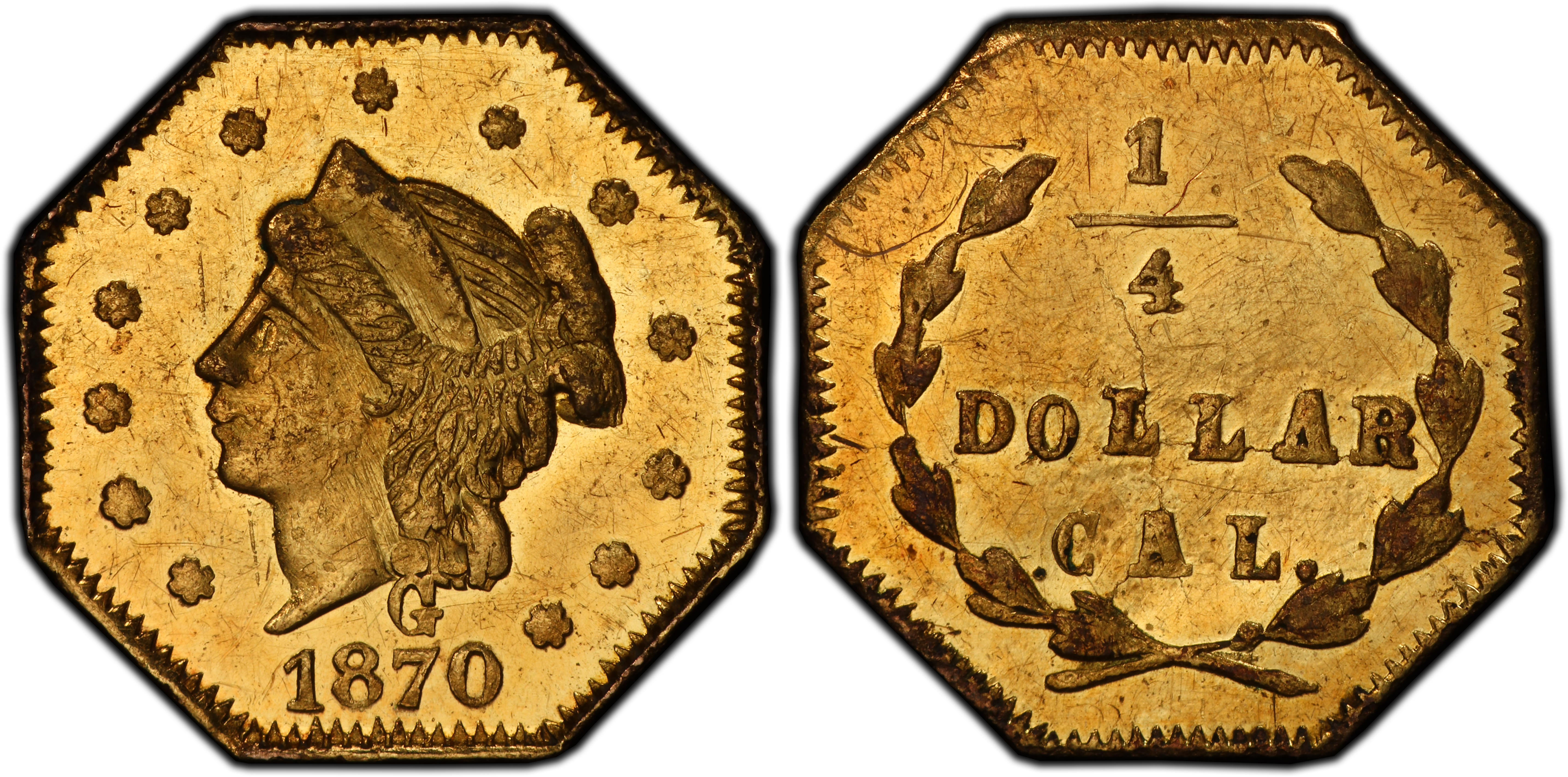 The 1870 Octagonal Liberty Head 25 Cents, cataloged as Breen-Gillio 758, is a product of the second period of California Fractional Gold production (1859-1882). By this time, the acute shortage of small change that characterized the Gold Rush heyday had largely subsided, thanks to the output of the official San Francisco Mint. The nature of fractional gold had thus shifted from utilitarian currency to souvenirs and novelty items. These 'jewelers' issues,' as they are often called, were privately struck, primarily in San Francisco, by craftsmen who recognized a market for mementos of the California Gold Rush, which had already passed into legend. The Coinage Act of 1864 had made the private issuance of coinage illegal, forcing these minters into a legally gray area. As a result, many pieces from this era were produced with less precious metal content than their stated face value, intended for sale to tourists and collectors rather than for circulation. The BG-758 is an artifact of this later period, a time when San Francisco was transitioning from a chaotic frontier town to a major American city. Its extreme rarity today suggests a minuscule original mintage, perhaps as a trial piece or a very limited issue by a small, and as-yet unidentified, jeweler. The 'PL' designation on some fractional gold pieces is believed to represent the minter's initials, but a definitive attribution for this specific variety remains one of the series' enduring mysteries. The coin's existence speaks to the persistent entrepreneurial spirit and the romantic allure of gold that defined California long after the peak of the rushes.