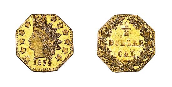 The 1874 Octagonal Indian Head 50 Cents, cataloged as Breen-Gillio 944, emerges from the second major phase of California's private gold coinage, a period numismatically distinct from the initial Gold Rush era. By the 1870s, the acute shortage of small change that spurred the creation of 'Period One' (1852-1857) fractional gold had been alleviated by the steady output of the San Francisco Mint. Consequently, the purpose of these diminutive gold pieces transformed. No longer essential for commerce, they became popular souvenirs and keepsakes, catering to a burgeoning tourist trade and a national fascination with the 'Golden West.' San Francisco's jewelers, many of whom were French immigrants, were the primary producers of these 'Period Two' (1858-1882) issues. They were often lighter and of a lower fineness than their stated face value, reflecting their new role as novelties rather than circulating currency. The Coinage Act of 1864 had technically prohibited private coinage, but the law was not rigorously enforced against these small tokens until 1883 by Secret Service Chief James J. Brooks. This legal gray area allowed for a prolific output of diverse designs throughout the 1870s. The BG-944, with its Indian Head motif, was a popular design choice of the era, evoking romanticized notions of the American frontier. These pieces were typically struck by hand using the hammer method, resulting in inconsistent strike quality and frequent die breaks, characteristics now appreciated by specialists. While the specific maker of the BG-944 die pair is not definitively recorded, prominent jewelers like Robert B. Gray & Co. were known to be active producers of similar pieces during this time. The existence of these coins today is a direct link to the post-Gold Rush economy of California, where the legacy of gold was commodified into miniature, tangible mementos of an adventurous era.