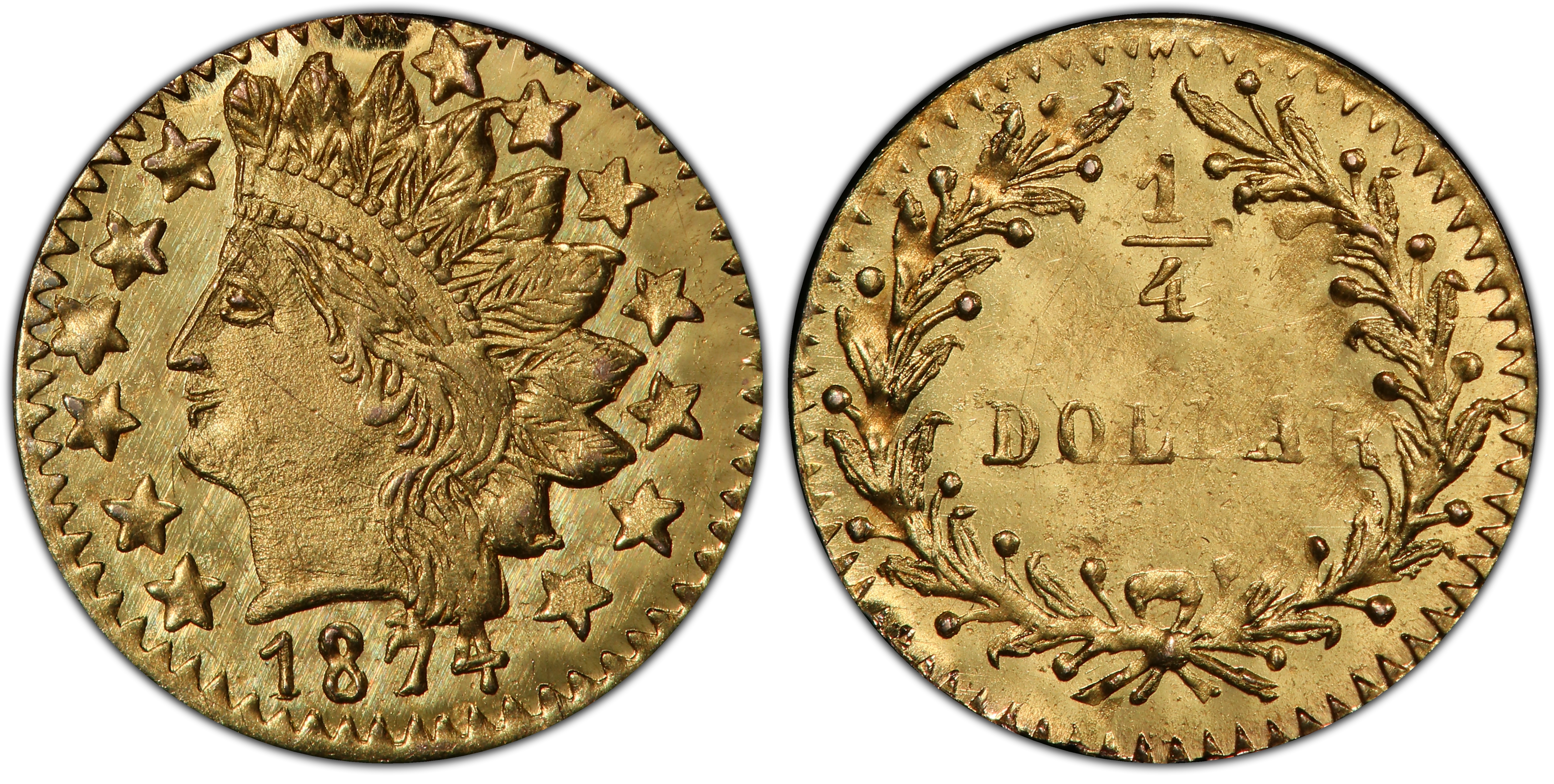 The 1874 G25C BG-888 is a product of the 'Period Two' (1856-1882) of California Fractional Gold production. This era, long after the initial chaos of the Gold Rush had subsided, saw a different need for small denomination coins. The official United States coinage system was well-established on the West Coast, but a lingering shortage of small change persisted, particularly for transactions under a dollar. Unlike the earlier Period One pieces, which were a direct response to a lack of any functional currency, these later tokens were primarily created by local jewelers as souvenirs and curiosities, capitalizing on the romanticism of the Gold Rush. They were, however, made of genuine gold and did circulate to a limited extent, often accepted in commerce at a value close to their intrinsic worth. The Act of 1864 had made private coinage illegal, but these pieces cleverly omitted the word 'DOLLAR' or the abbreviation 'DOL.' to circumvent the law, instead using 'DOLL,' 'D,' or simply the denomination like '1/4' and a bear symbol. The BG-888 variety, struck in 1874, is a classic example of this type. It features a standard 'Liberty Head' design, imitative of federal coinage but distinct in its execution. The manufacturer is not definitively known, but numismatic scholarship, particularly the work of Breen and Gillio, suggests many Period Two dies were cut by San Francisco die-sinkers like Albert Kuner and utilized by various jewelers, with Robert B. Gray & Co. being a prominent name associated with many of these issues. These small gold pieces served as a tangible link to California's golden identity, functioning as keepsakes for tourists and locals alike, while occasionally filling a minor role in the local economy. Their production ceased after 1882, making them a fascinating and closed chapter in American numismatic history.