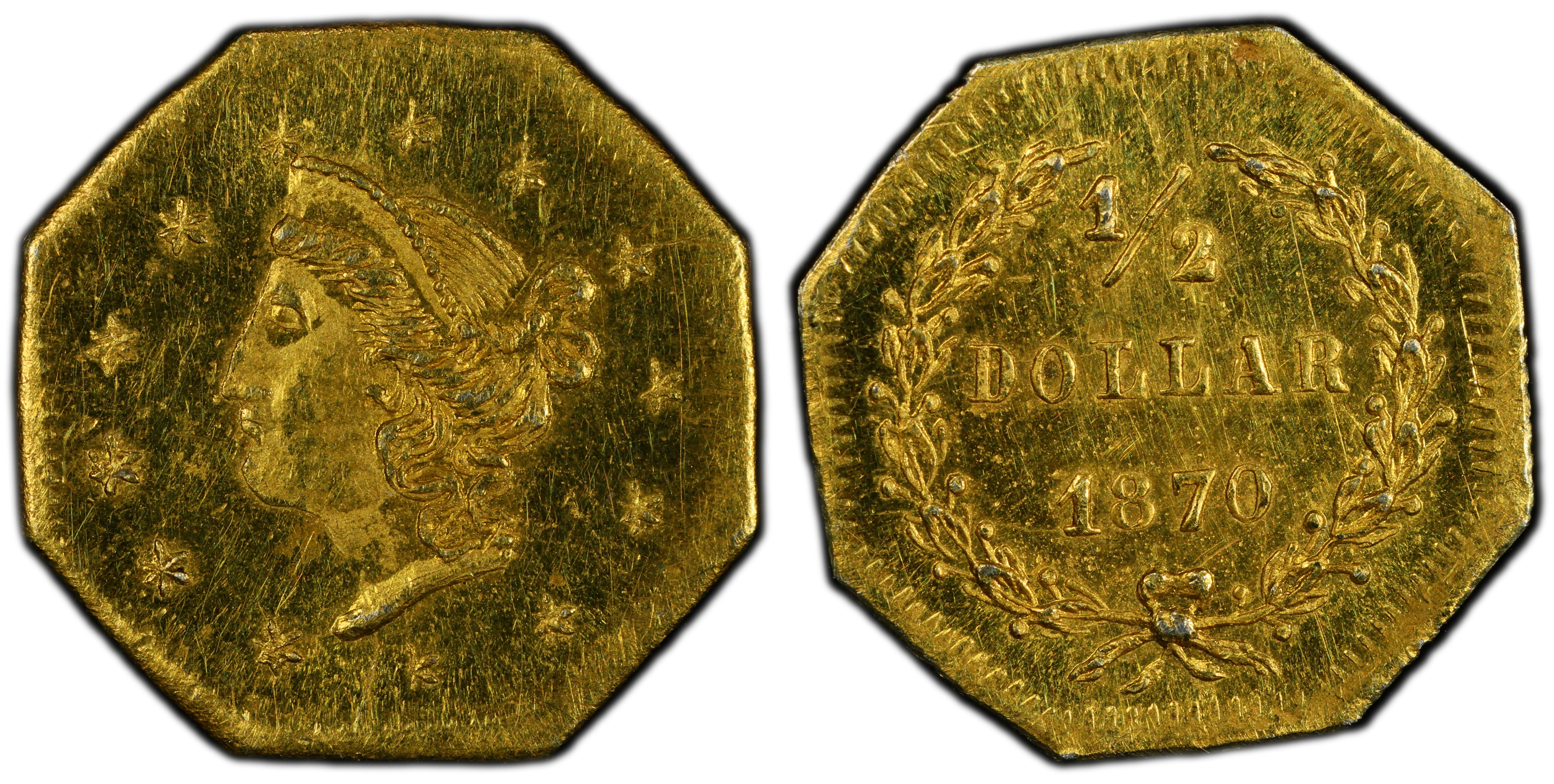 The 1870 BG-936 50 Cent piece emerges from the second major period of California Fractional Gold production (1859-1882), a fascinating and complex chapter in American numismatics. Following the initial Gold Rush boom, the acute shortage of small change persisted in California. While the first period of fractional gold (1852-1856) saw coins with a relatively high gold content meant to genuinely supplement circulating currency, the second period, to which the BG-936 belongs, is characterized by what are often termed 'jeweler's issues.' These pieces were produced by various jewelers and artisans in San Francisco, not strictly to alleviate a coin shortage, but more as souvenirs, keepsakes, and items for the jewelry trade. By 1870, the San Francisco Mint was producing ample federal coinage, yet the demand for these miniature gold novelties continued, fueled by tourism and a romantic association with the Gold Rush. These Period Two issues were notoriously underweight, containing gold value significantly less than their face value, a fact that was widely understood at the time. Their legality was dubious following the Private Coinage Act of 1864, but enforcement was lax, allowing production to continue. The BG-936 variety is notable for its crudely engraved obverse, which has earned it the collector nickname 'Goofy Head.' This style is emblematic of the less formal, mass-produced nature of jeweler's issues compared to the more refined Period One coins. These pieces were often struck using the 'hammer method,' where dies were struck by hand with a sledgehammer, resulting in inconsistent strike quality and frequent die breaks, adding to their individuality. Their journey was not one of extensive circulation but rather of private possession, often mounted into jewelry or kept in curio cabinets, which accounts for the relatively high proportion of survivors in uncirculated grades despite their low mintage.