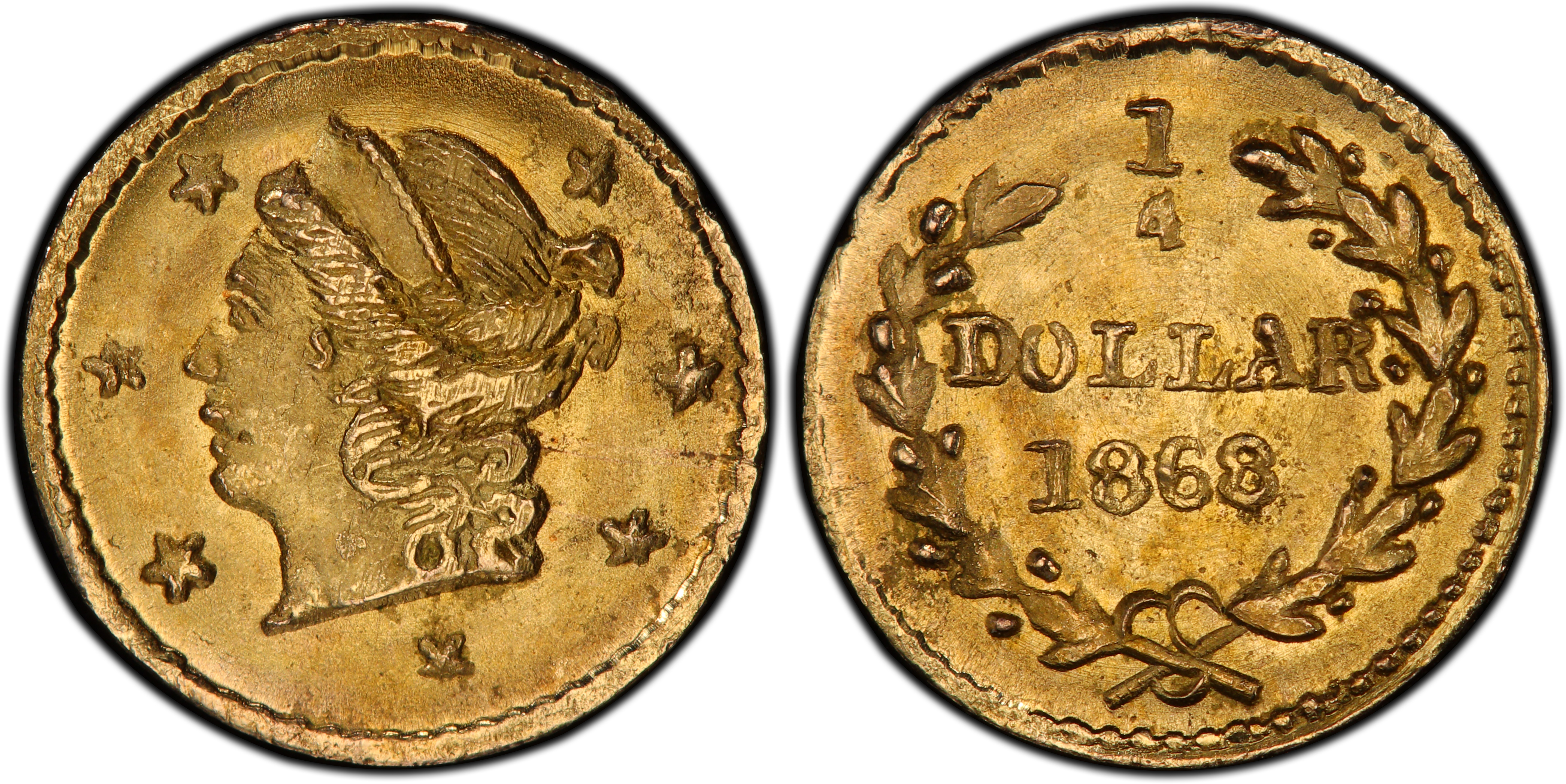 Reverse DescriptionThe denomination '1/4' is enclosed within a wreath of two olive branches tied with a ribbon at the bottom. Above the wreath is the date '1868'. Below the wreath, the word 'DOLLAR' appears. A notable diagnostic for the BG-806 variety is a small, somewhat crudely engraved '4' in the fraction.