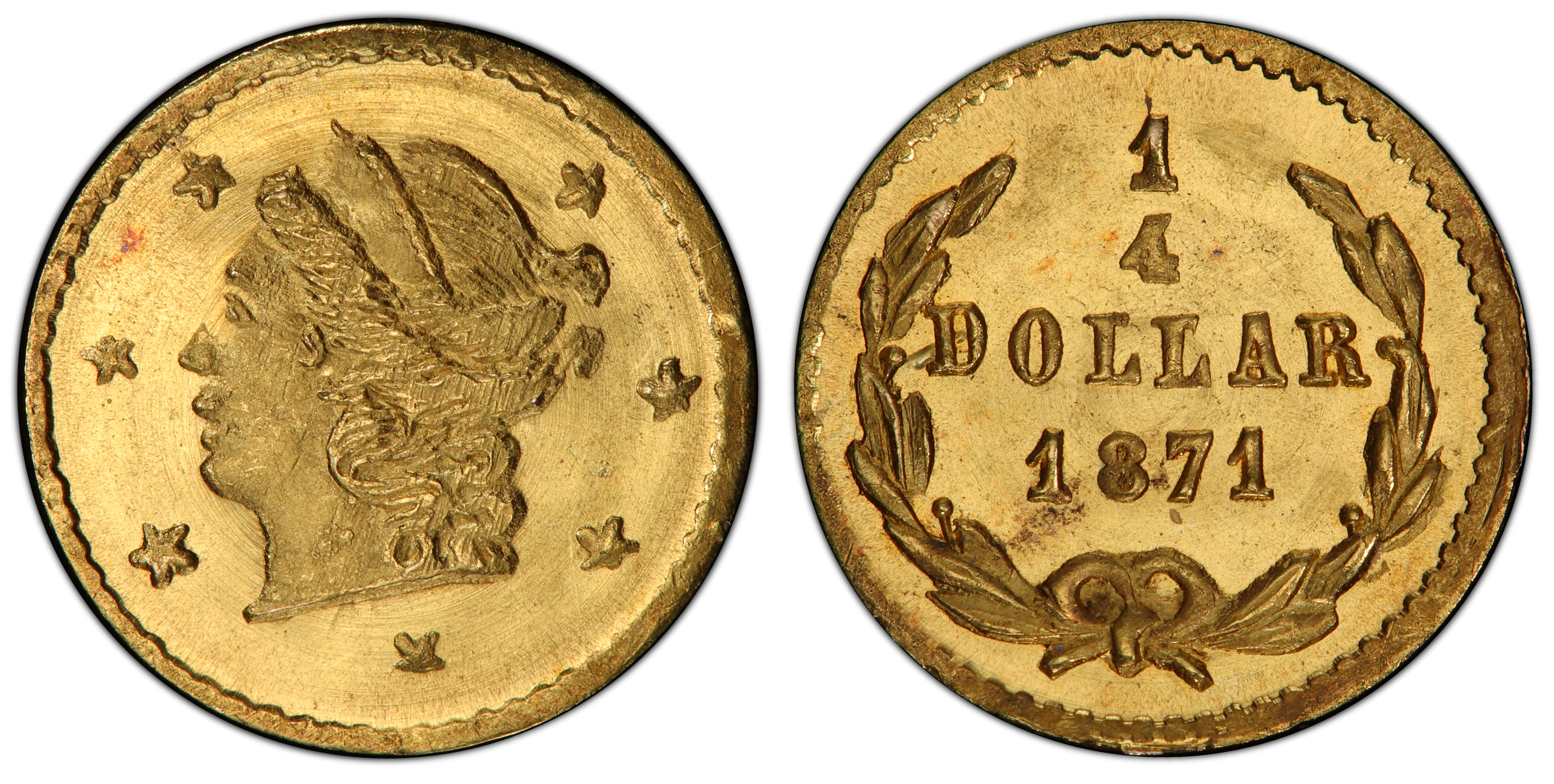 The 1871 25 Cents, cataloged as Breen-Gillio 809, is a quintessential example of 'Period Two' California Fractional Gold. These small-denomination coins arose from the unique economic landscape of post-Gold Rush California. While the initial deluge of '49ers had subsided, California remained a region awash in gold dust but critically short of small circulating coinage for daily transactions. The U.S. Mint in San Francisco, established in 1854, primarily focused on larger denominations, leaving a void that private minters, often jewelers, eagerly filled. The first period of these fractionals (1852-1857) were often crudely made and intended to genuinely alleviate this change shortage. By the time the BG-809 was struck in 1871, the context had shifted. While still serving a marginal transactional purpose, these 'jeweler's issues' were increasingly produced as souvenirs and keepsakes for a growing tourist trade and for locals who cherished them as mementos of the Gold Rush era. This piece is attributed to Pierre Frontier, a French jeweler who had established himself in San Francisco circa 1853. The coins he and his contemporaries produced were often lighter than their stated face value in gold would suggest, a common characteristic of Period Two issues that solidified their status as privately issued tokens rather than true coinage. The Coinage Act of 1864 had officially forbidden private coinage, but enforcement by the Secret Service was lax until the early 1880s, allowing this vibrant and historically significant series to persist. The BG-809, with its crude but charming Liberty Head, is a tangible link to this era of private enterprise and the enduring legacy of the California Gold Rush, representing a time when jewelers' workshops served as de facto mints for the public's needs.