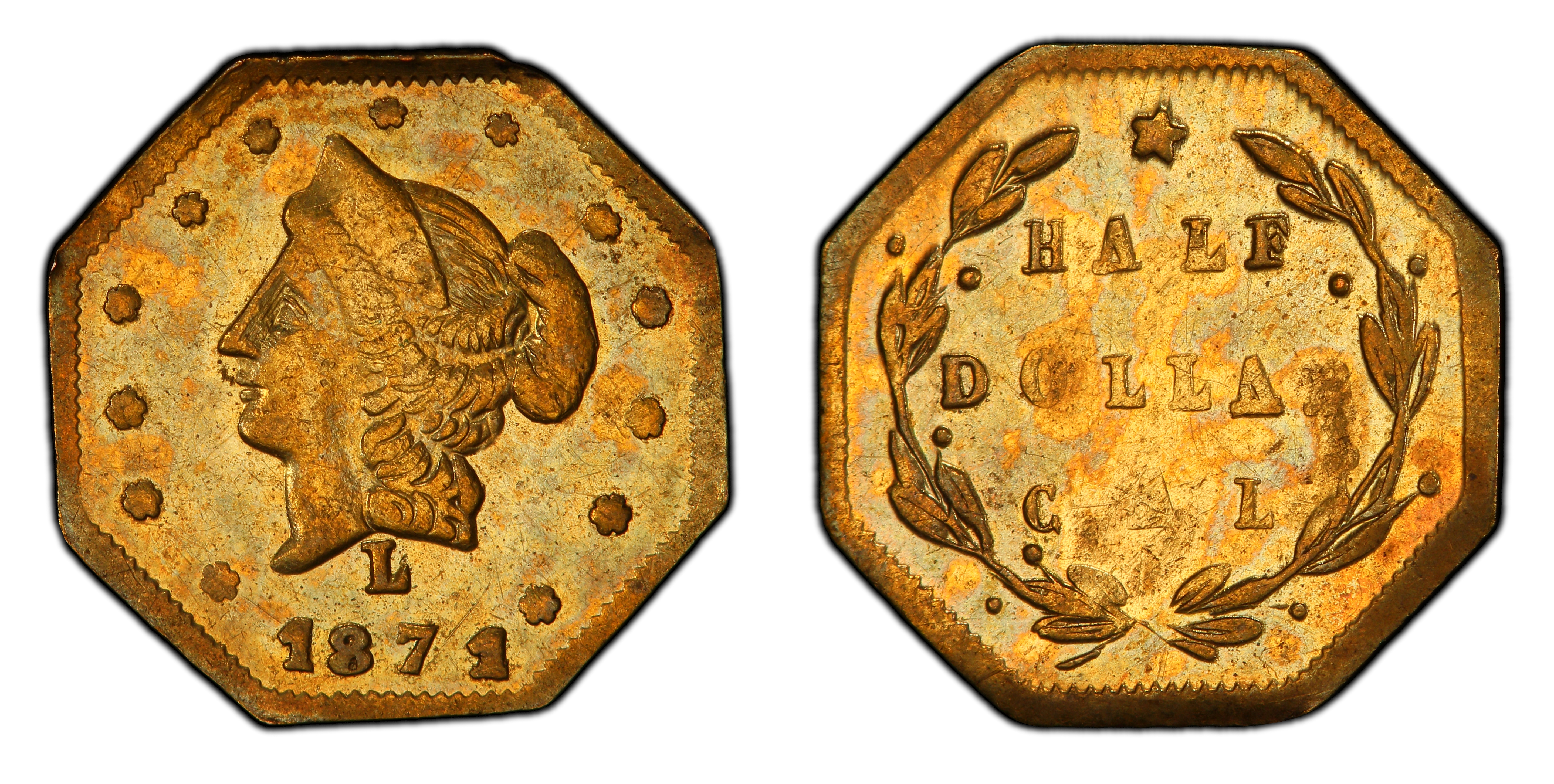 The 1871 BG-926 fifty-cent piece emerges from the second major phase of California's private gold coinage, a period numismatists designate as 'Period Two' (1859-1882). Unlike the earlier 'Period One' issues, which were struck with the genuine intent of alleviating a chronic shortage of small change during the initial Gold Rush boom, the coins of this later era served a different purpose. By the 1870s, the San Francisco Mint was in full operation, producing ample federal silver coinage that had largely solved the transactional gridlock of the 1850s. The impetus for creating fractional gold had therefore shifted from commercial necessity to commercial novelty. These later pieces, often called 'jeweler's issues,' were primarily manufactured by jewelers and metalsmiths in San Francisco as souvenirs and keepsakes. They catered to a growing tourist trade and a local population still enchanted by the allure of gold. These coins were intentionally lightweight, containing significantly less gold than their stated face value, making them profitable tokens rather than legitimate currency. The production process was rudimentary, often involving hand-operated screw presses or even simple hammer striking, which resulted in coins of varying strike quality. Despite not being intended for widespread circulation, they were widely collected and preserved as mementos of the Gold Rush era, which ironically contributed to their survival, albeit in very small numbers. The passage of the Coinage Act of 1864 had effectively outlawed private coinage, but enforcement was lax for many years, allowing these small, token-like gold pieces to be produced until federal authorities finally cracked down in the early 1880s.
