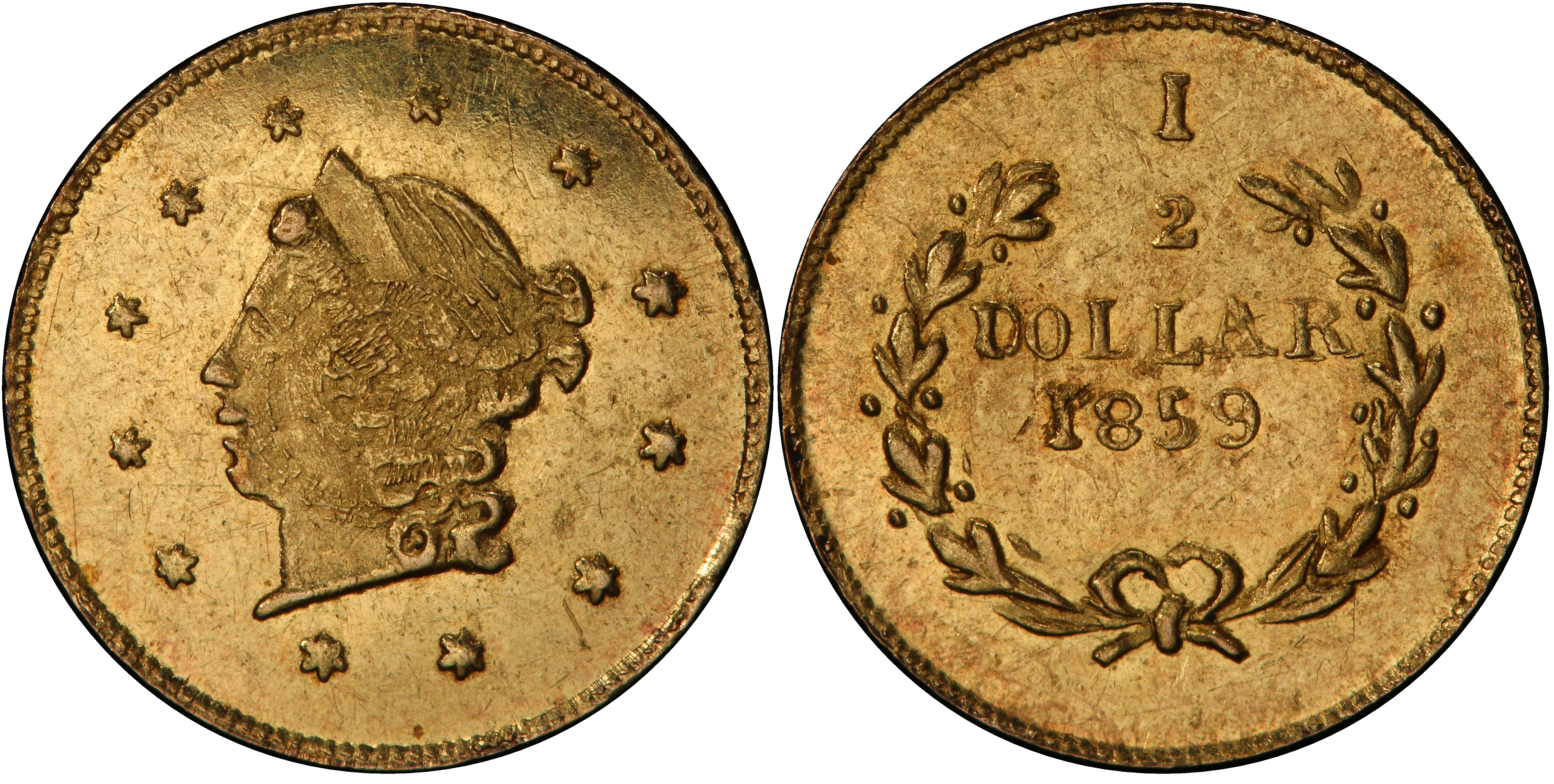 Obverse DescriptionA crudely engraved bust of a Liberty Head facing left, her hair tied in a bun at the back. The portrait is surrounded by thirteen stars, representing the original colonies. The date '1859' appears below the bust.