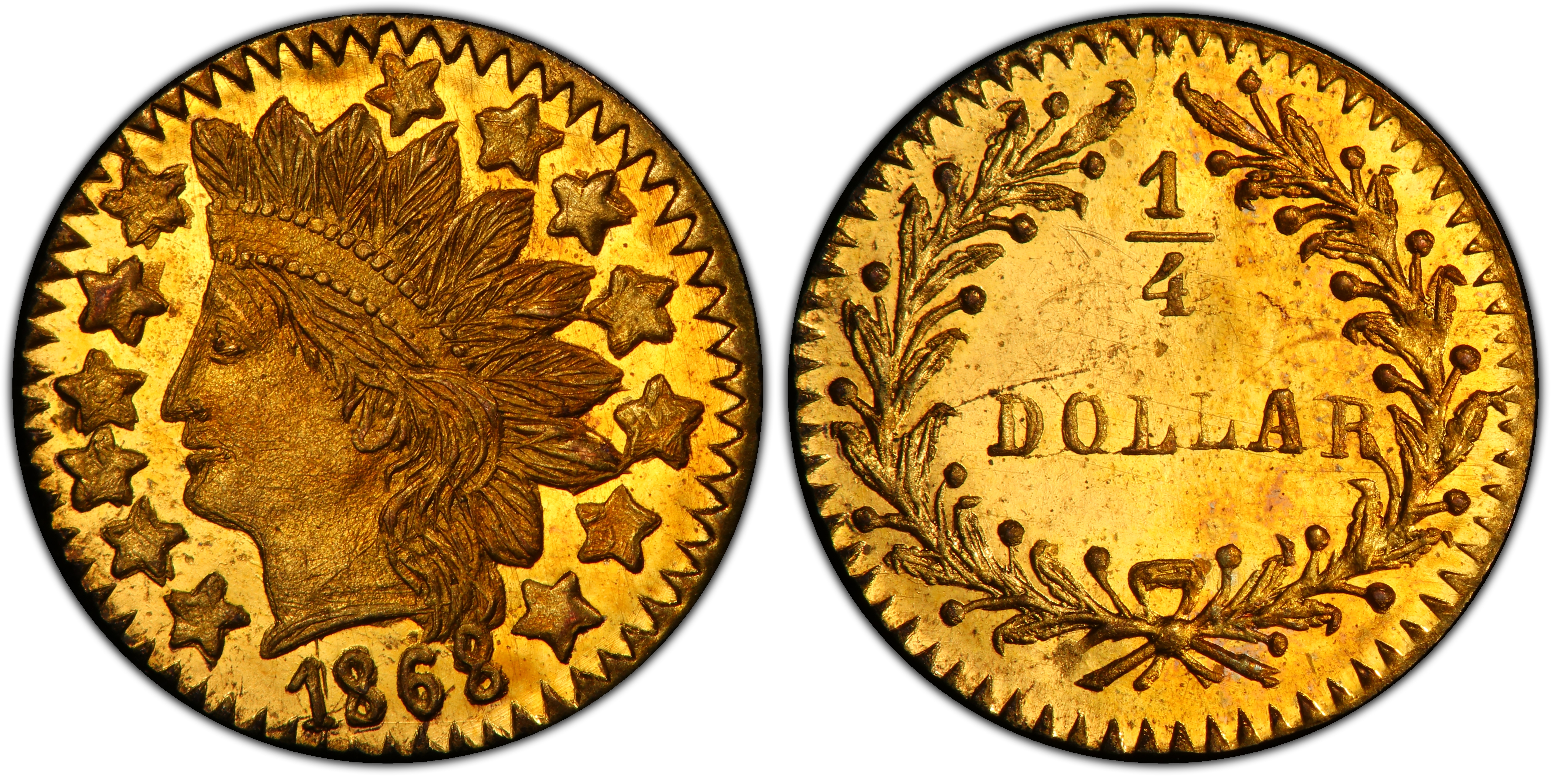 The 1868 BG-890 25 Cent piece is a quintessential example of 'Period Two' California Fractional Gold. By the late 1860s, the initial, urgent need for small-denomination coinage that characterized the Gold Rush (Period One, 1852-1857) had largely subsided. The establishment and output of the U.S. Branch Mint in San Francisco in 1854 had supplied the region with sufficient federal coinage for daily commerce. However, the allure of California gold and the romance of the Gold Rush had created a robust national market for souvenirs and keepsakes. Enterprising jewelers, primarily in San Francisco, stepped into this market, creating a wide variety of miniature gold 'coins' that were not intended for circulation, but rather to be sold as mementos to tourists and collectors. These 'jewelers' issues,' as they are known, were struck with dates from 1858 through 1882. The Coinage Act of April 22, 1864, had made private coinage illegal, but the law was not strictly enforced against these small, token-like pieces until 1883. The minters of Period Two pieces were less concerned with intrinsic value—most are significantly underweight for their stated denomination—and more focused on attractive and varied designs. The Indian Head motif, as seen on the BG-890, was a popular design choice of the era, mimicking the appearance of federal coinage like the Indian Head Cent and gold dollar, which lent it an air of legitimacy and popular appeal. These pieces were often produced using crude 'hammer' methods, where dies were struck by hand, leading to variability in strike quality. Because they were sold as novelties and not spent, a relatively high proportion have survived in Mint State condition, often displaying prooflike or semi-prooflike surfaces from polished dies. The BG-890 is one of many such distinct die pairings cataloged by Walter Breen and Ronald Gillio, a testament to the cottage industry that flourished by transforming California's gold into treasured symbols of an iconic American era.