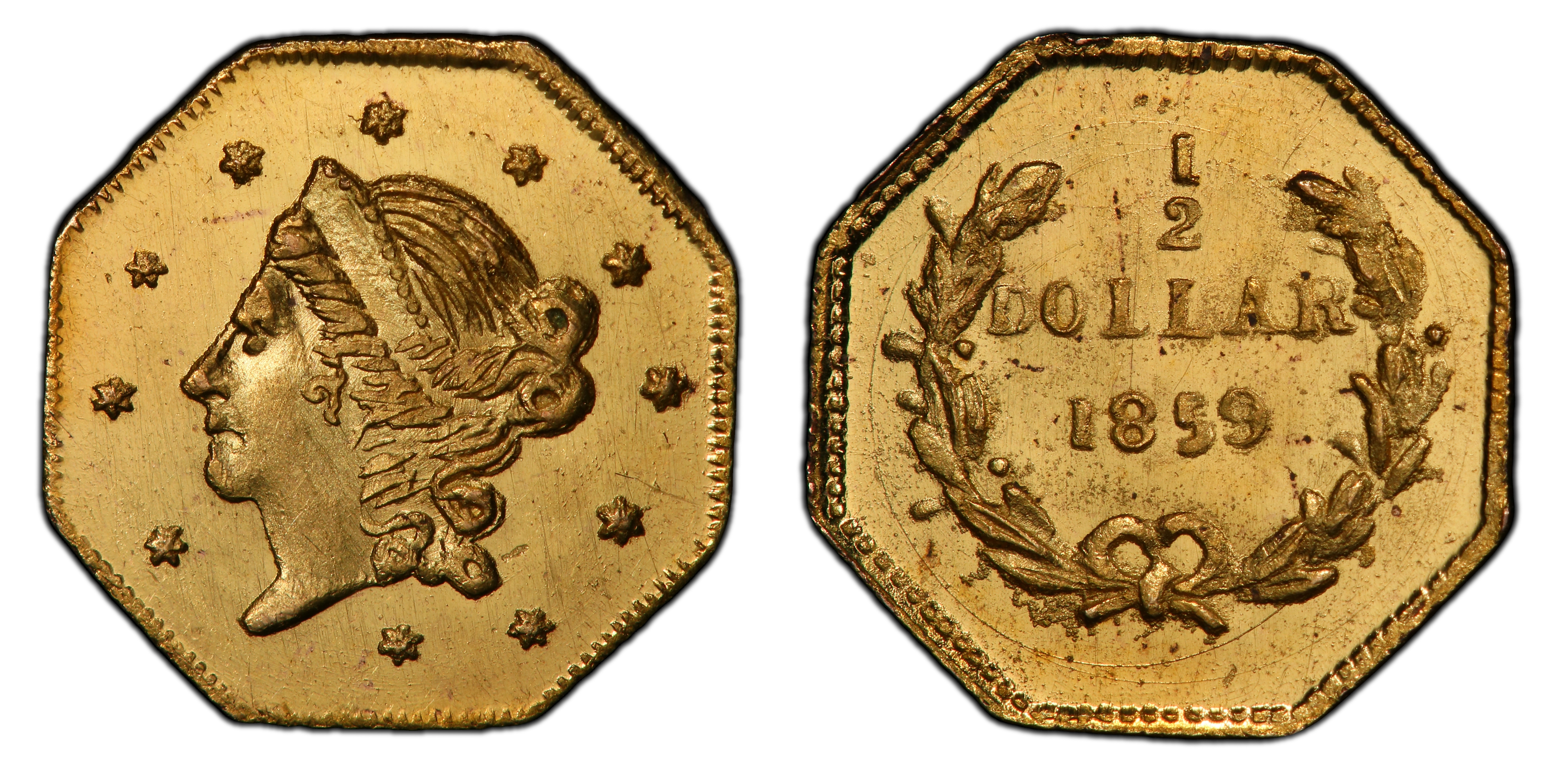 The 1859 BG-902 50 Cents represents a pivotal transition in the history of California Fractional Gold. It is a 'Period Two' issue, a class of coins numismatists distinguish from the earlier 'Period One' (1852-1857) pieces. While the Period One coins were struck out of genuine commercial necessity to alleviate a severe shortage of small change during the initial chaos of the Gold Rush, the Period Two issues, including BG-902, were created in a different economic climate. By 1859, the San Francisco Mint was in full operation, and federally issued silver coins had become more plentiful, largely satisfying the original need for small denominations. The impetus for striking fractional gold shifted from commerce to souvenir and jewelry sales. San Francisco was becoming a tourist destination, and its romanticized image as the heart of the Gold Rush created a robust market for keepsakes. Local jewelers, many of French origin such as Frontier, Deviercy & Co., stepped in to meet this demand. These 'jewelers' issues' were not intended to meet a specific bullion value; their gold content was often less than their face value, and metallurgical standards were inconsistent. The BG-902, an octagonal Liberty Head type, was part of this wave of commercial production. Struck in a year that saw a resurgence of fractional gold minting after a brief hiatus, it was designed to appeal to public sentiment, mimicking the style of federal gold coinage but in a diminutive, novel format. These pieces were sold as curios, mounted into rings and pins, or kept as mementos of a visit to the Golden State. The Coinage Act of 1864 would eventually prohibit private coinage, but enforcement was lax until the 1880s, allowing these fascinating 'suppressed jewelers' issues' to be produced for over two decades, serving as a tangible link to the enduring legacy and popular mythology of the California Gold Rush.