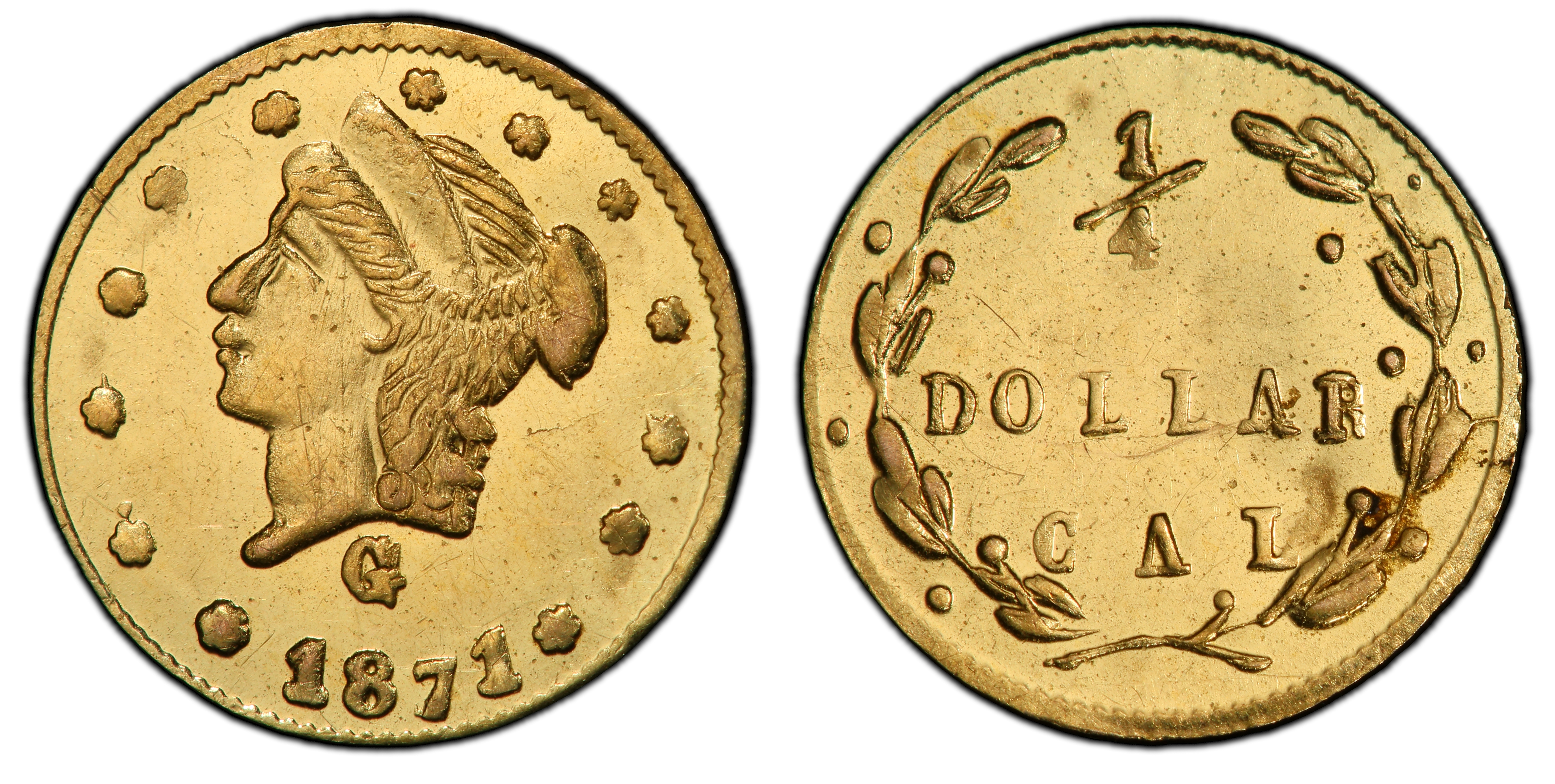 The 1871 BG-838 quarter dollar is a fascinating artifact from the second period of California's private gold coining era, a time when the initial chaos of the Gold Rush had subsided but the need for small-denomination coinage remained acute. Following the massive influx of population that began in 1849, California was rich in gold dust but critically poor in circulating currency, especially for minor transactions. A pinch of gold dust for a drink was an inaccurate and wasteful system. To fill this void, private minters, often jewelers by trade, began striking their own coins in the early 1850s. The first period issues (1852-1856) were genuinely intended to circulate and somewhat mirrored federal issues. However, by the time the BG-838 was produced in 1871, the landscape had changed. This coin is classified as a 'Period Two' or 'Jeweler's Issue' (1859-1882). While still addressing the coinage shortage, these pieces were often lighter in gold content than their face value suggested and served a dual purpose as both currency and popular souvenirs for Easterners fascinated by the Golden State. The production method was rudimentary; most were hand-struck using a hammer, where a planchet was placed on a bottom die and the top die was struck with a sledgehammer, leading to wide variations in strike quality. This particular variety, BG-838, is attributed to the San Francisco firm of Robert B. Gray & Co. The presence of the 'G' mintmark, for Gray, on the reverse firmly links it to his prolific output. Despite the passage of the Private Coinage Act of 1864 which made such private issues illegal, the law was not strictly enforced in the West until 1883, allowing minters like Gray to continue production. These tiny gold pieces were essential cogs in California's unique economy for decades, facilitating everyday commerce in a region geographically and economically isolated from the rest of the nation. Their eventual suppression by the Secret Service in the early 1880s marked the end of a remarkable and freewheeling chapter in American monetary history.