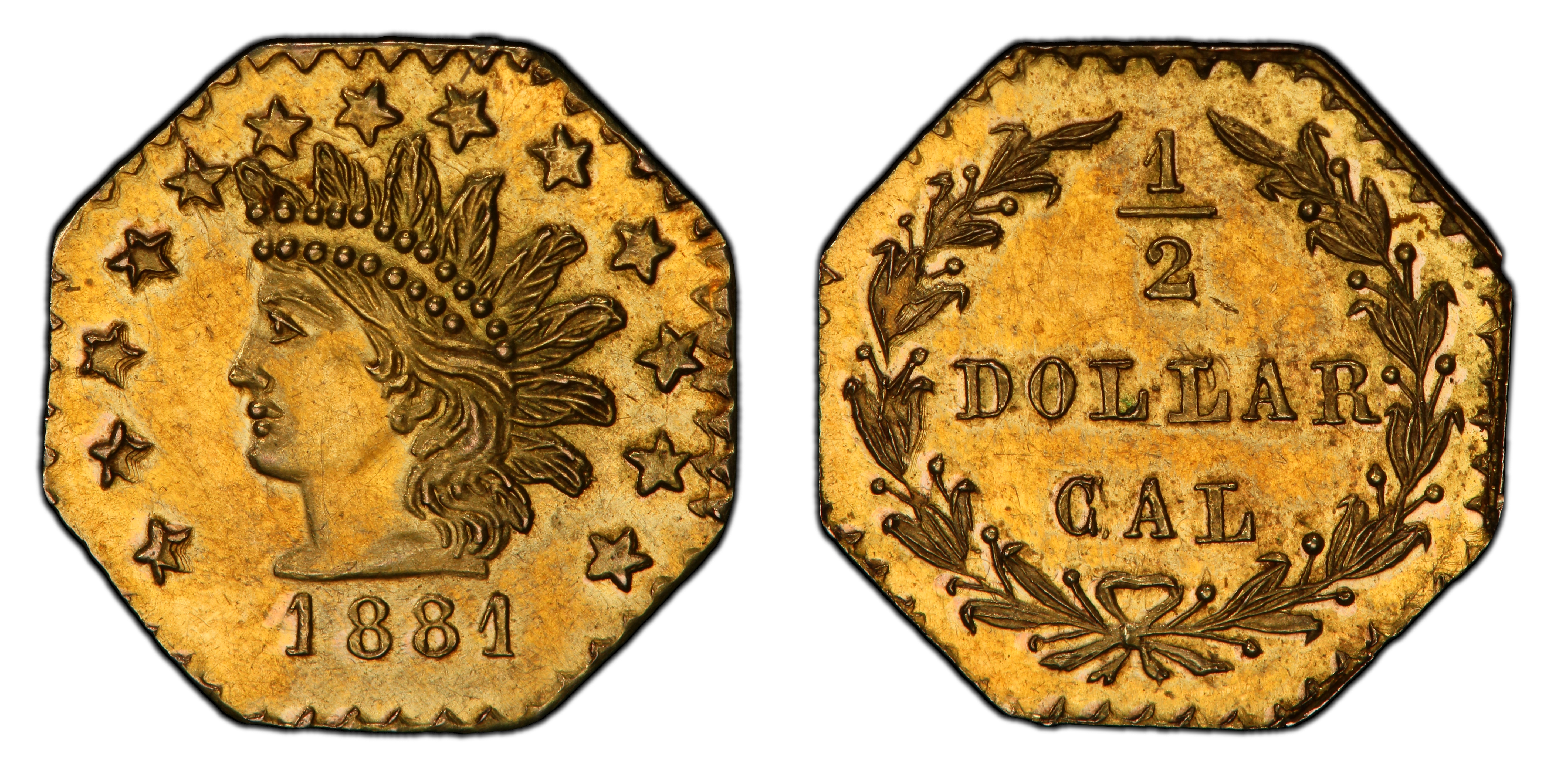 Obverse DescriptionAn octagonal planchet featuring a Native American (Indian) head facing left, adorned with a feathered headdress. The portrait is surrounded by thirteen stars, representing the original colonies. The date '1881' is positioned below the bust.
