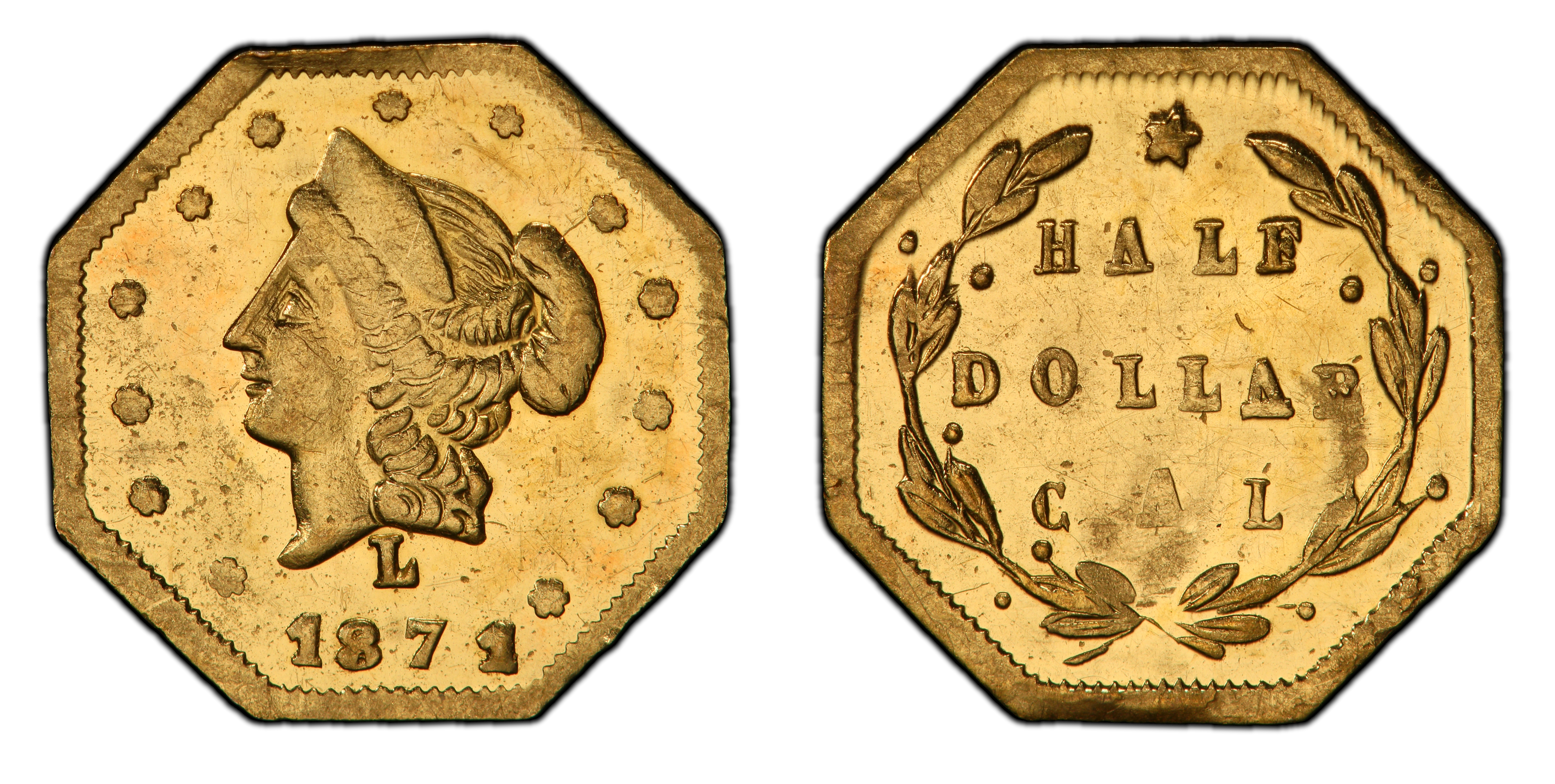 The 1871 Octagonal 50 Cents, cataloged as BG-926, is a product of the second period (1859-1882) of California Fractional Gold production. Unlike the 'Period One' issues struck out of commercial necessity to alleviate a severe shortage of small change during the initial Gold Rush, these 'Period Two' pieces, often termed 'jewelers' issues,' served a different purpose. By the 1870s, the acute coin shortage had eased, and the primary demand for these tiny gold pieces had shifted from commerce to souvenirs. Jewelers and private minters in San Francisco capitalized on this by producing a wide variety of attractive, miniature gold coins for tourists and for use in jewelry. This era was further complicated by the Coinage Act of April 22, 1864, which explicitly forbade private coinage. However, federal enforcement was lax in California for nearly two decades, allowing these 'suppressed jewelers' issues' to be produced with dated denominations, albeit often with deliberately low gold content relative to their face value. The minters of BG-926, like many of their contemporaries, operated in a legally gray area, creating what were essentially tokens that mimicked official coinage. These pieces were machine-struck, exhibiting greater technical refinement than the earliest hammered issues, but were often produced with less care regarding consistent weight or strike quality. The BG-926 is a tangible link to this fascinating later chapter of the Gold Rush saga, representing a transition from utilitarian necessity to commercial opportunism and nostalgia, a memento of the Wild West for those back East or travelers visiting the burgeoning city of San Francisco.