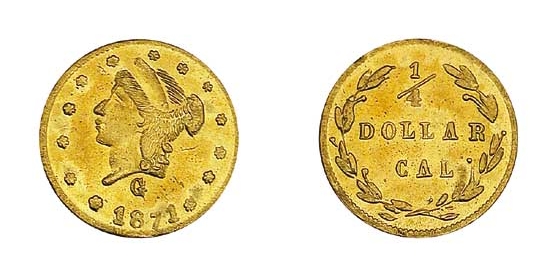 The 1871 BG-840 25 Cents falls into 'Period Two' (1859-1882) of California Fractional Gold production, a fascinating era that transitioned from practical necessity to commercial enterprise. The initial gold rush coinage shortage had largely been resolved by the establishment of the San Francisco Mint in 1854. However, a persistent lack of small-denomination silver coinage, combined with a burgeoning market for curiosities and souvenirs, created a new purpose for these minuscule gold pieces. Jewelers and private minters, many of French origin, stepped in to fill this niche. These 'jewelers' issues' were no longer primarily intended to facilitate commerce, but rather to be sold as keepsakes, charms, and mementos of the California Gold Rush. Unlike the earlier Period One issues, which often contained gold value close to their face value, Period Two pieces were significantly lighter and produced for profit. The Coinage Act of 1864 made private currency illegal, but production continued, skirting the law by technically being 'tokens' rather than coins. The public, both locally and back East, was captivated by these tiny gold pieces, which could be easily mailed as affordable gifts. The BG-840 variety, with its classic Liberty Head motif mimicking official U.S. coinage, was a popular design. It represents a mature phase in the fractional gold series, where established designs were struck in large quantities to meet a steady demand for souvenirs. This period eventually waned in the early 1880s after increased scrutiny from the Secret Service, who saw the continued production of denominated tokens as a violation of federal law, leading manufacturers to switch to non-denominated issues.