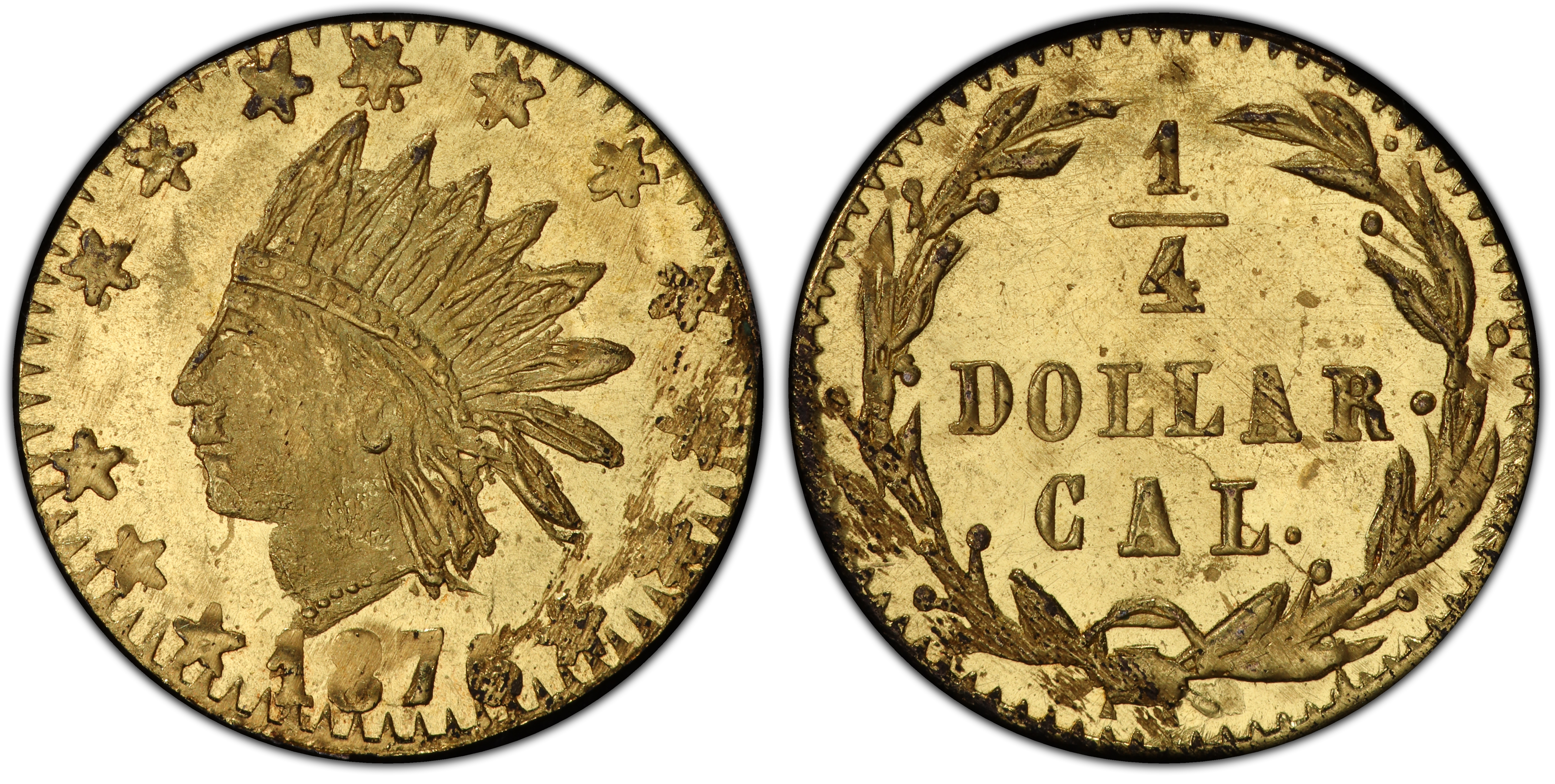 Reverse DescriptionThe denomination '1/4' is centrally located within a decorative wreath. The inscription 'CALIFORNIA GOLD' encircles the wreath, sometimes abbreviated.