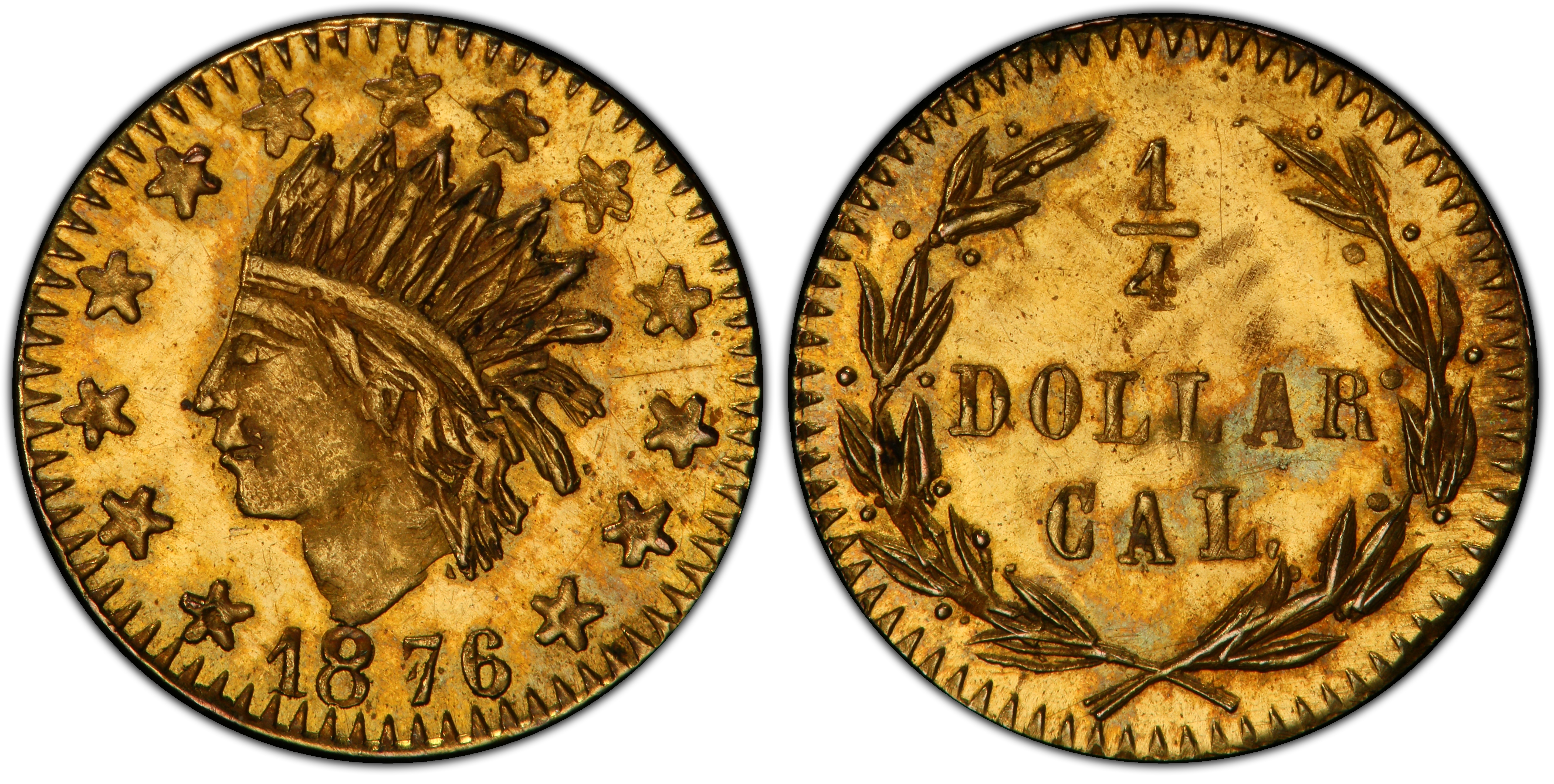 The BG-850 is highly prized for its extreme rarity (Low R-6), its connection to the historic California Gold Rush era, and its specific issuance during the 1876 U.S. Centennial year. Its miniature size and intricate design make it a classic example of the popular Indian Head 'jeweler's issues'.