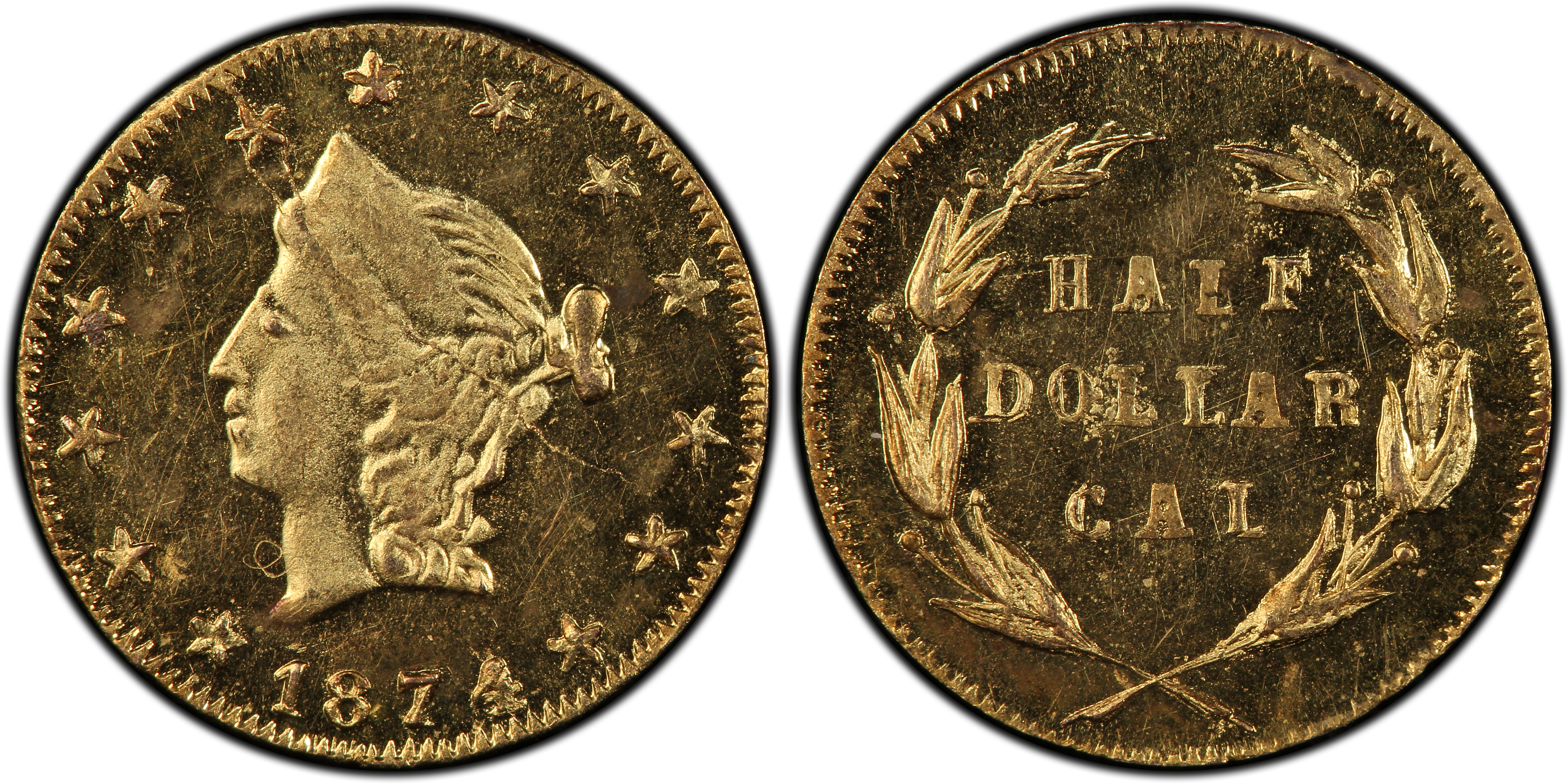 Reverse DescriptionA wreath composed of two branches tied with a bow at the bottom. The denomination '50 CENTS' is inscribed within the wreath. Unlike some other varieties, there is no external 'CALIFORNIA GOLD' legend on the reverse.