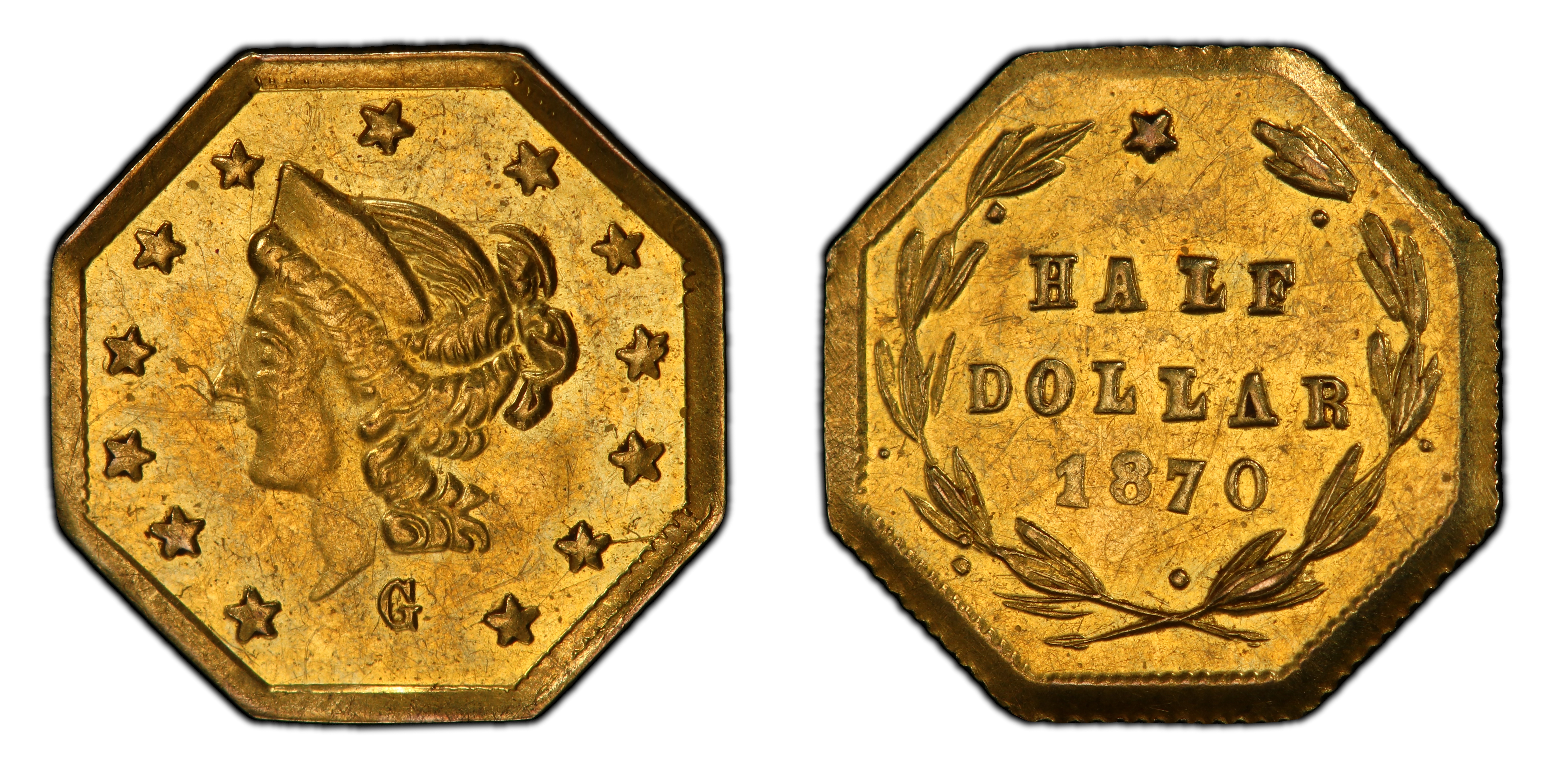 The 1870 G50C, cataloged as Breen-Gillio 921, is a quintessential example of a 'Period Two' California Fractional Gold piece. By 1870, the initial, desperate need for small circulating coinage that characterized the Gold Rush's peak in the early 1850s had largely subsided. The San Francisco Mint was in full operation, producing ample federal coinage for commerce. The continued production of these tiny, privately-issued gold pieces shifted from a primarily monetary function to that of a commercial novelty. They were created and sold by jewelers as souvenirs, keepsakes, and curiosities for tourists and locals enchanted by the romance of the Gold Rush. This period, from 1858 to 1882, is often termed the 'Jeweler's Issue' era. Unlike the earlier 'Period One' issues, which were struck with a pretense of conforming to federal weight standards, these later pieces were notoriously underweight for their stated value, containing far less than fifty cents worth of gold. The minter, Robert B. Gray & Co. of San Francisco, was a prolific producer during this time, having acquired the business and dies of another prominent jeweler, Antoine Nouizillet, around 1859. The BG-921 is a distinct product of Gray's own dies, though it notably lacks the 'G' mintmark often seen on his other issues. These pieces were typically manufactured using the 'hammer method,' where a planchet was placed on a bottom die and struck with a sledgehammer-wielded top die, resulting in frequent inconsistencies in strike quality. The passage of the Private Coinage Act of 1864 made such private issues illegal, but enforcement by the Secret Service was lax until the early 1880s, allowing firms like Robert B. Gray & Co. to continue their profitable enterprise. Today, the BG-921 is not just a relic of the Gold Rush, but a tangible link to the post-Rush period of romanticism and commercialization of the West.