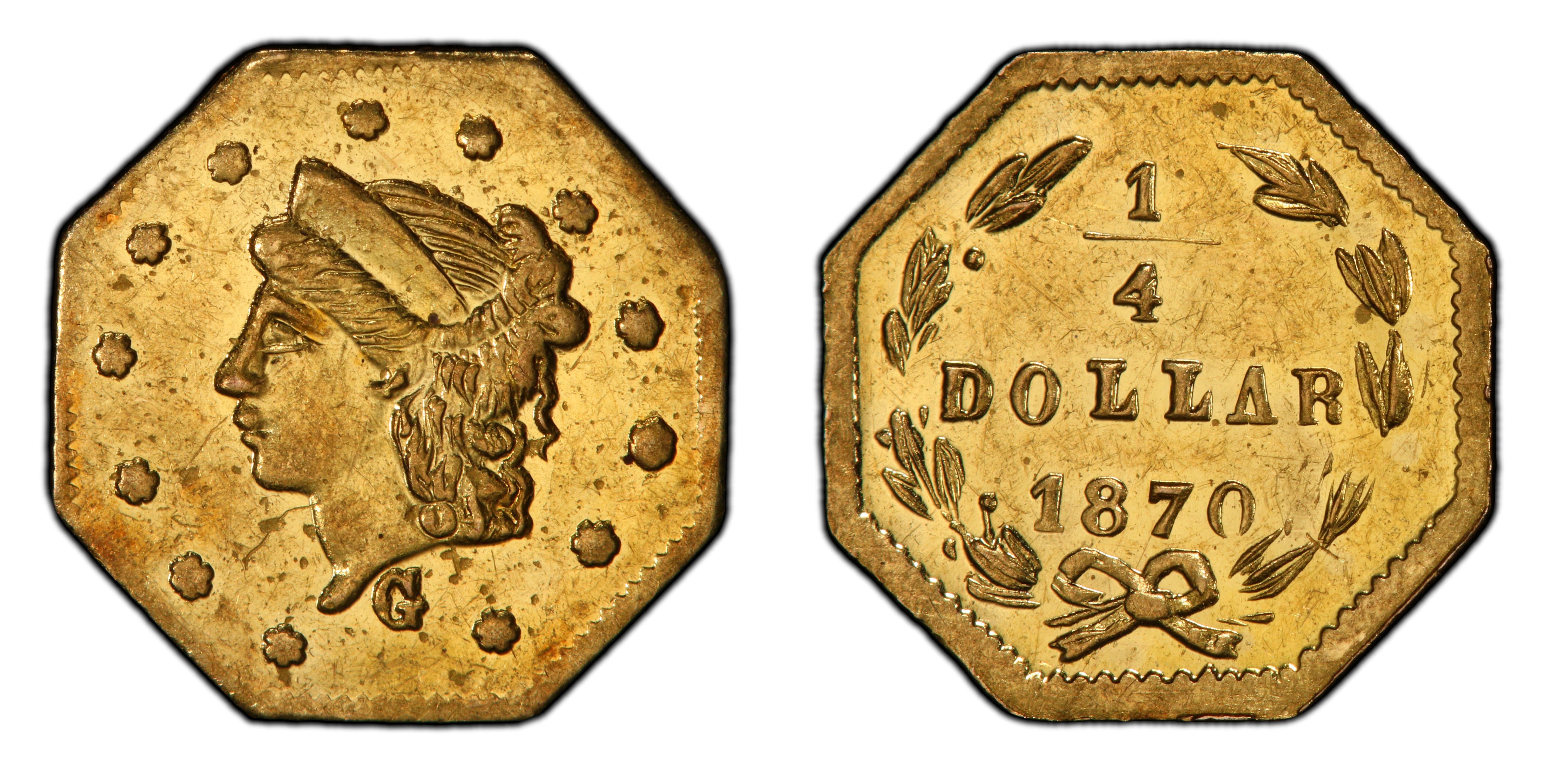 The 1870 octagonal 25-cent piece, cataloged as Breen-Gillio 755, emerges from the second major phase of California's private gold coinage. Unlike the 'Period One' issues (1852-1857), which were struck out of a genuine necessity to alleviate a critical shortage of small change during the initial Gold Rush boom, these 'Period Two' (1859-1882) pieces served a different purpose. By 1870, the San Francisco Mint was in full operation, producing ample federal coinage for commerce. The rationale for producing these minuscule gold pieces had shifted from utility to novelty. They were primarily created as souvenirs and keepsakes for tourists, merchants, and those wishing to send a small, tangible piece of the California dream back east. The minters, often jewelers by trade, walked a fine legal line. The Coinage Act of 1864 had explicitly forbidden private coinage, but enforcement was lax until the early 1880s. To circumvent the law, these pieces were often intentionally struck underweight relative to their face value, technically making them tokens rather than coins intended to circulate at par. The BG-755, attributed to Robert B. Gray & Co. of San Francisco, is a quintessential example of this 'jeweler's issue.' The use of a dated obverse, mimicking federal coinage with its Liberty head and stars, was a marketing tactic designed to enhance their appeal as legitimate-looking miniature coins. The quality of manufacture varied wildly during this period. Many, like the BG-755, were crudely struck by hand-hammering, resulting in poorly defined details and irregular planchets. Their survival in any condition is remarkable, and their modern numismatic significance lies in their direct connection to the romantic, albeit fading, legacy of the Gold Rush and the entrepreneurial spirit of the jewelers who supplied a burgeoning souvenir market.