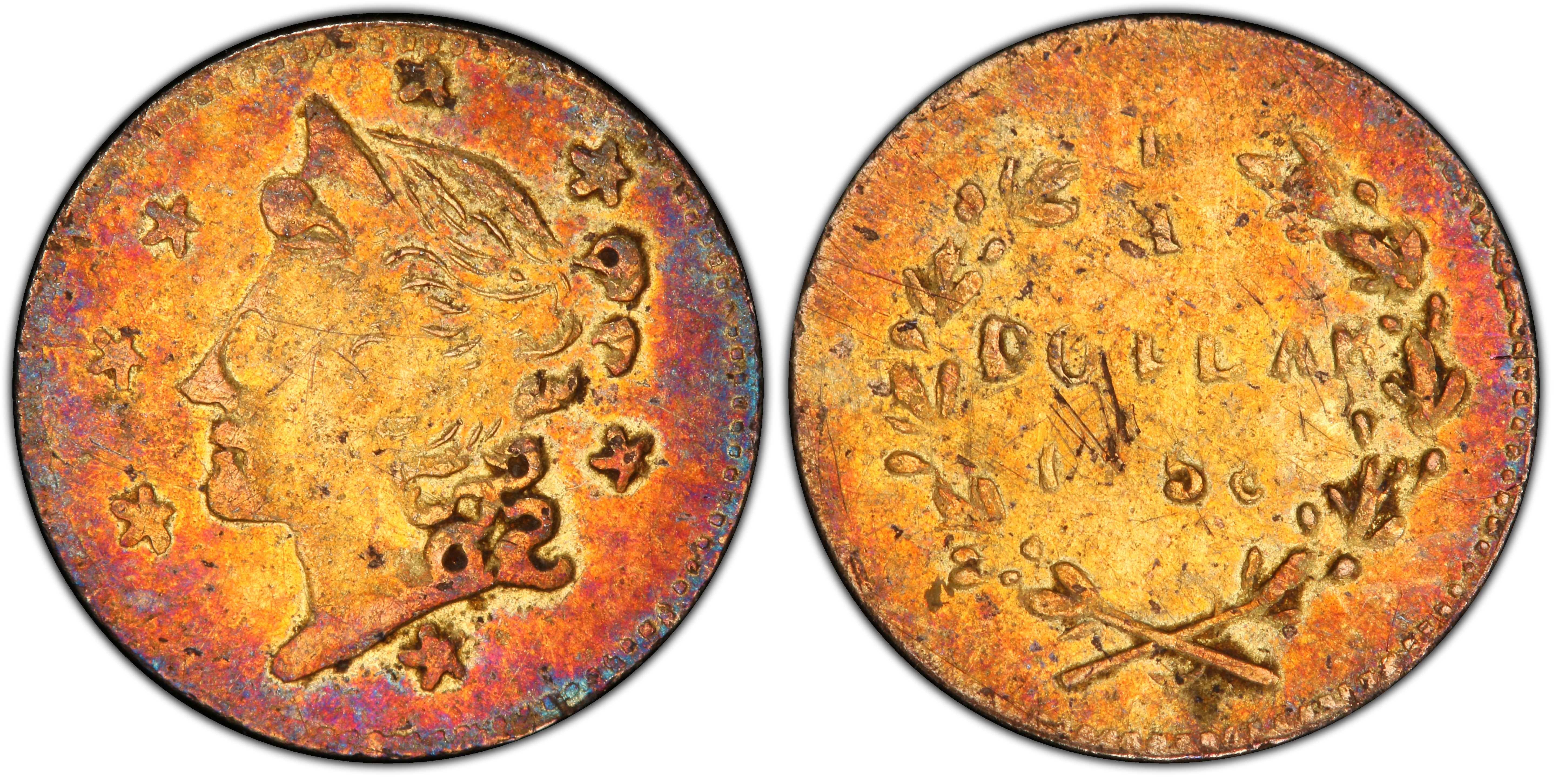Obverse DescriptionLiberty Head, facing left, likely surrounded by 13 stars, with the date 1858 below. The style of Period Two Liberty heads can vary significantly from the official U.S. Mint designs, often appearing more stylized or crudely engraved.