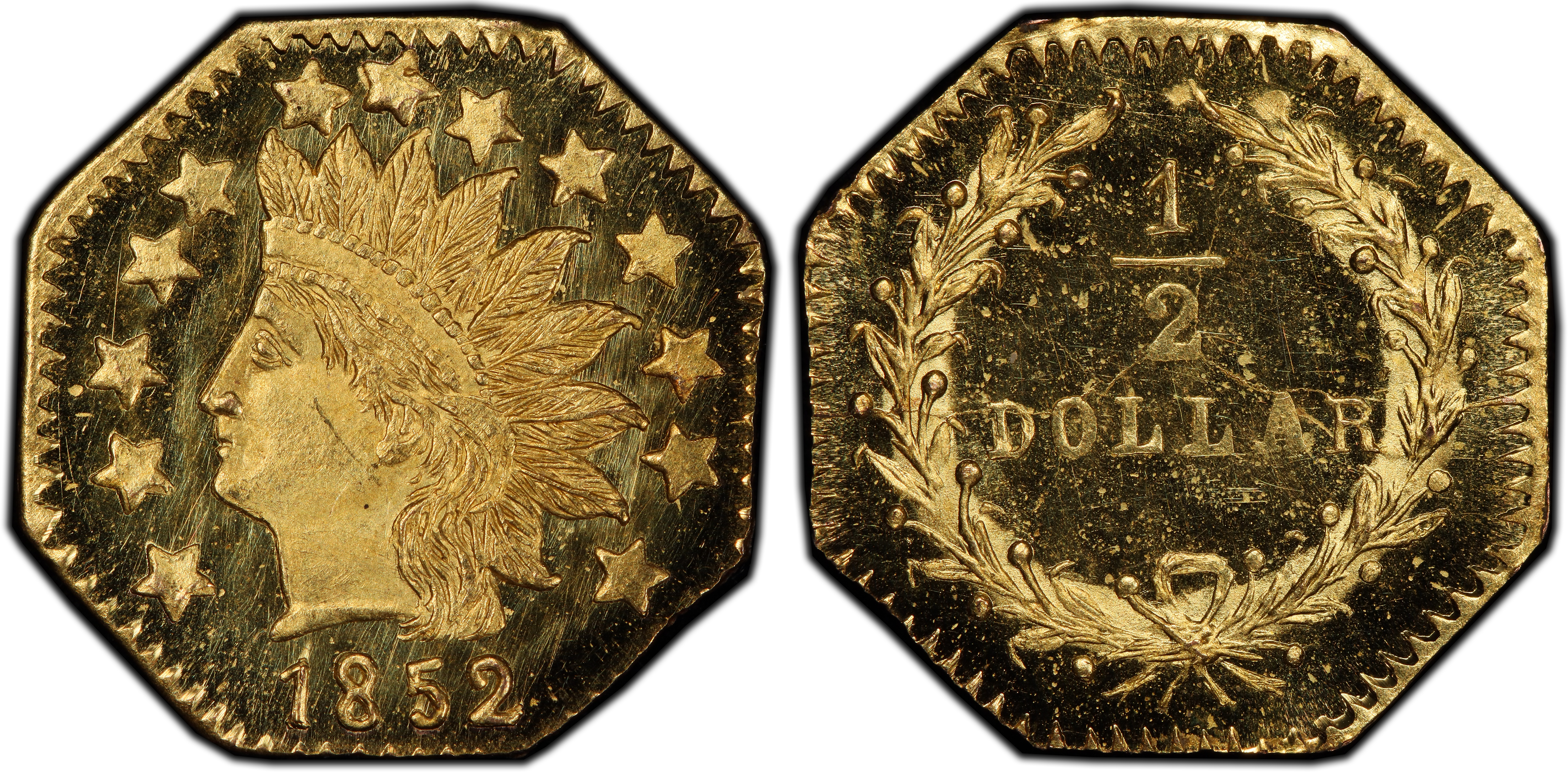 Obverse DescriptionAn octagonal planchet featuring a stylized bust of a Native American (often referred to as an 'Indian Head') facing left. The portrait is typically crudely engraved, surrounded by thirteen stars of varying quality and placement. The date '1852' appears below the bust.
