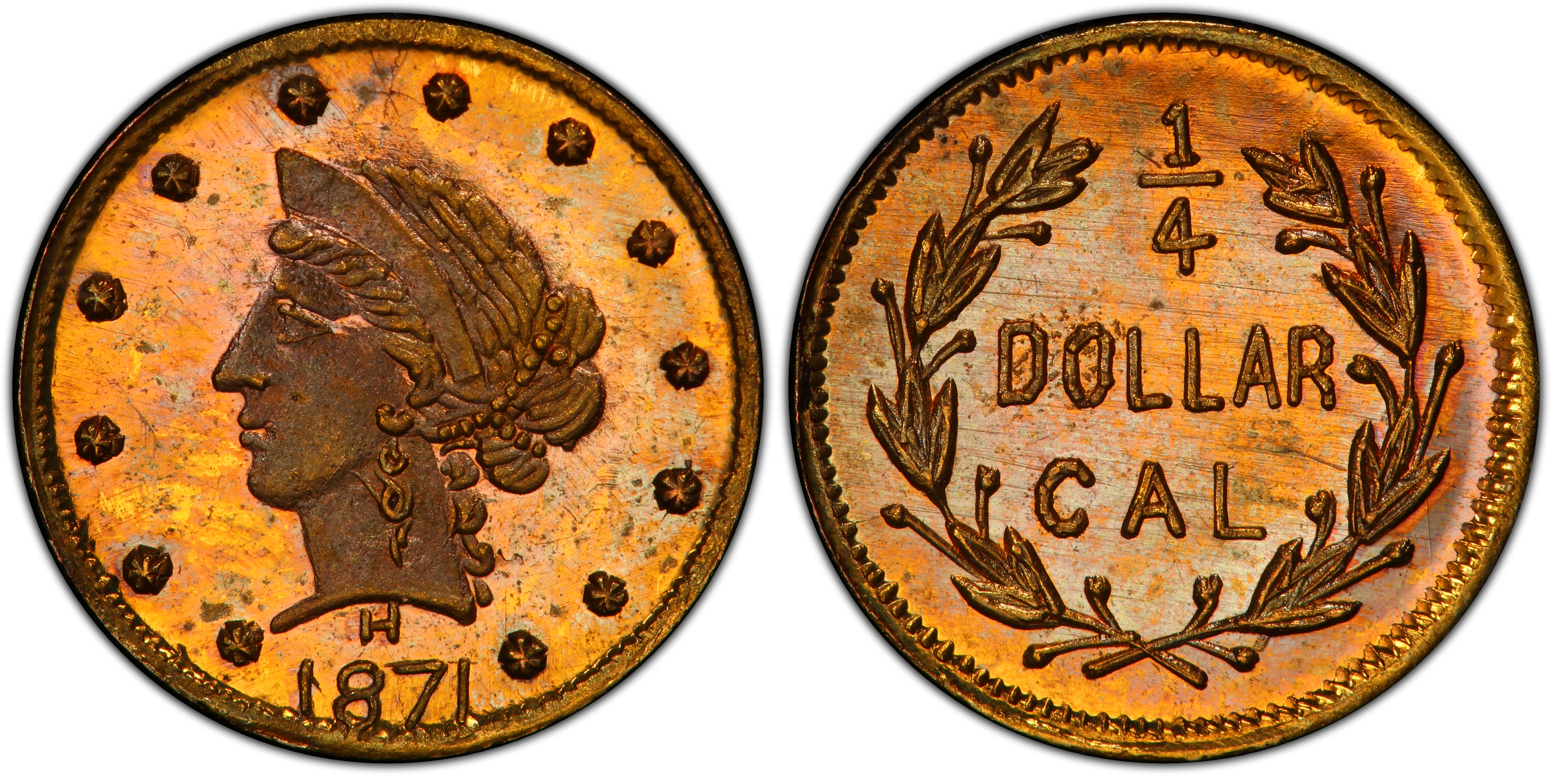 The 1871 G25C BG-860 is a product of the second phase of California Fractional Gold production, a fascinating and complex chapter in American numismatics. The initial period (Period One, 1852-1857) was born of necessity. The massive influx of population during the Gold Rush created a thriving economy, but the United States Mint in San Francisco, which opened in 1854, could not produce enough small denomination coinage to satisfy commercial demand. Local jewelers and metallurgists stepped into the void, striking quarter dollar, half dollar, and dollar pieces from native gold to facilitate everyday transactions. These early issues, while unofficial, were generally of good weight and served a genuine monetary purpose. By the 1860s, however, the San Francisco Mint had largely resolved the small-change crisis. The impetus for private gold coinage shifted from commerce to collectibility. This second era (Period Two, 1858-1882) saw jewelers creating these miniature gold pieces primarily as souvenirs and for use in jewelry. The 1871 BG-860 is a quintessential example of these 'jeweler's issues.' Struck by the firm of Robert B. Gray & Co. in San Francisco, it was intended for tourists and locals who wanted a memento of the Gold Rush, not for buying goods at the general store. The passage of the Private Coinage Act of 1864 had made such private issues illegal, but the law was not strictly enforced against these small, low-value tokens until the Secret Service cracked down in the early 1880s. This legal gray area allowed firms like Gray's to flourish. These Period Two pieces are often characterized by more fanciful designs and a greater variety of motifs compared to their utilitarian predecessors. Because they were sold as keepsakes, they were not subjected to the rigors of circulation, which is why a relatively high proportion of the surviving population exists in Mint State condition. The BG-860, with its classic Liberty Head design, represents a tangible link to the romantic memory of the Gold Rush, crafted decades after its peak for a new generation captivated by its lore.