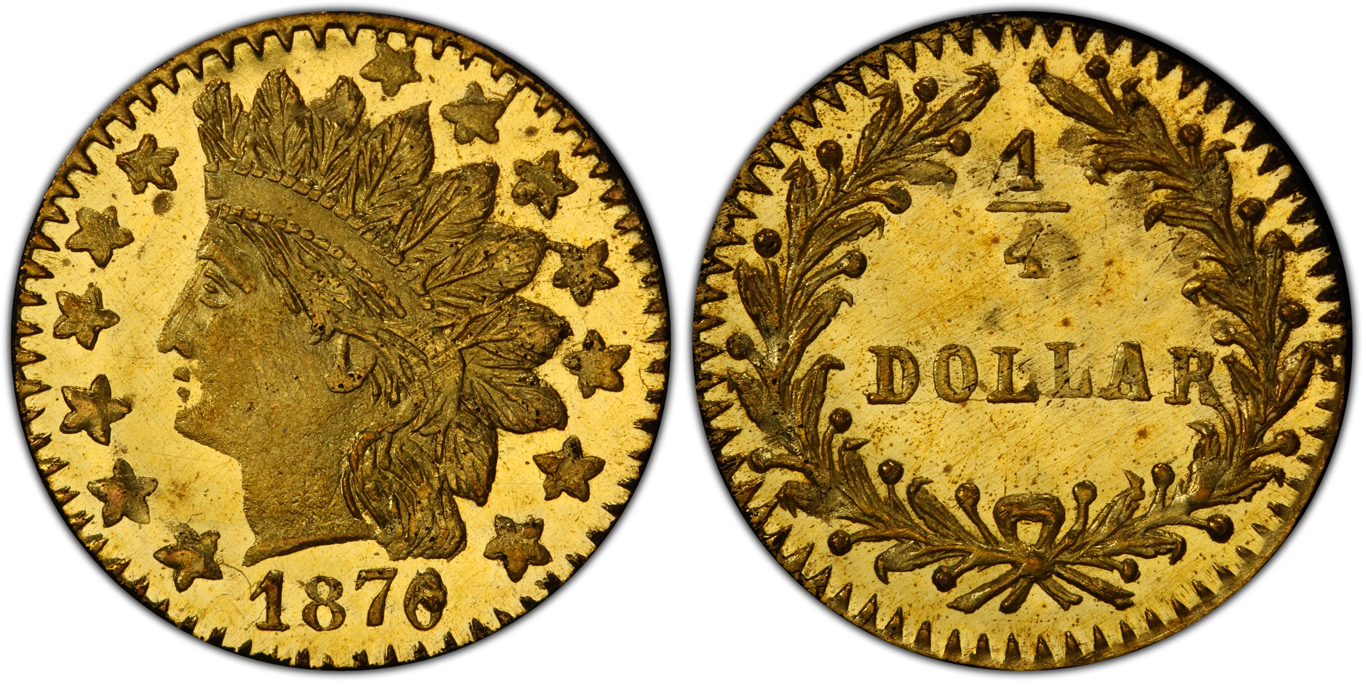 Reverse DescriptionThe denomination '1/4' is centered within a wreath composed of two olive branches. The wreath is open at the top and tied with a bow at the bottom. The legend 'CALIFORNIA GOLD' is inscribed in an arc around the wreath, separated by the top of the wreath.