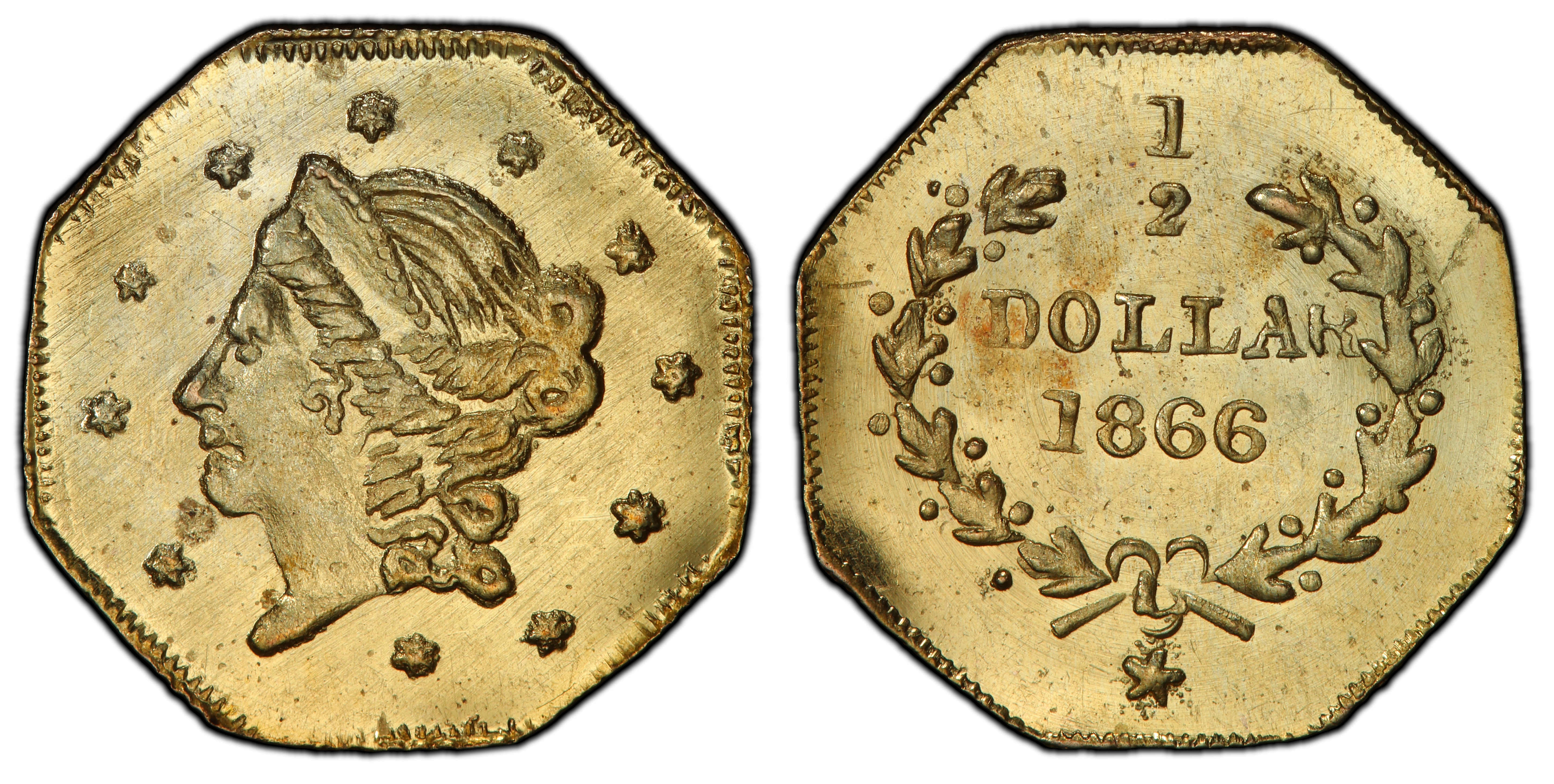 The 1866 Octagonal Liberty Head 50 Cents, cataloged as Breen-Gillio 903, is a quintessential artifact from the second period of California's private gold coining era. The initial California Gold Rush of 1849 created an immediate and severe shortage of small-denomination coinage for everyday transactions. While the San Francisco Mint began operations in 1854, it focused on larger denominations, leaving a commercial vacuum that private minters, often jewelers, rushed to fill. Early fractional gold pieces from 1852-1856 closely mimicked federal designs and were intended to circulate widely. However, the U.S. government's Coinage Act of 1864 officially outlawed private coinage, fundamentally changing the nature of these pieces. The BG-903, struck two years after this act, belongs to a fascinating 'Period Two' (1859-1882) of production. During this time, the pieces became lighter and their legal status ambiguous. They were no longer true circulating currency in the legal sense but continued to be produced and used, often as souvenirs, keepsakes for tourists, or perhaps as novelties in isolated local economies where federal coinage remained scarce. The minters, like Frontier & Co., operated in a grey area of the law. These 'jeweler's issues' were typically made with less precision than official coinage, often by the 'hammer method' where dies were struck manually, resulting in significant variations in strike quality. The BG-903's octagonal shape and Liberty Head design were classic motifs intended to evoke a sense of legitimacy and connection to the national currency. Despite their technically illegal status, their continued production speaks to a persistent demand and the independent spirit of the American West. Today, these tiny gold pieces are not just numismatic rarities but tangible links to the post-Gold Rush economic landscape of California, representing the transition from a frontier economy to a more integrated part of the nation.