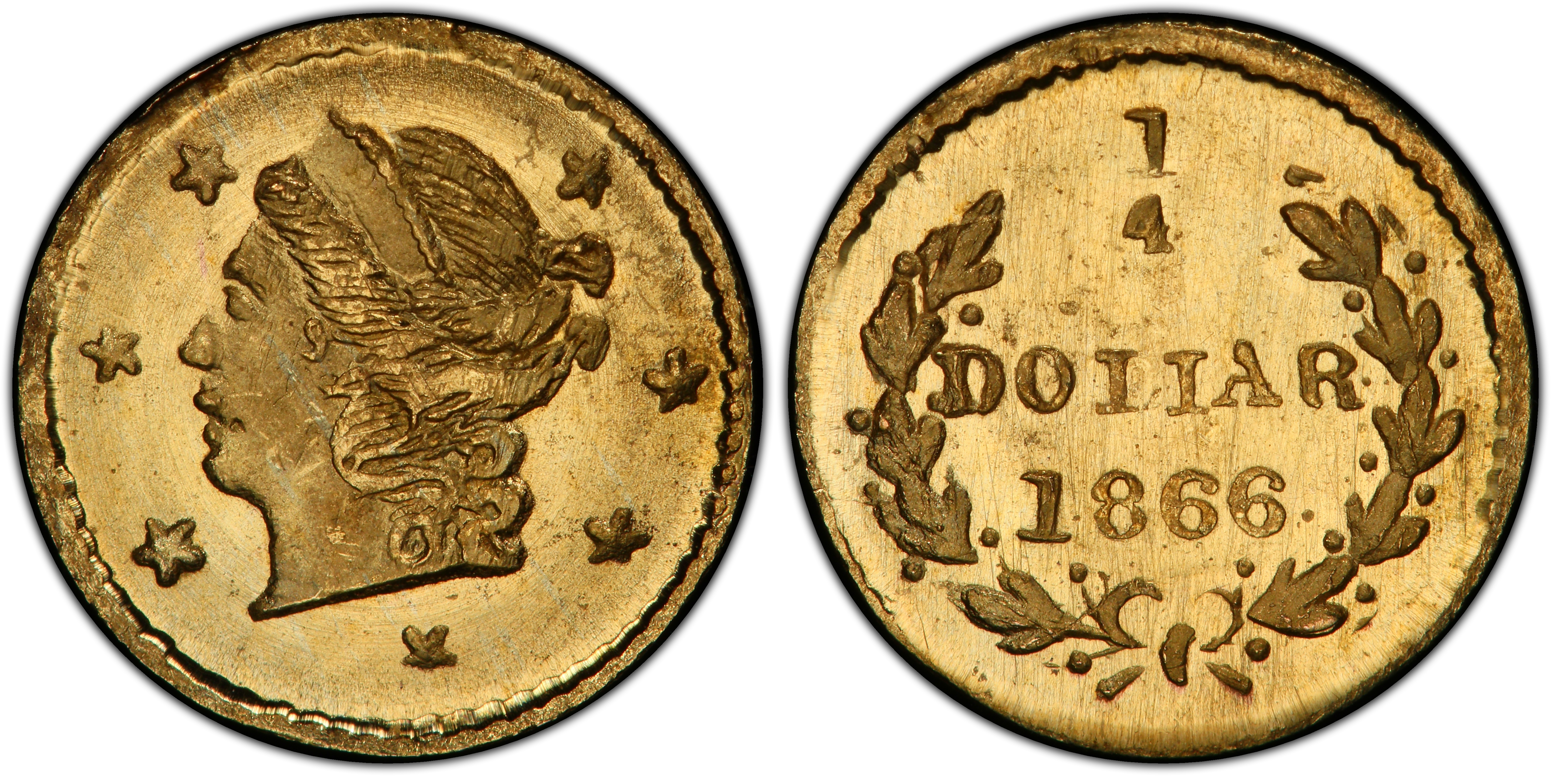 Reverse DescriptionThe denomination '25 CENTS' is enclosed within a wreath of two olive branches tied with a bow at the bottom. Above the denomination and inside the wreath is the date '1866'. The legend 'CALIFORNIA GOLD' appears along the upper periphery, outside the wreath.