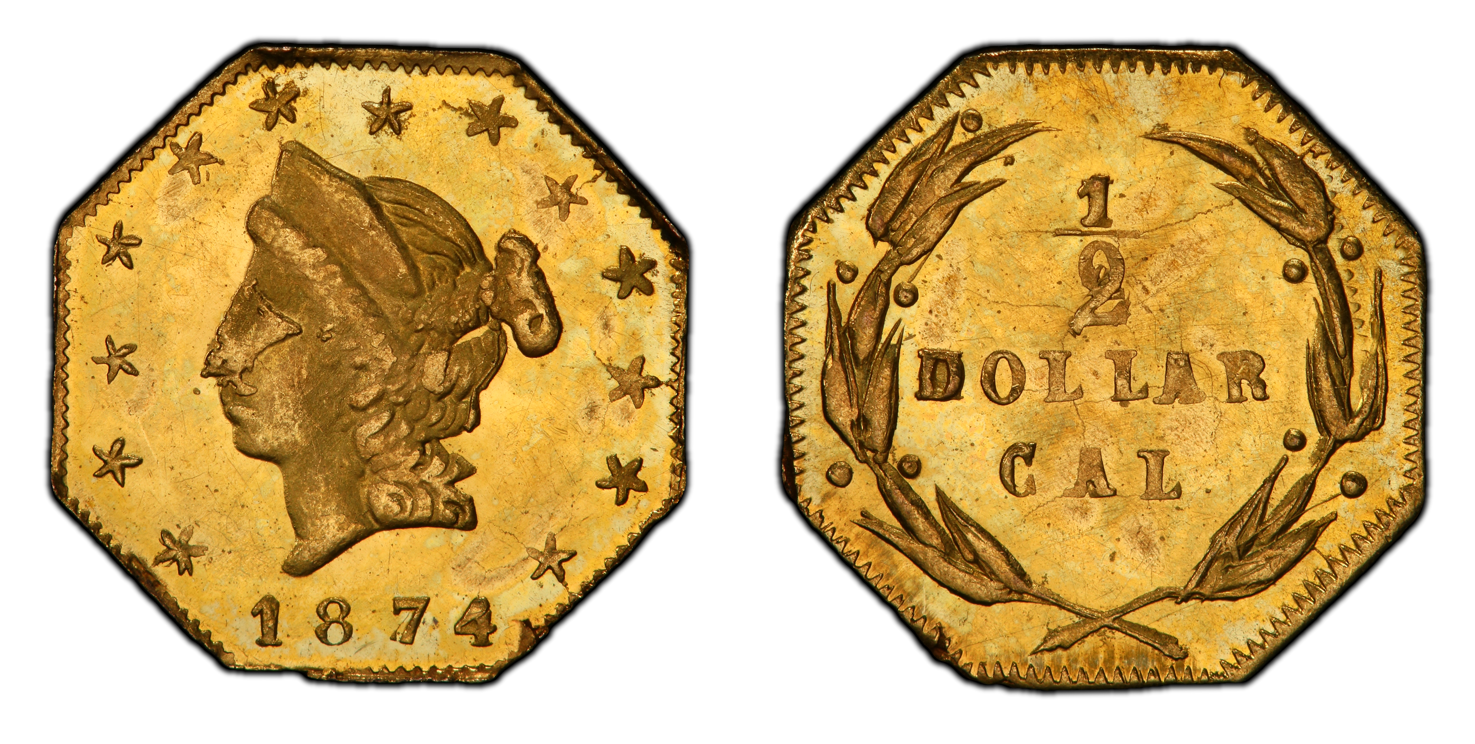 Obverse DescriptionA rendition of the Liberty Head, facing left, with hair tied in a bun. The portrait is encircled by 13 six-pointed stars. The date, 1874, is positioned below the truncation of the neck. The overall style is a crude imitation of the federal gold coinage of the era.