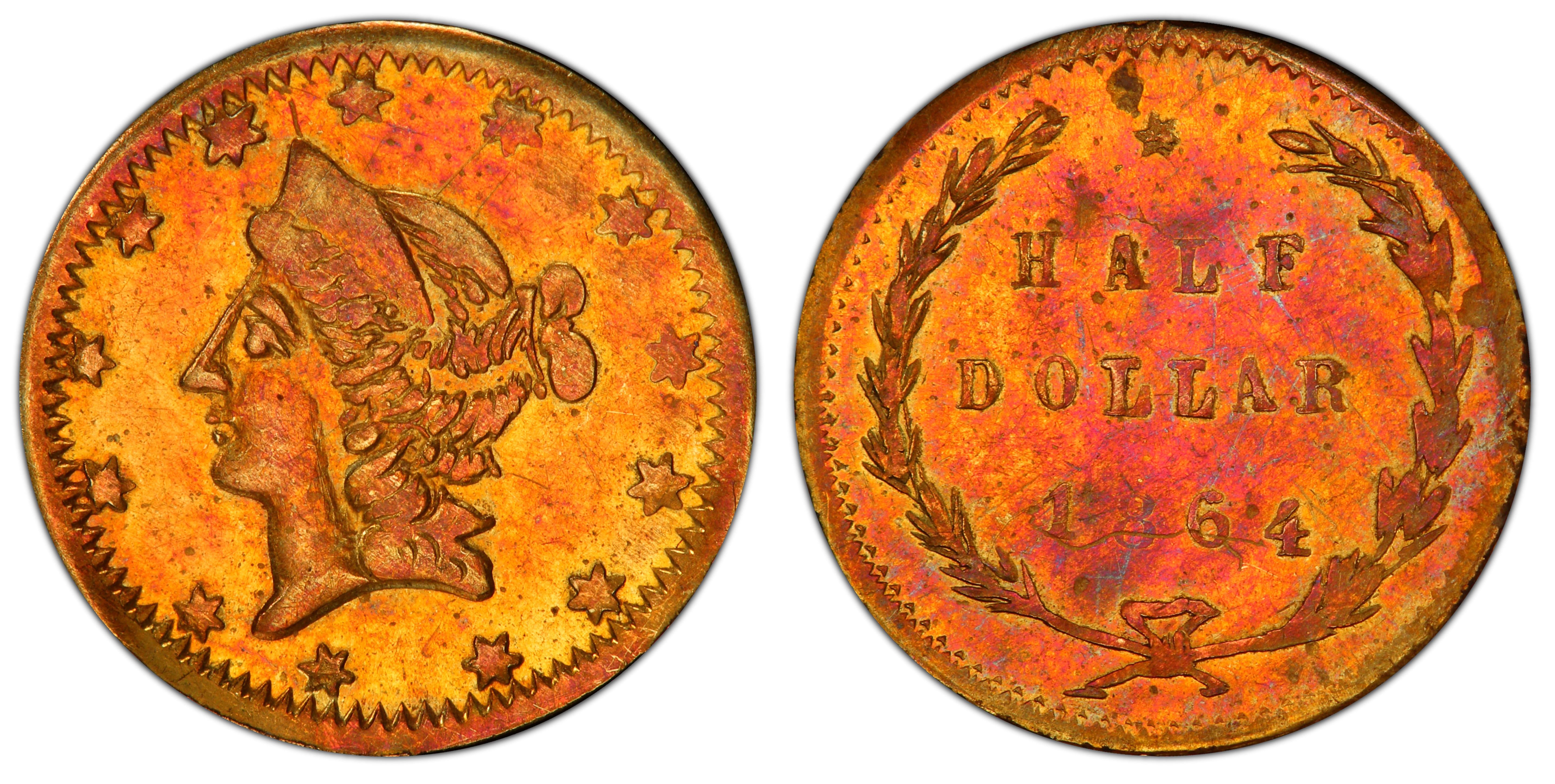 Reverse DescriptionThe reverse displays the denomination '50 CENTS' within a beaded circle. The date '1864' is positioned below the denomination, also within the circle. The legend 'CALIFORNIA GOLD' encircles the design along the outer rim.
