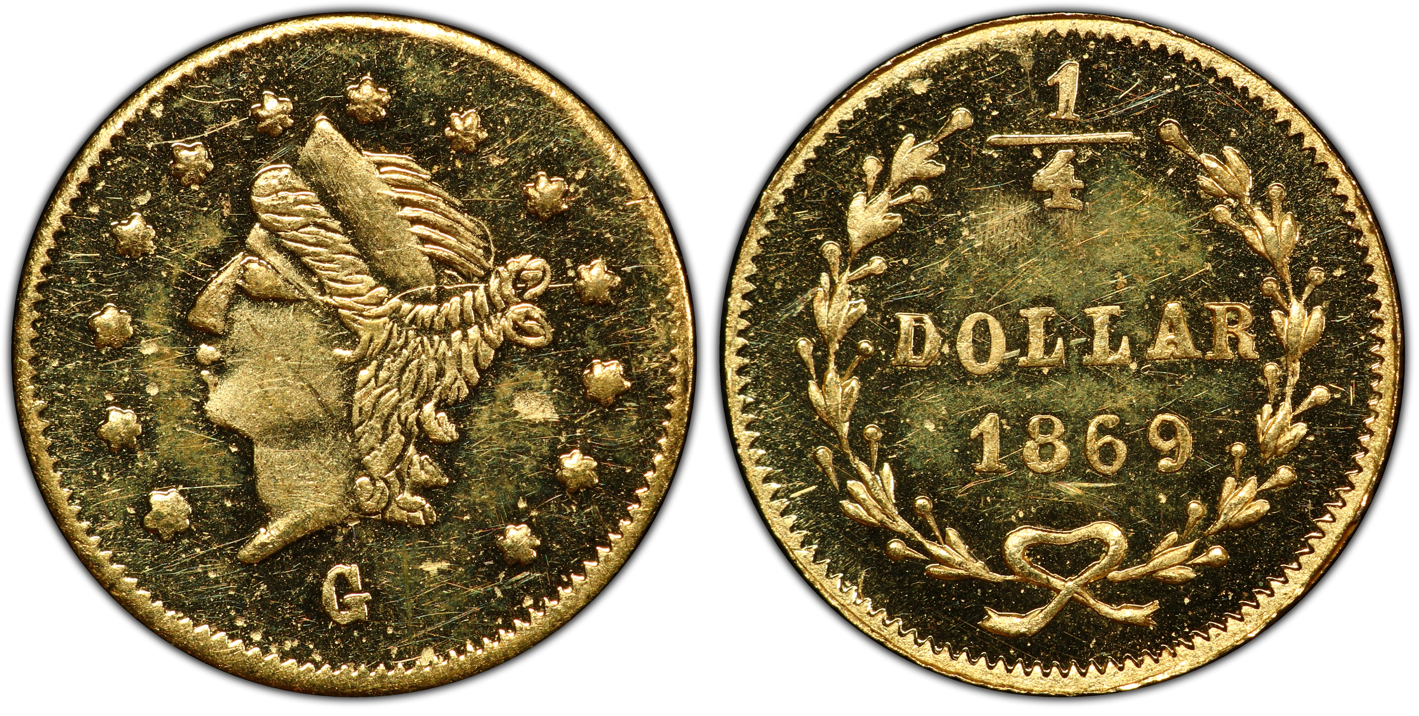 Reverse DescriptionA beaded border surrounds a wreath composed of two olive branches tied at the bottom with a ribbon. The denomination '1/4' and the word 'DOLLAR' are centrally located within the wreath. The date '1869' is positioned below the wreath, just above the lower border.