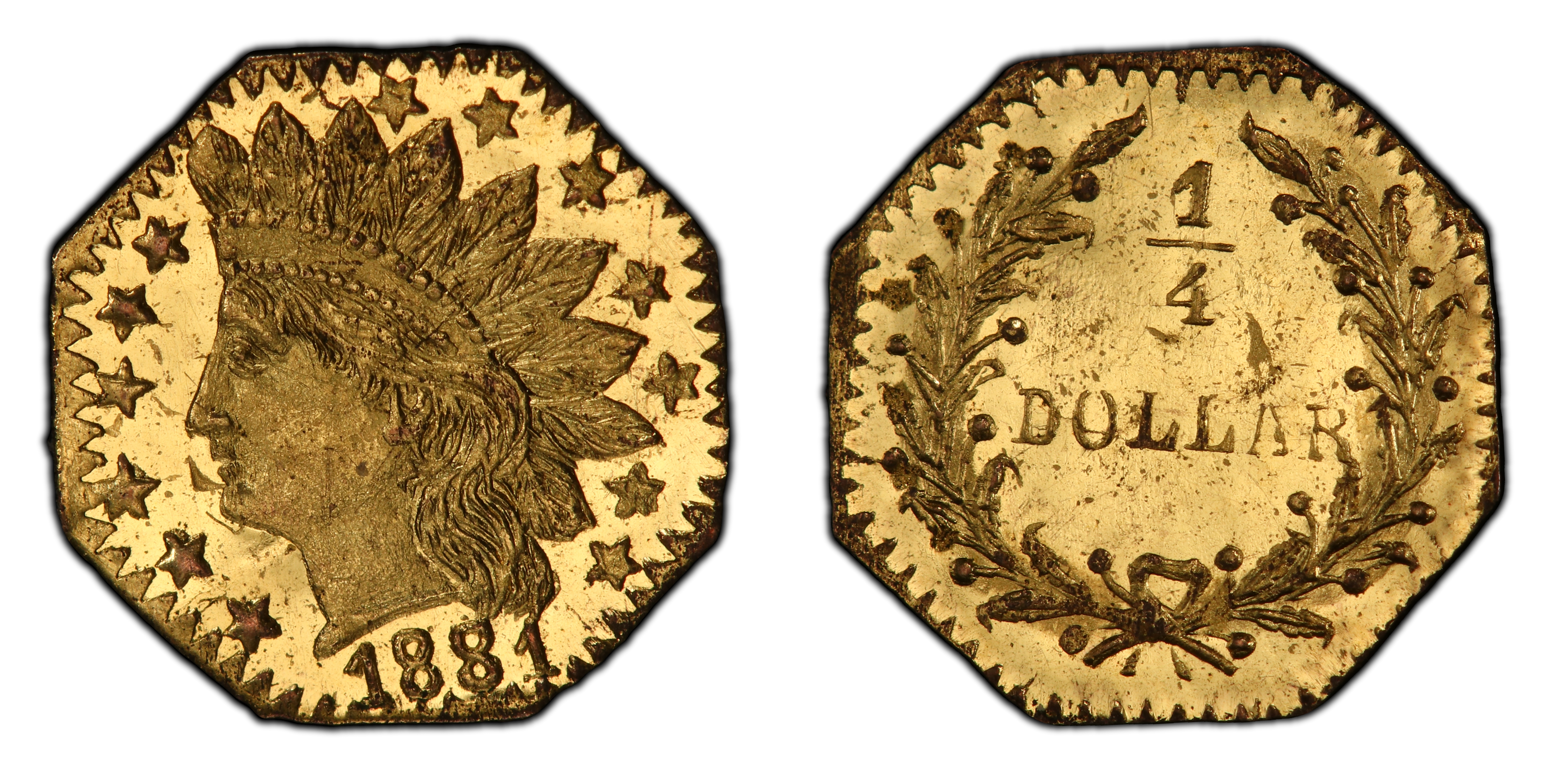 The 1881 25 Cents BG-799M represents the final evolution of a uniquely Californian numismatic tradition. Born from the acute shortage of small denomination coinage during the Gold Rush, the earliest fractional gold pieces of 1852-1856 ('Period One') served a vital, albeit unofficial, role in commerce. These were followed by 'Period Two' pieces (1856-1882), which emerged after federal legislation in 1864 criminalized private coinage intended for circulation. The manufacturers of Period Two coins, including this 1881 issue, cleverly circumvented the law by slightly altering the designs, often omitting the word 'DOLLAR' or 'D.' and denominating them as '1/4 ARM' or simply '1/4'. Consequently, these later pieces were not intended to circulate as money in the traditional sense but were marketed as souvenirs, keepsakes, and jewelry items for tourists and locals nostalgic for the Gold Rush era. By 1881, the wild days of the '49ers were a distant memory, but the allure of gold remained potent. San Francisco was a bustling metropolis, and a cottage industry of jewelers and novelty makers produced these miniature gold tokens to satisfy a thriving tourist trade. They were often sold in sets or mounted into pins, cufflinks, and other adornments. The technical production of these pieces had become quite refined, with standardized Liberty head and wreath motifs, often struck with a precision and sometimes proof-like finish that belied their unofficial status. The BG-799M, specifically, is a product of this late period, a testament to the enduring legacy of the Gold Rush and the clever entrepreneurship that adapted to changing legal landscapes. Its existence speaks to a market that valued the symbolism of California gold as much as its intrinsic worth, serving as a tangible memento of a transformative era in American history.