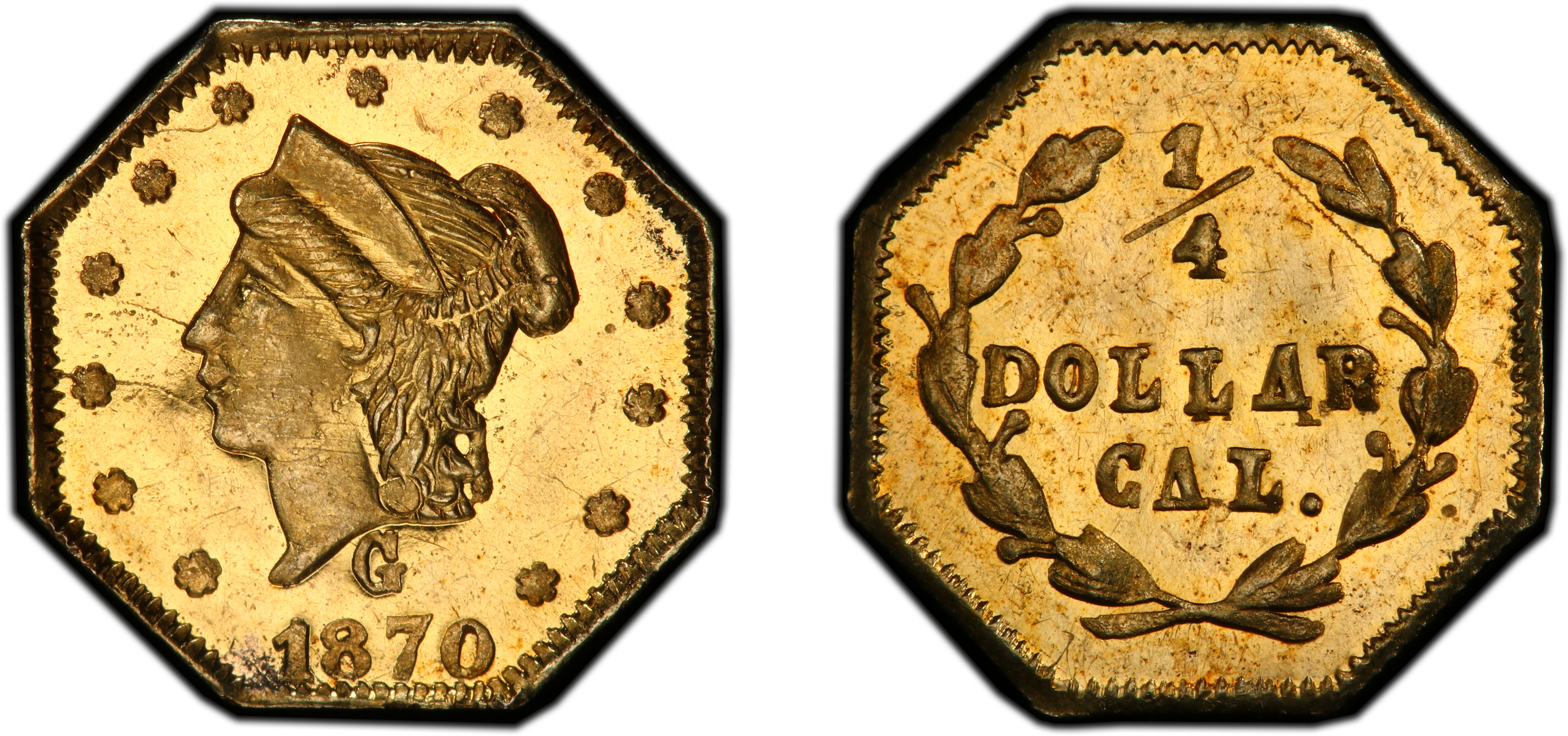 The 1870 G25C BG-756 is a quintessential example of a 'Period Two' California Fractional Gold piece. By 1870, the initial, urgent need for small denomination circulating currency that spurred the creation of 'Period One' (1852-1857) issues had largely subsided. The San Francisco Mint, operating since 1854, was producing sufficient federal coinage for daily commerce. Instead, the continued production of these miniature gold pieces shifted to a different market: tourism and collectibles. San Francisco was no longer just a rugged gold rush outpost but a burgeoning metropolis and a destination for travelers from the Eastern states and Europe. Jewelers and private minters, such as Robert B. Gray & Co., recognized the appeal of these tiny gold coins as keepsakes and souvenirs of the California adventure. Consequently, these 'jeweler's issues' were struck not with the intention of meeting a monetary need, but to be sold at a premium over their negligible intrinsic value. The Private Coinage Act of 1864 had made such private minting illegal, but the law was not strictly enforced by the Secret Service in California until 1883. This legal gray area allowed for a prolific output of hundreds of varieties throughout the 1860s and 1870s. The BG-756, like its contemporaries, was typically produced with less gold content than its stated face value would imply, a fact that was of little concern to a buyer seeking a memento. These pieces were often crudely struck by hand, leading to significant variation in strike quality. Their numismatic significance today lies not in their use as money, but as tangible artifacts of a transitional period in California's history, reflecting the commercialization of the Gold Rush legend itself.
